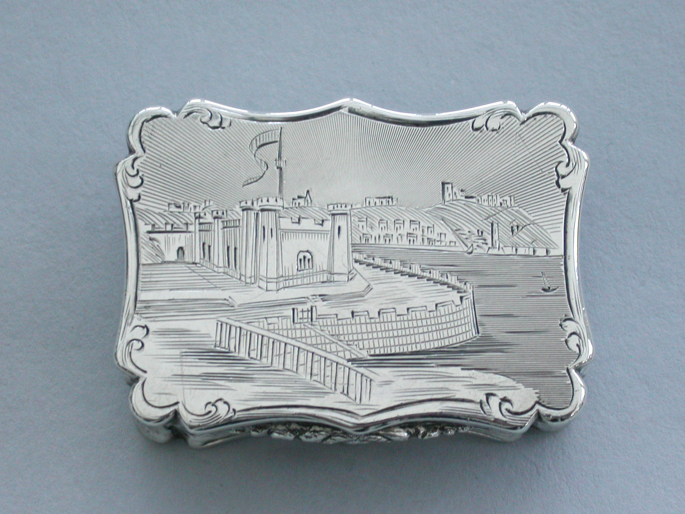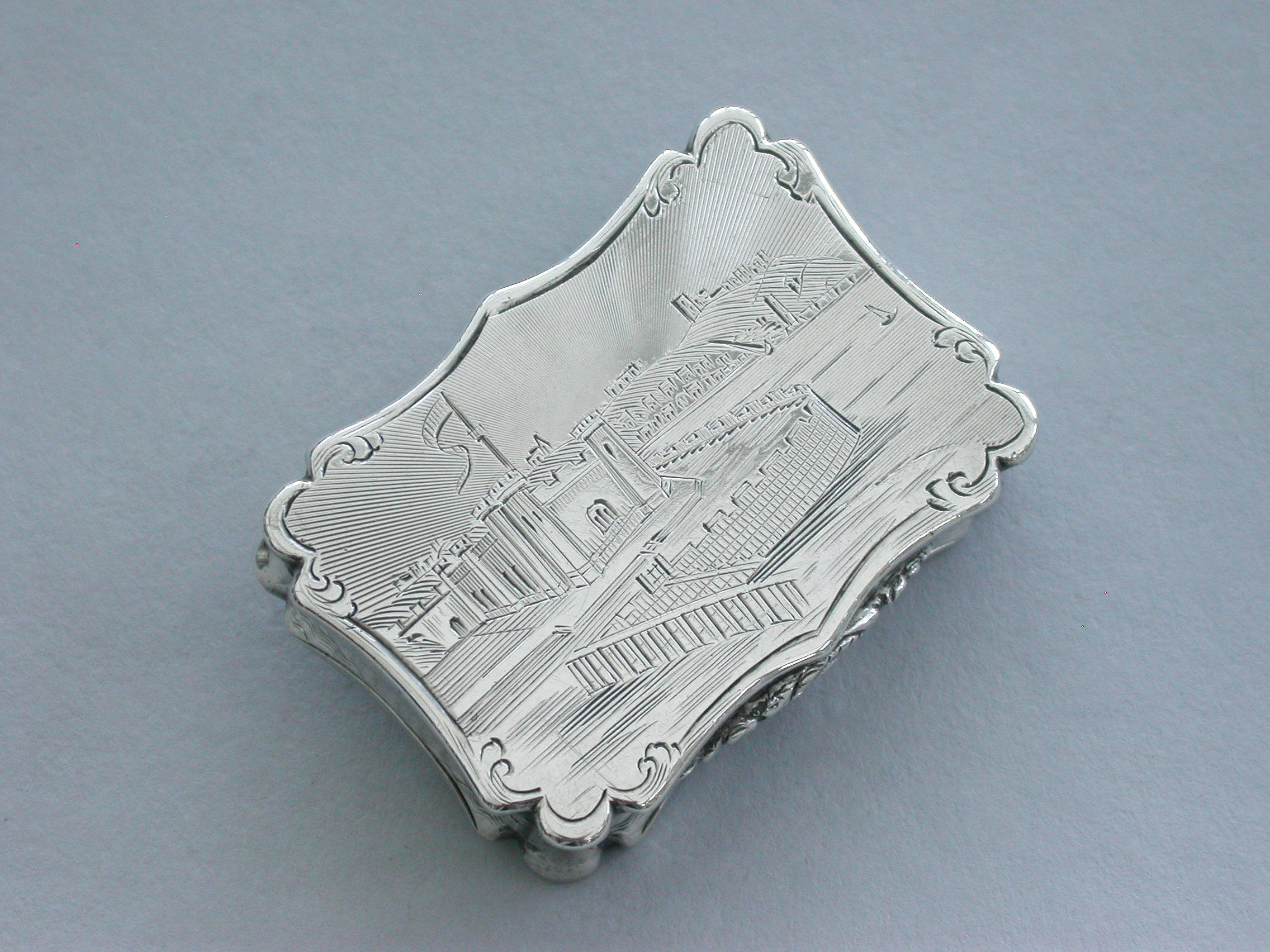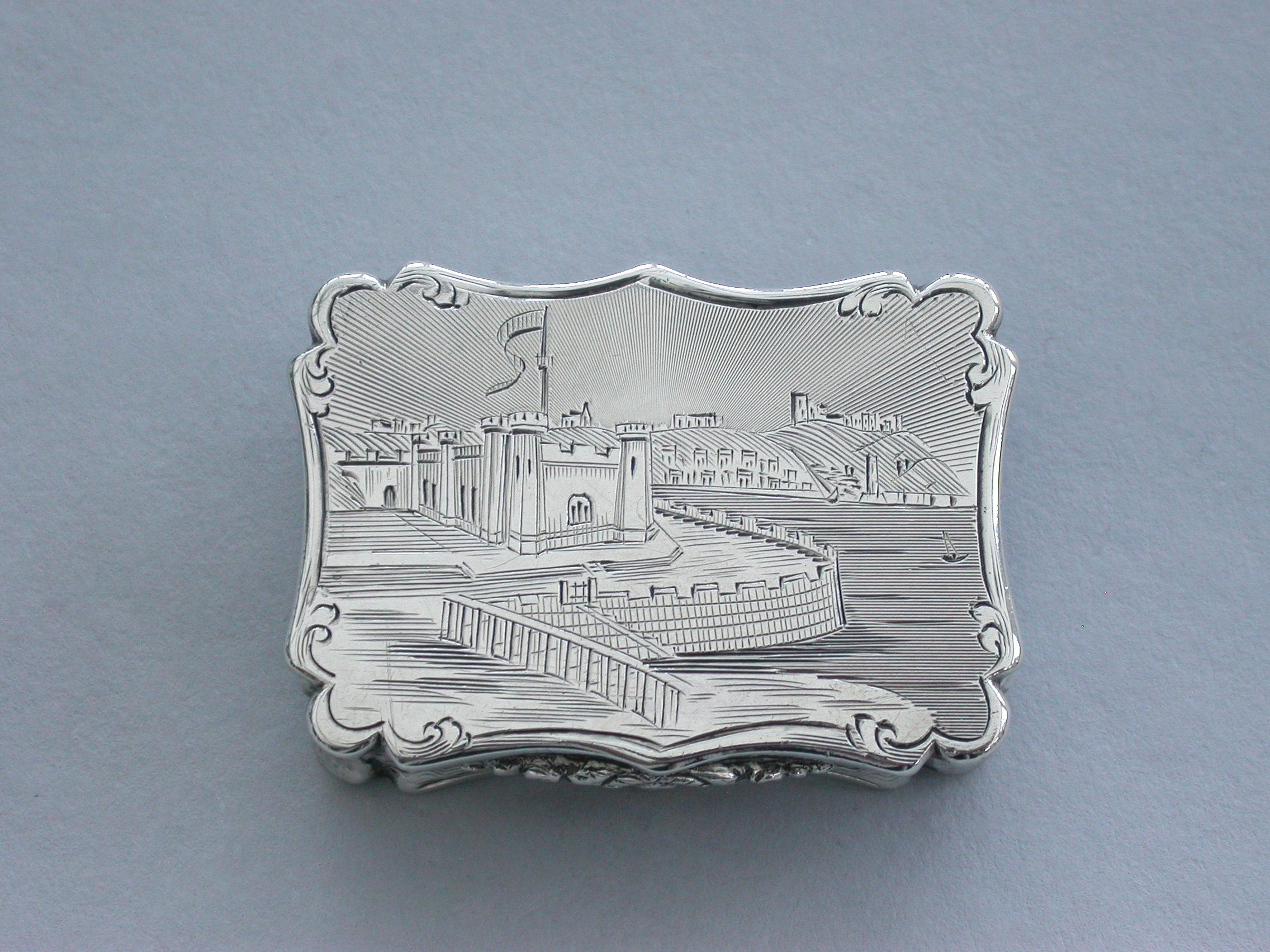 An extremely rare Victorian castle-top Vinaigrette of shaped rectangular form with bands of engine turned decoration surrounding a vacant cartouche to the base. The cover engraved with a scene depicting The Salon on the promenade at Scarborough with flag flying and the headland with Scarborough Castle beyond. Silver gilt grille pierced with folaite scrolls.