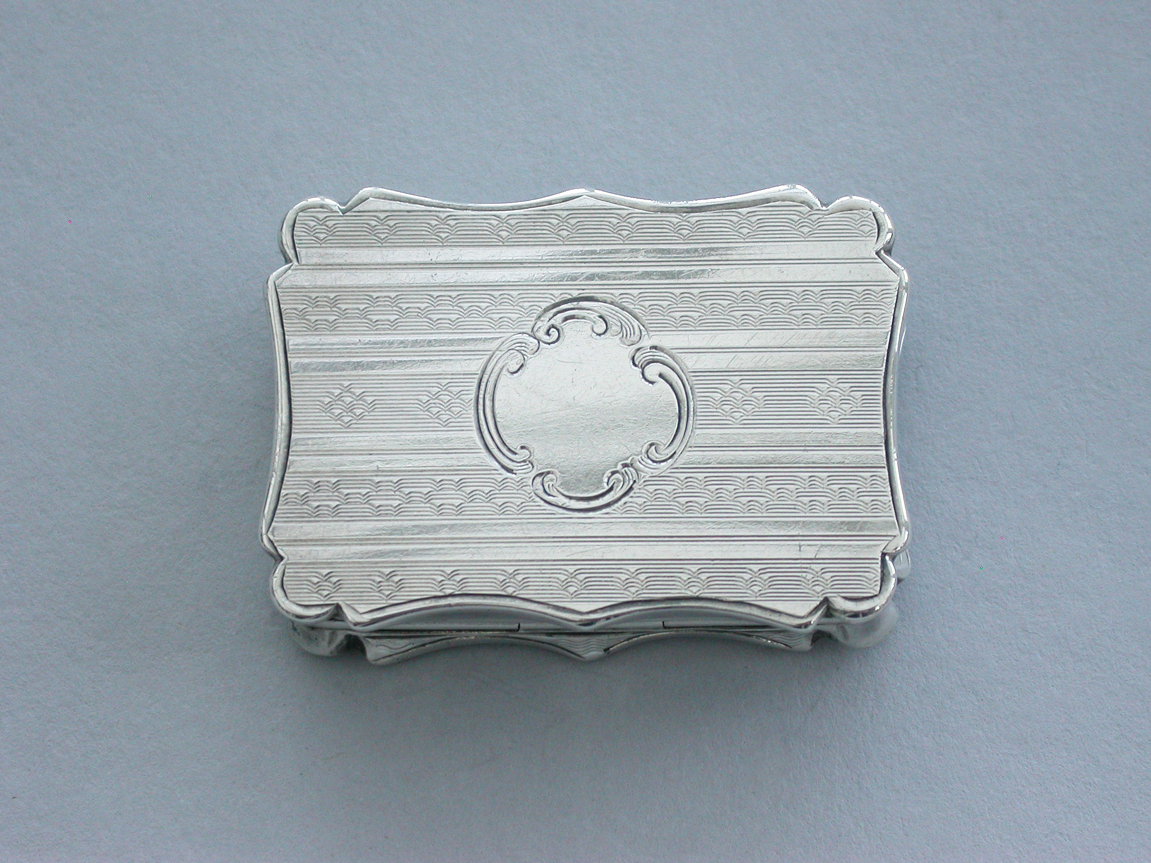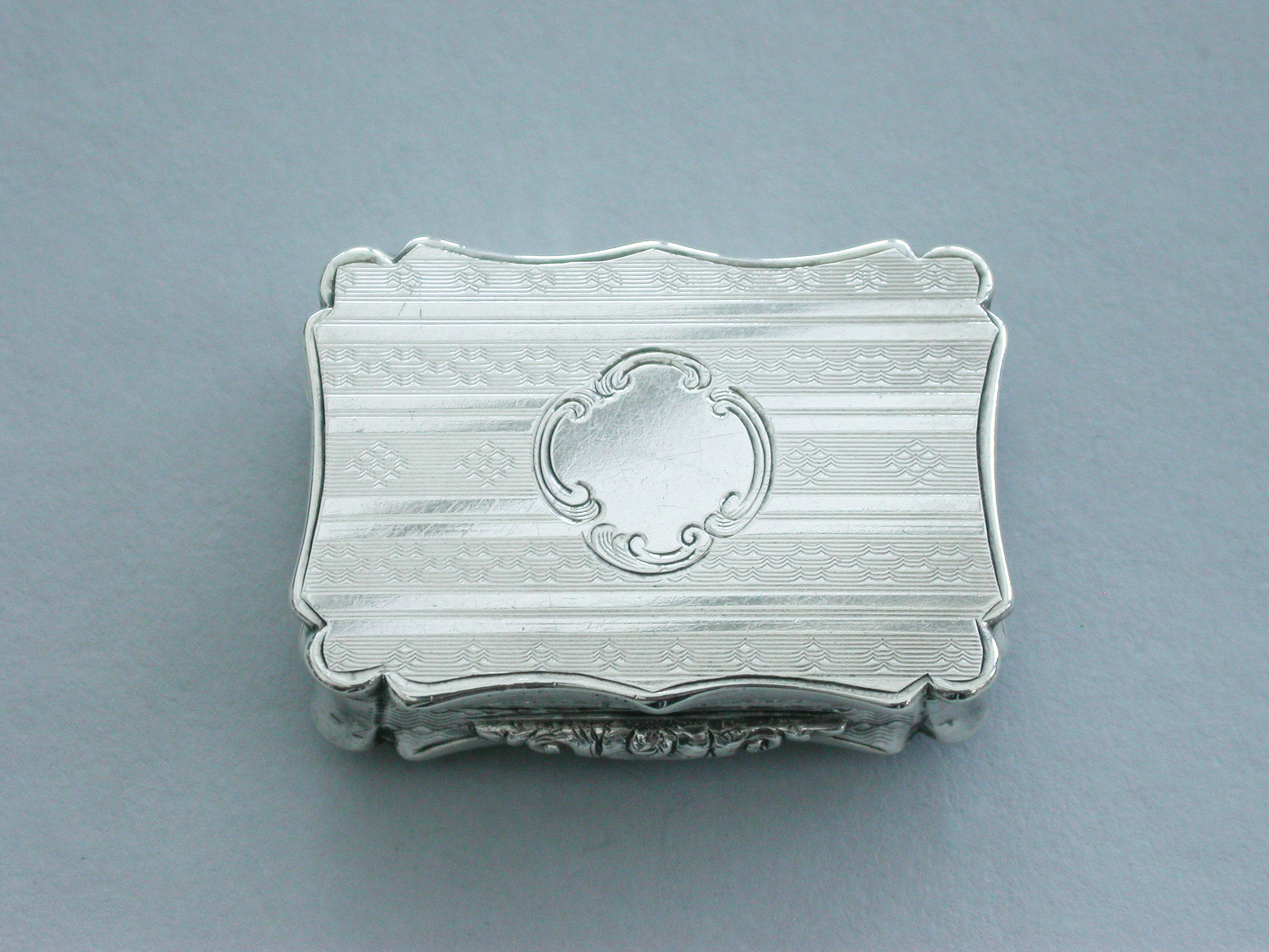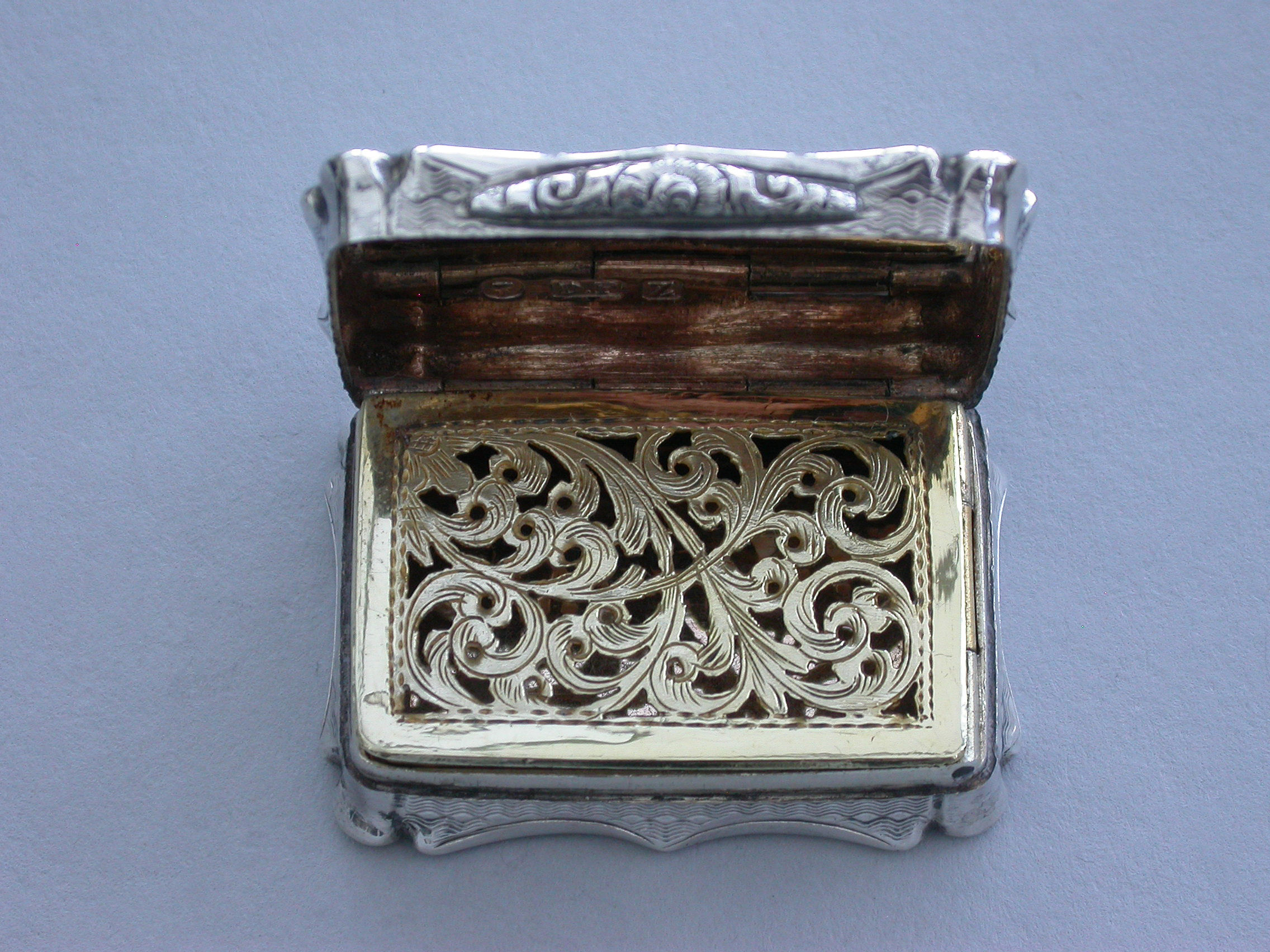 An extremely rare Victorian castle-top Vinaigrette of shaped rectangular form with bands of engine turned decoration surrounding a vacant cartouche to the base. The cover engraved with a scene depicting The Salon on the promenade at Scarborough with flag flying and the headland with Scarborough Castle beyond. Silver gilt grille pierced with folaite scrolls.