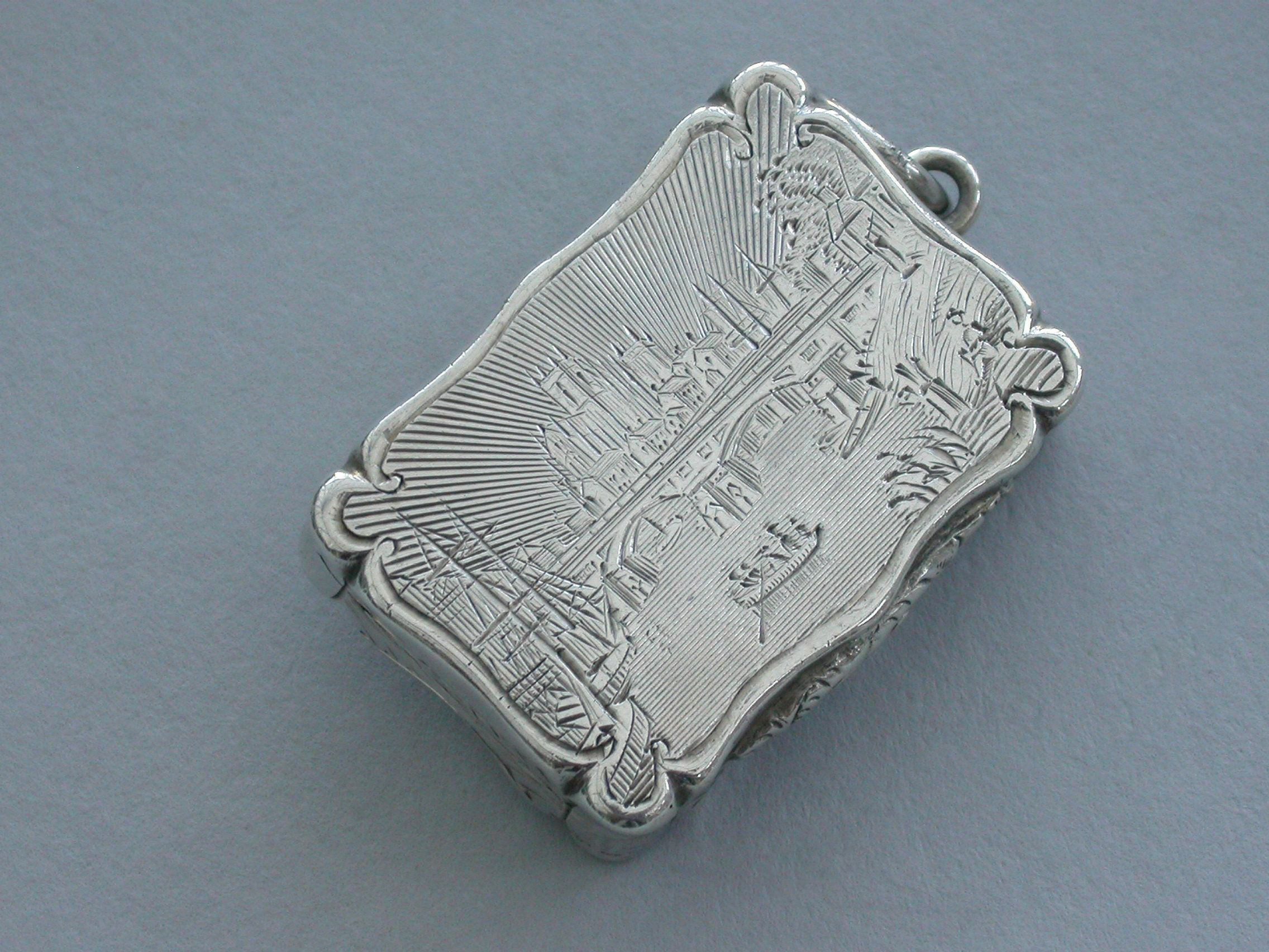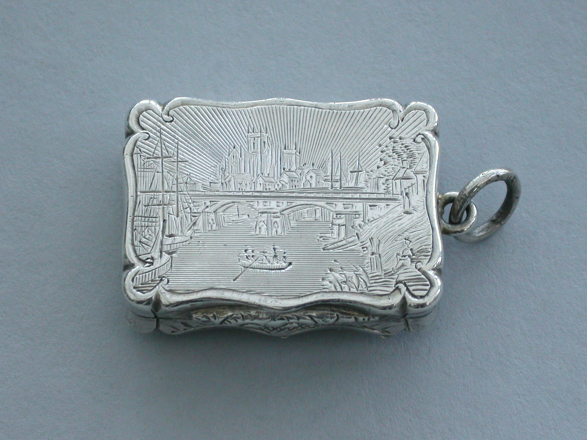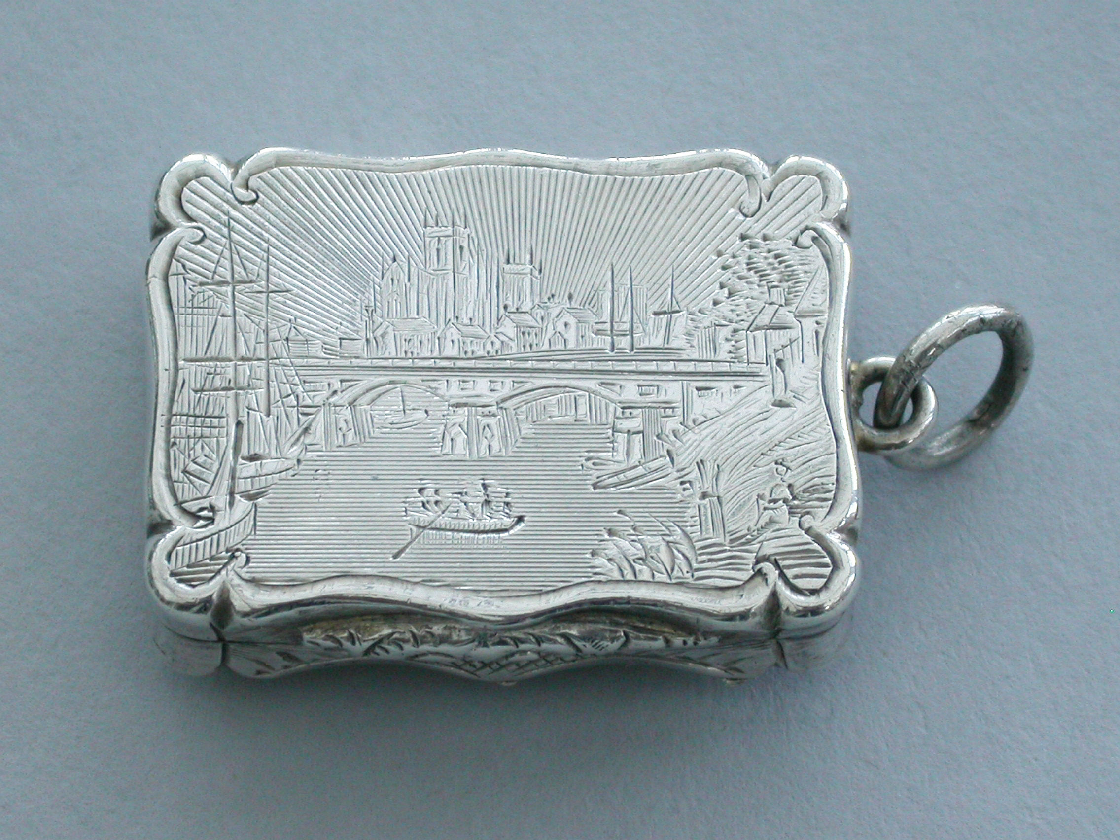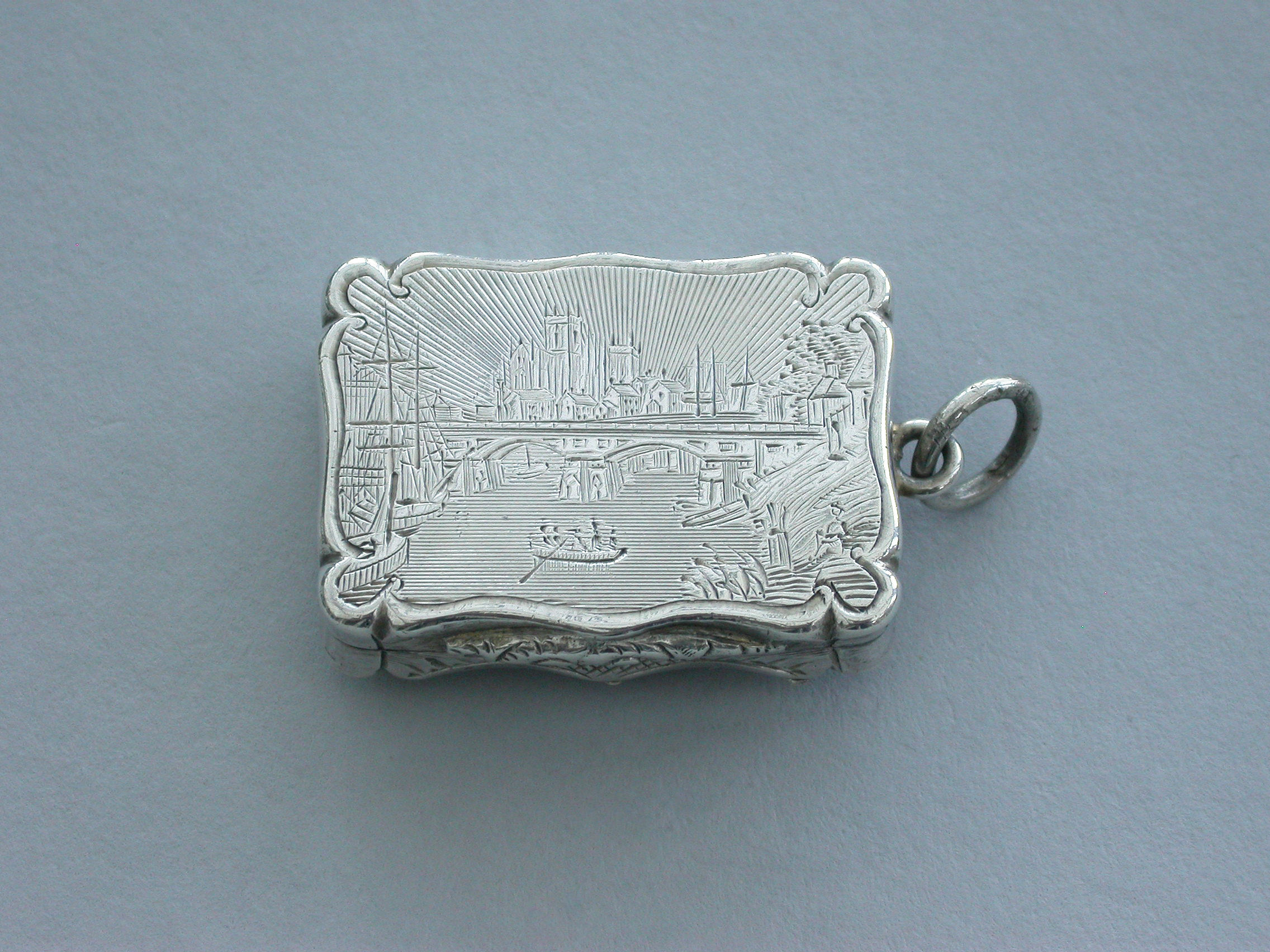 An extremely rare Victorian silver Castle-Top Vinaigrette of shaped rectangular form, the base with engraved tartan decoration surrounding a vacant cartouche, the lid engraved with a scene depicting Selby Bridge in Yorkshire with boats in the foreground, a steam train crossing the bridge and Selby Abbey in the background. Attached suspension ring.