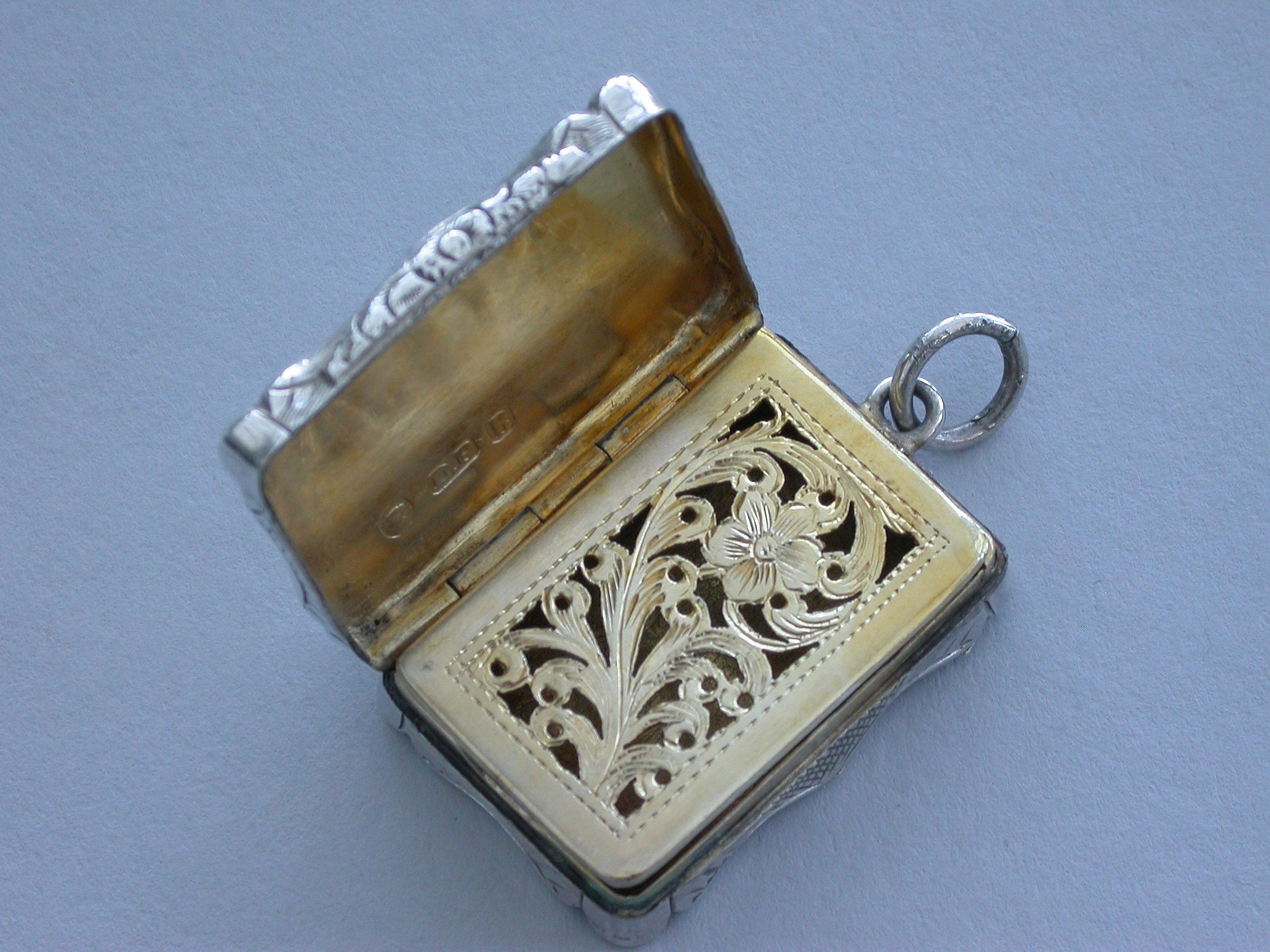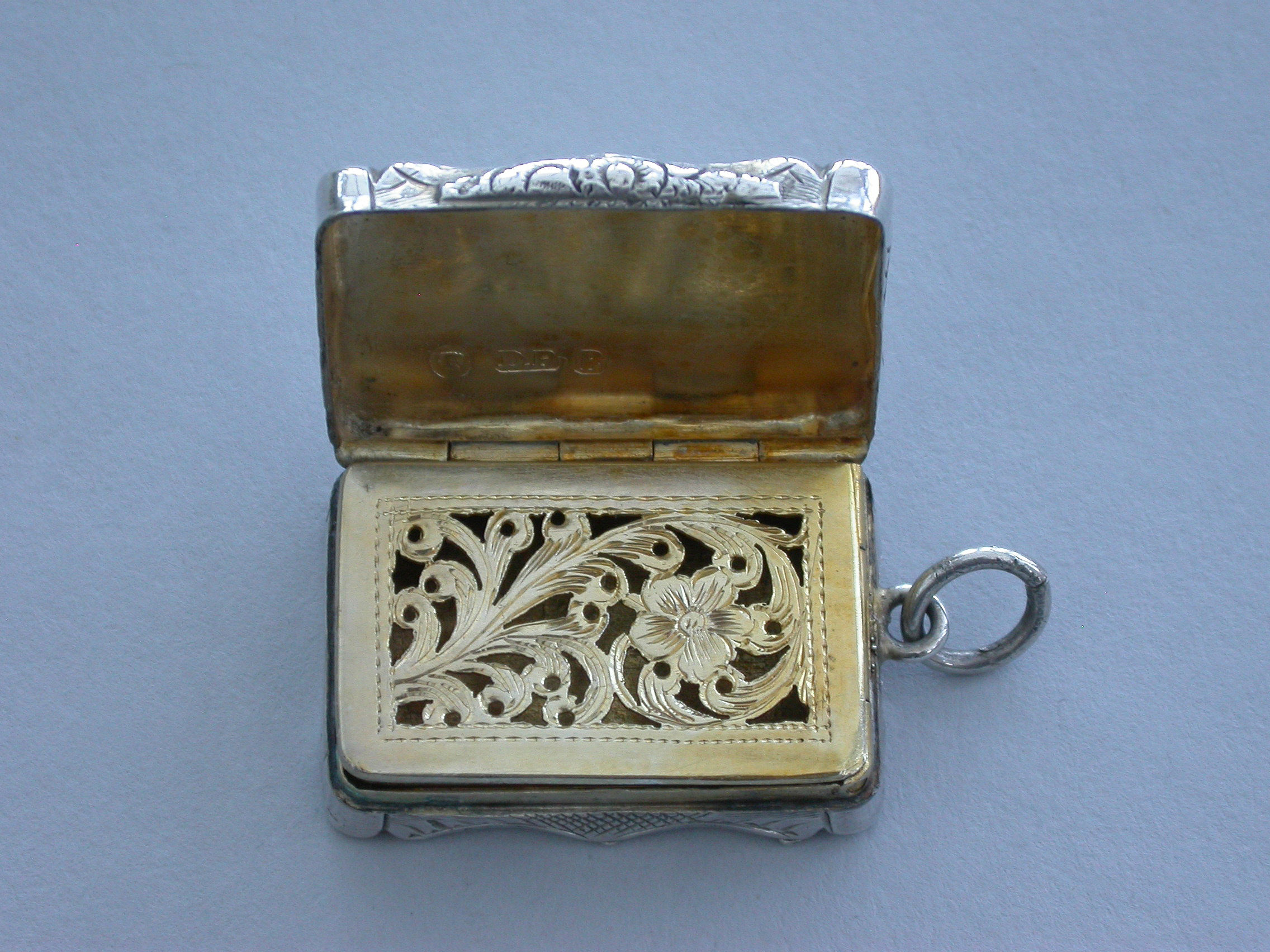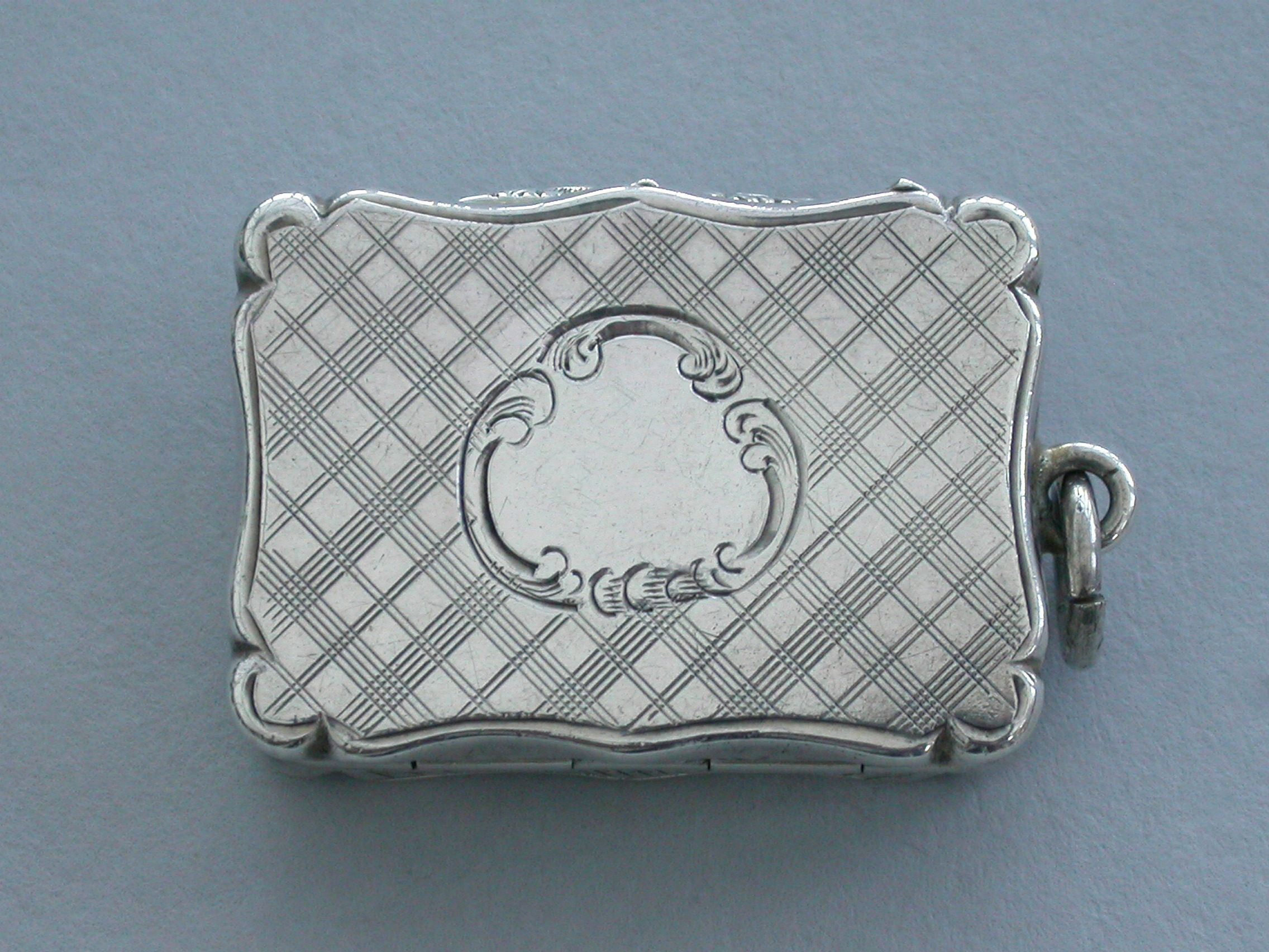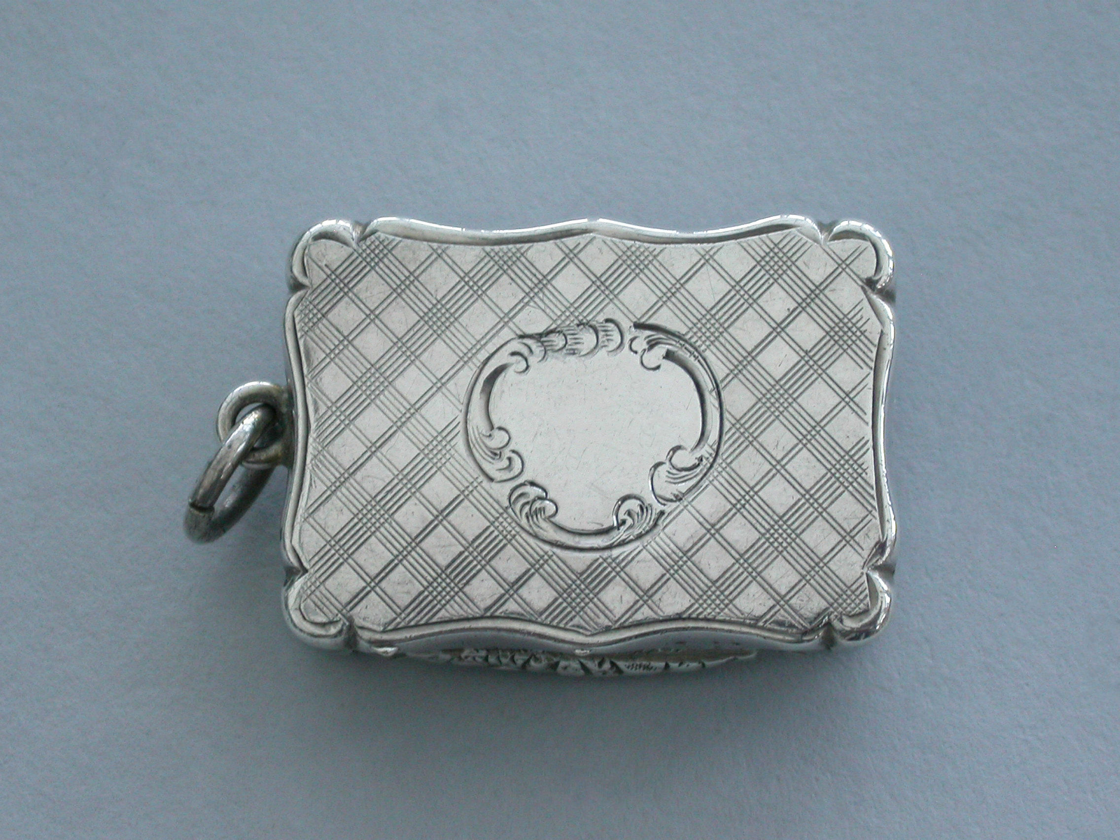 An extremely rare Victorian silver Castle-Top Vinaigrette of shaped rectangular form, the base with engraved tartan decoration surrounding a vacant cartouche, the lid engraved with a scene depicting Selby Bridge in Yorkshire with boats in the foreground, a steam train crossing the bridge and Selby Abbey in the background. Attached suspension ring.
