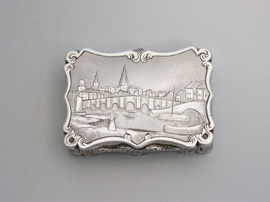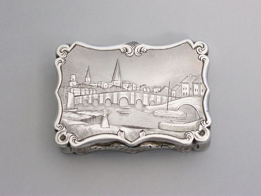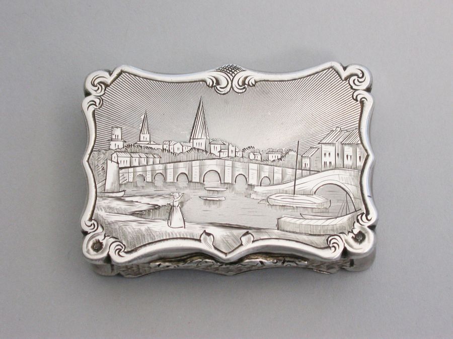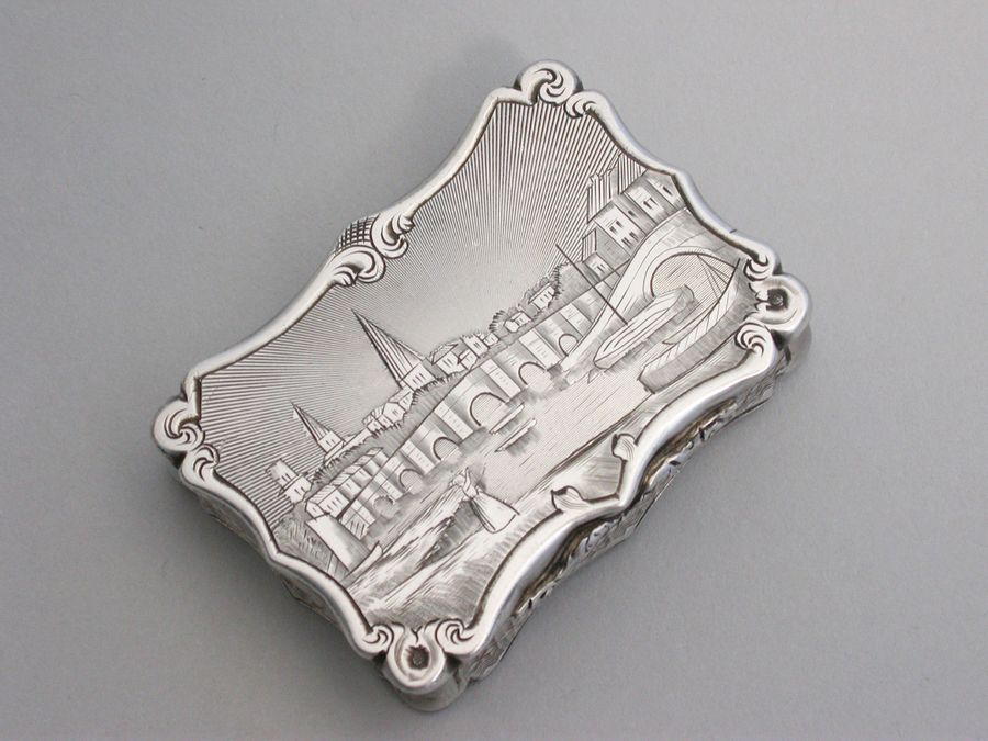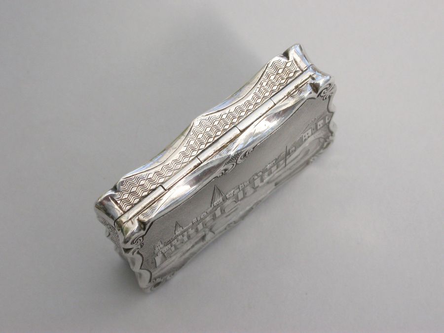 An extremely rare Victorian silver “Castle-Top” Vinaigrette of large shaped rectangular form with engine turned decoration to the base and sides, the lid engraved with a view depicting the English and Coleham bridges in Shrewsbury, Shropshire.