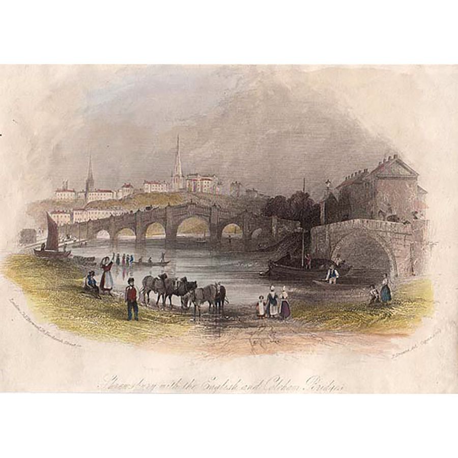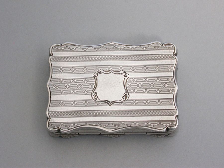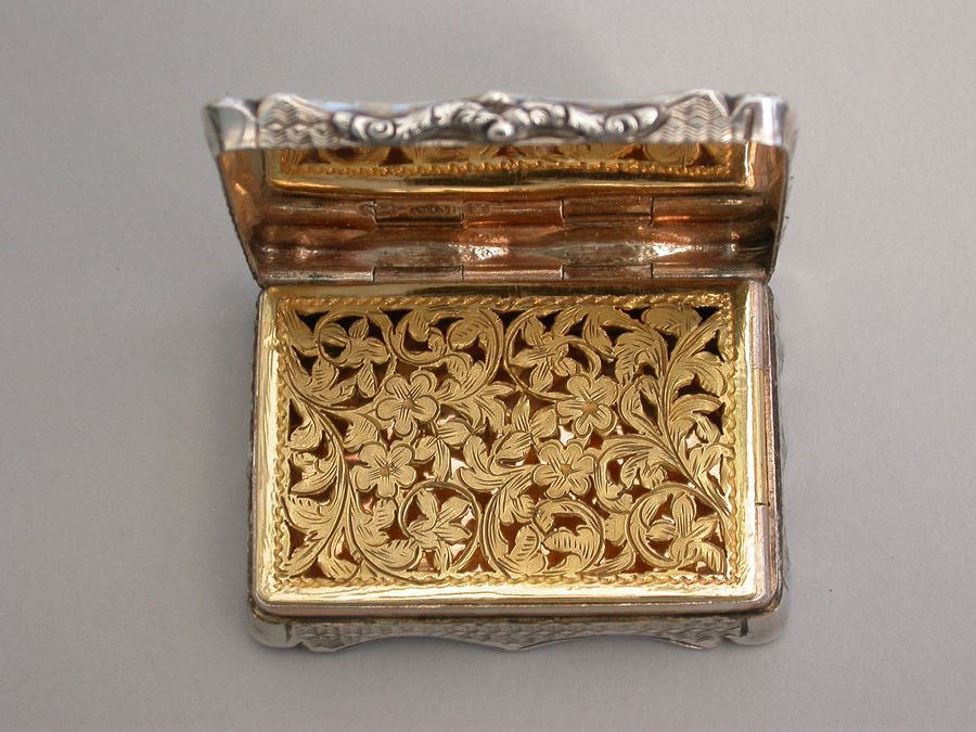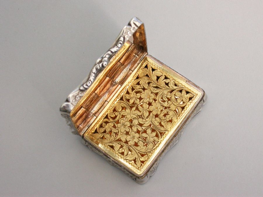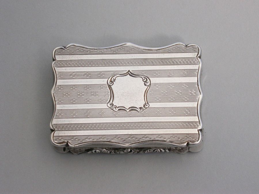 An extremely rare Victorian silver “Castle-Top” Vinaigrette of large shaped rectangular form with engine turned decoration to the base and sides, the lid engraved with a view depicting the English and Coleham bridges in Shrewsbury, Shropshire.