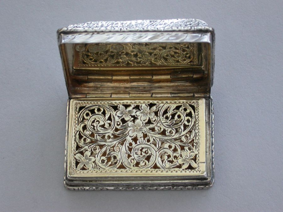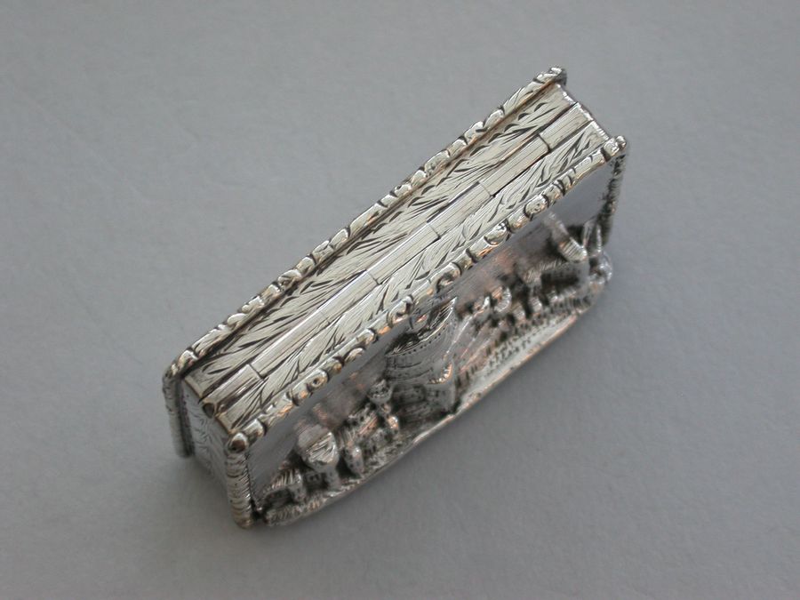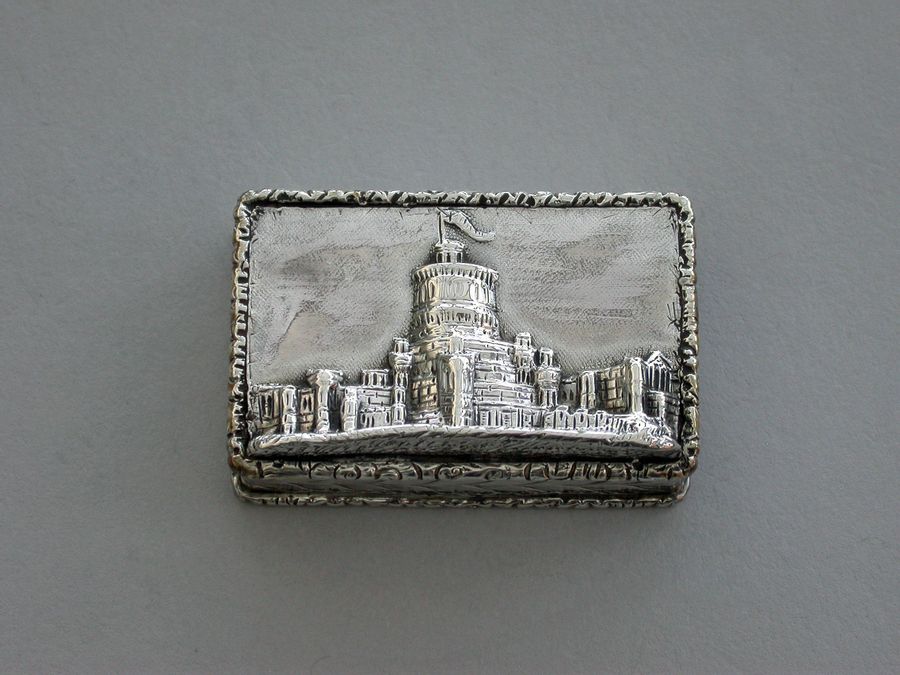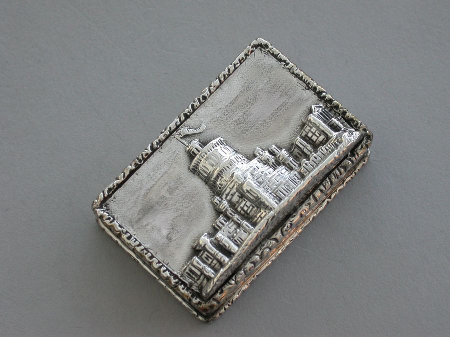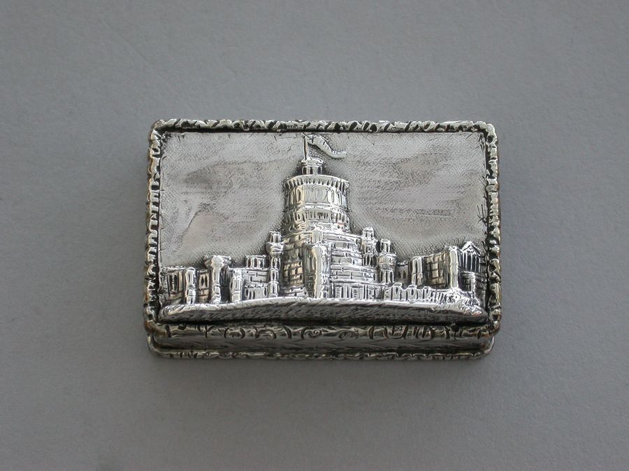 A rare Victorian silver castle-top Vinaigrette of rectangular form, the base engraved with scrolls and a vacant cartouche, raised folaite borders, the cover chased and engraved with a view of Windsor Castle as seen from the town in high relief. The silver gilt grille pierced with scrolls and flower heads.