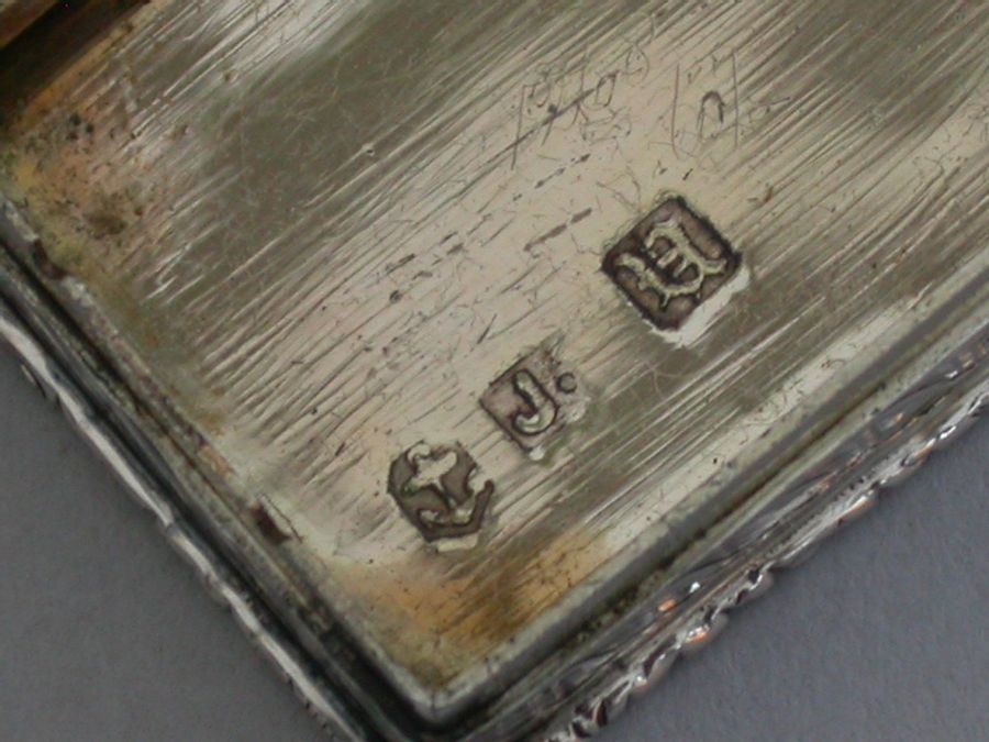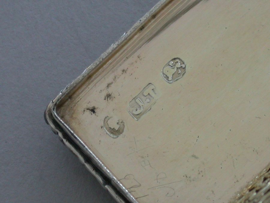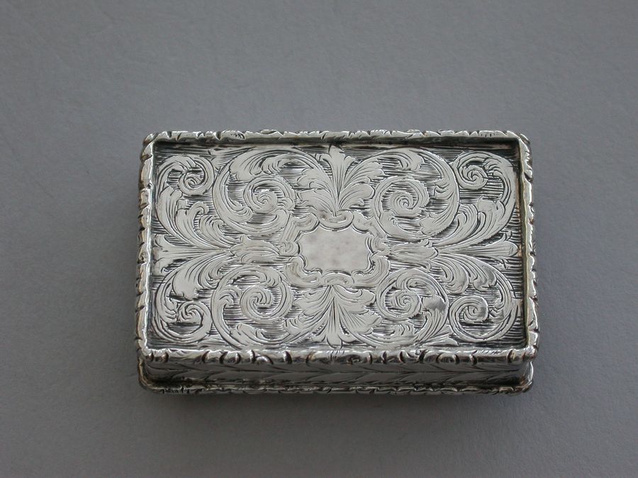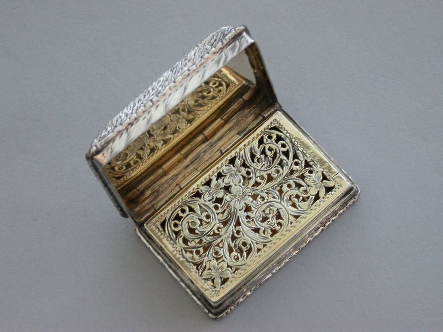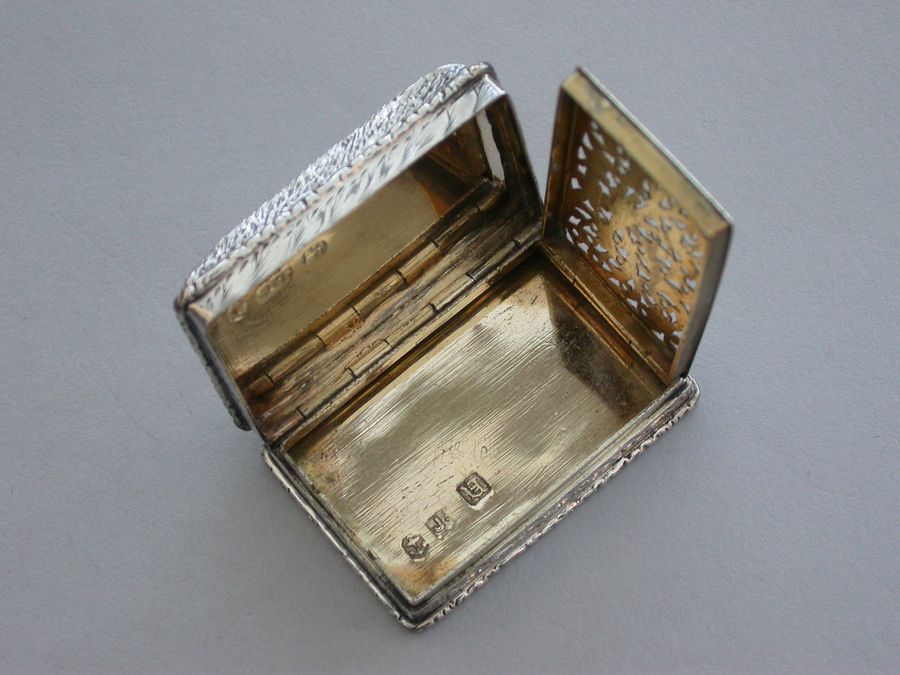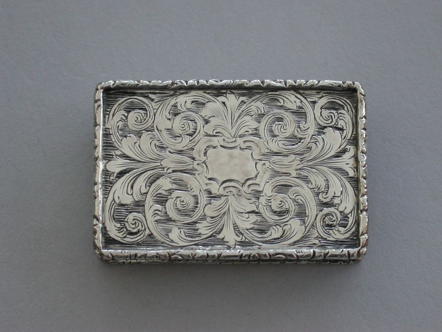 A rare Victorian silver castle-top Vinaigrette of rectangular form, the base engraved with scrolls and a vacant cartouche, raised folaite borders, the cover chased and engraved with a view of Windsor Castle as seen from the town in high relief. The silver gilt grille pierced with scrolls and flower heads.