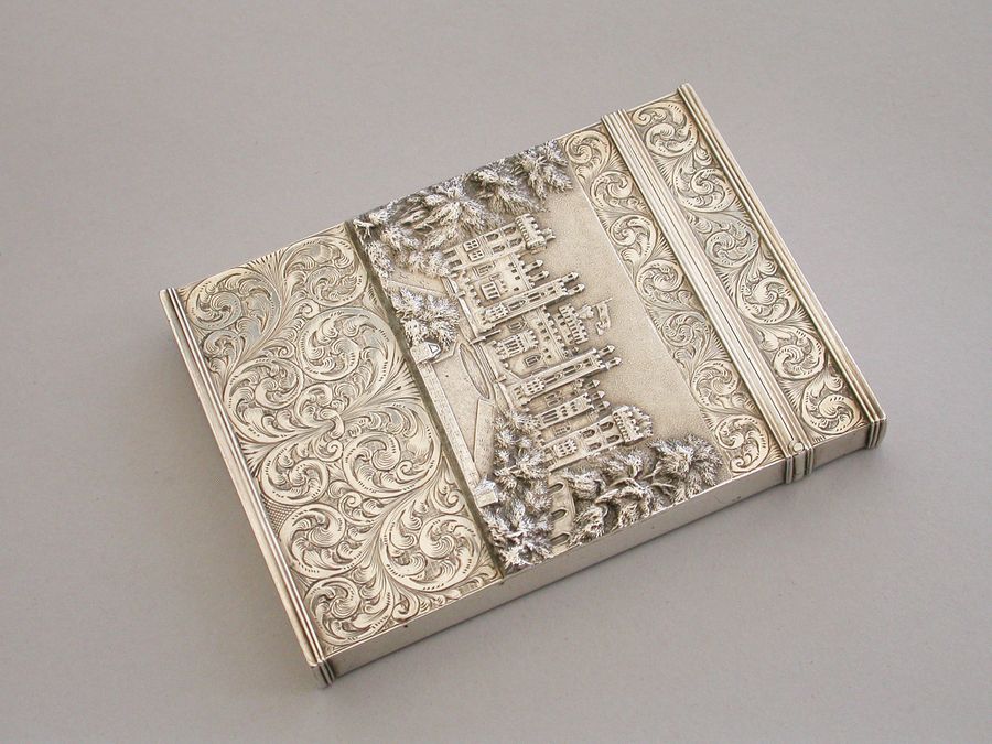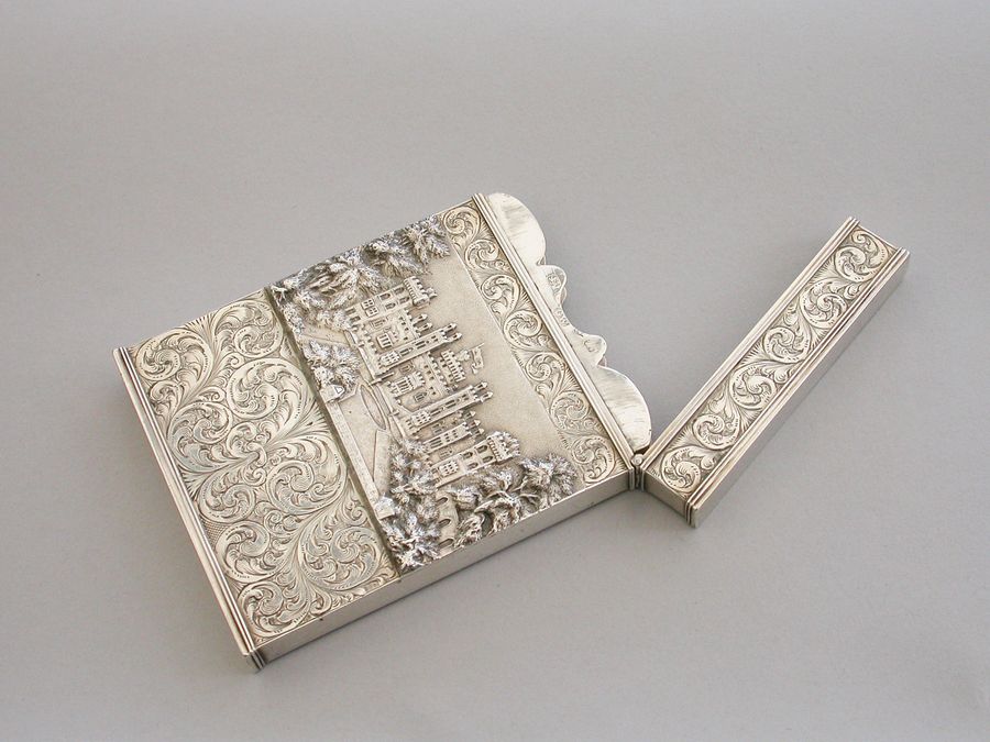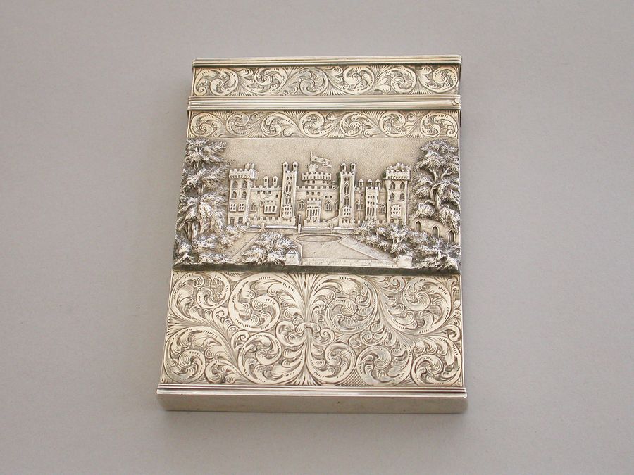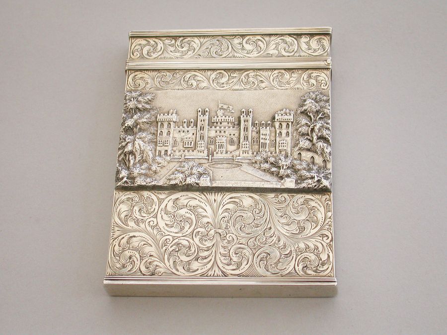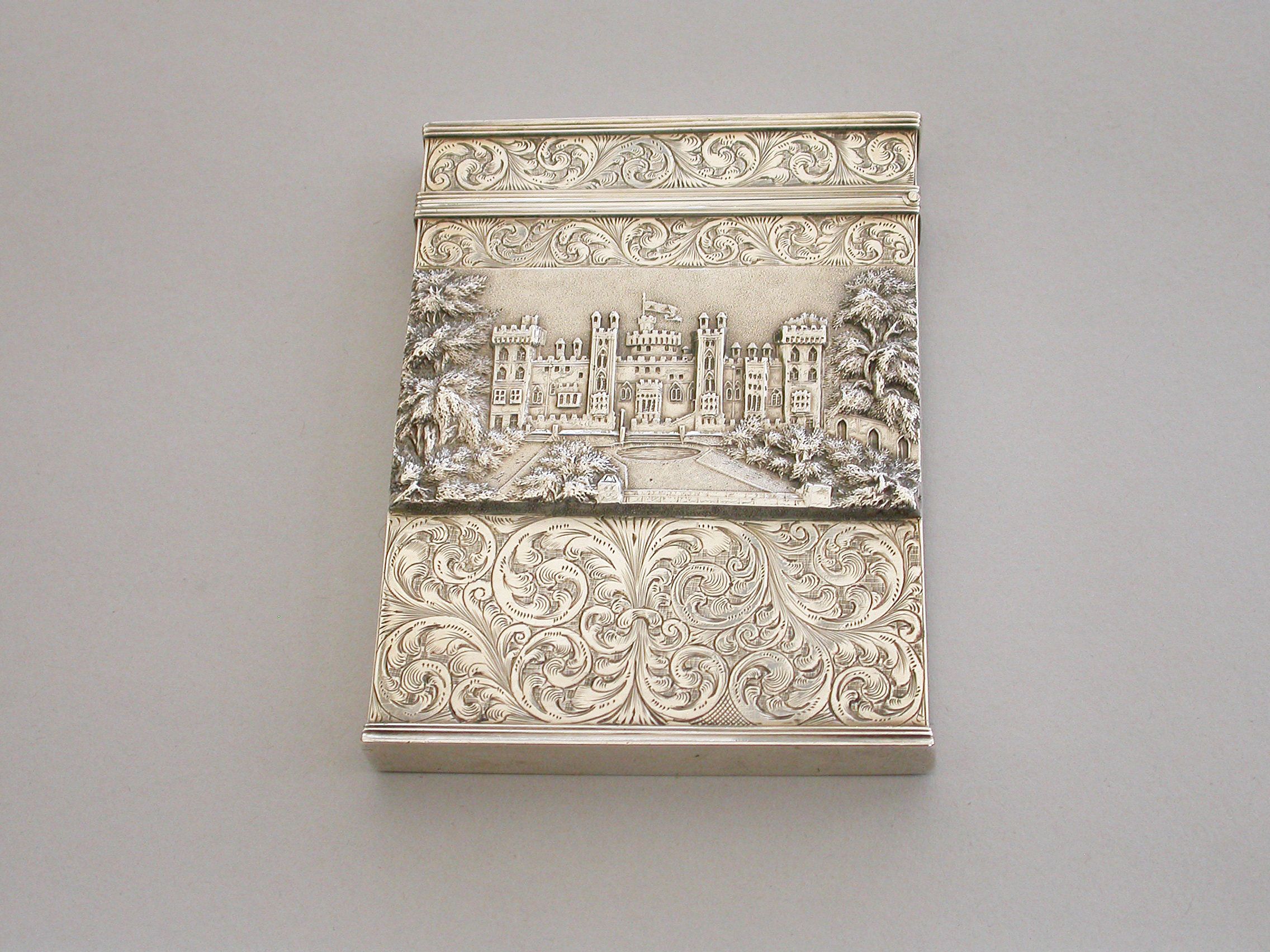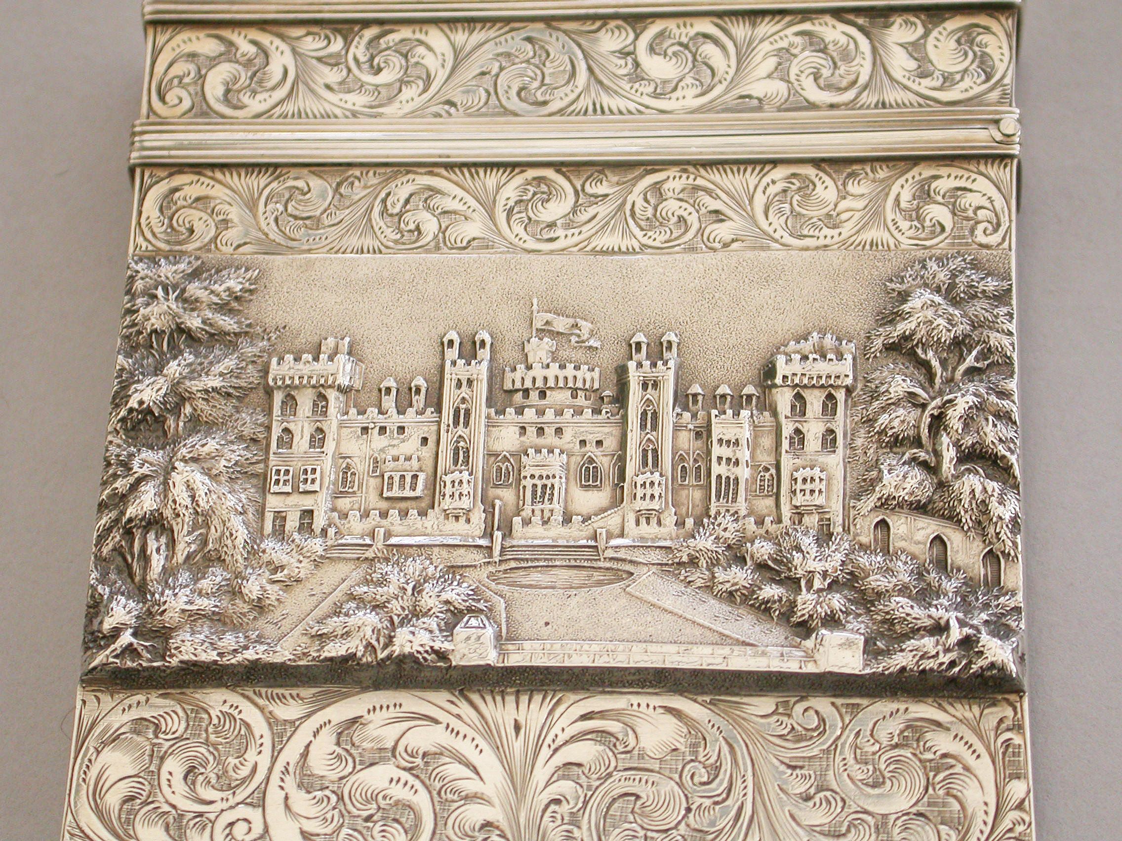 A good quality early Victorian silver castle-top Card Case, of rectangular form with hinged lid and raised reeded borders, foliate scroll engraved decoration to both sides and the face with a raised chased scene depicting Windsor Castle and garden in high relief.