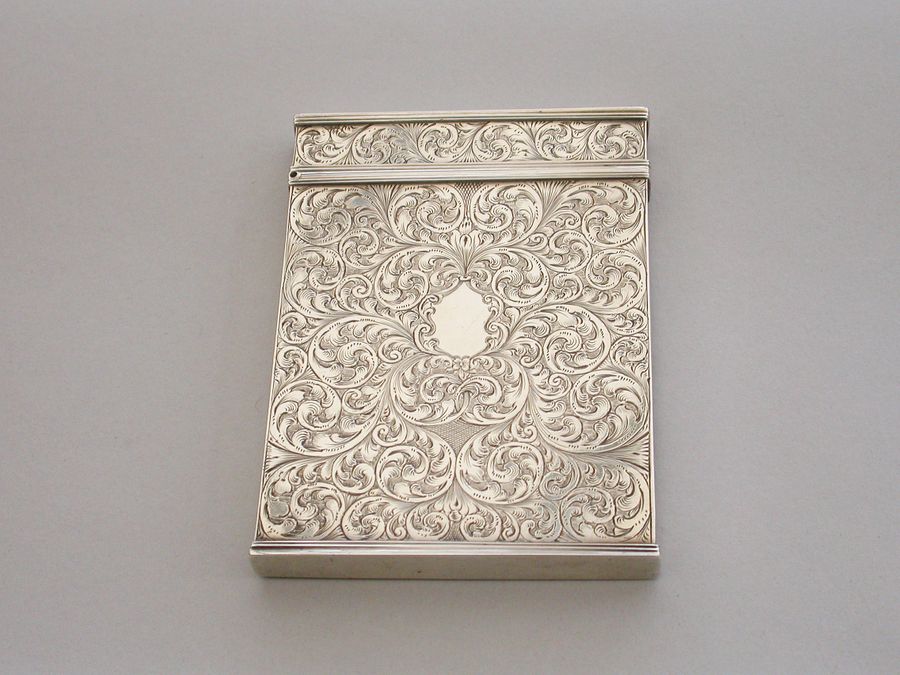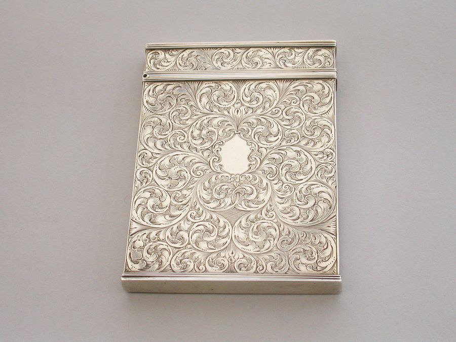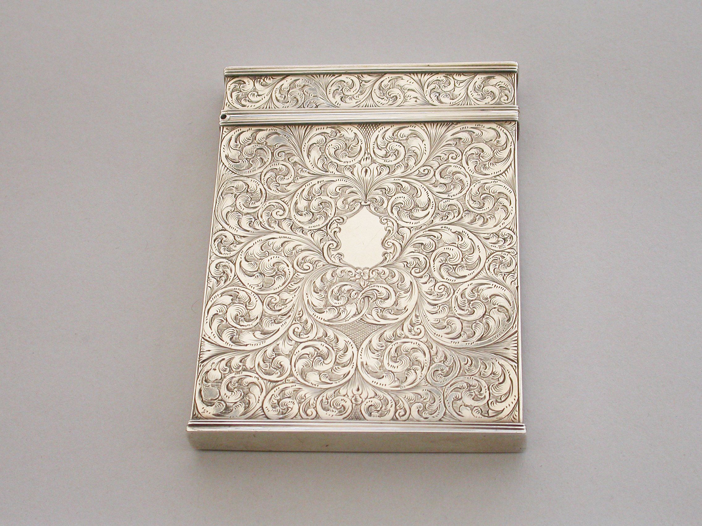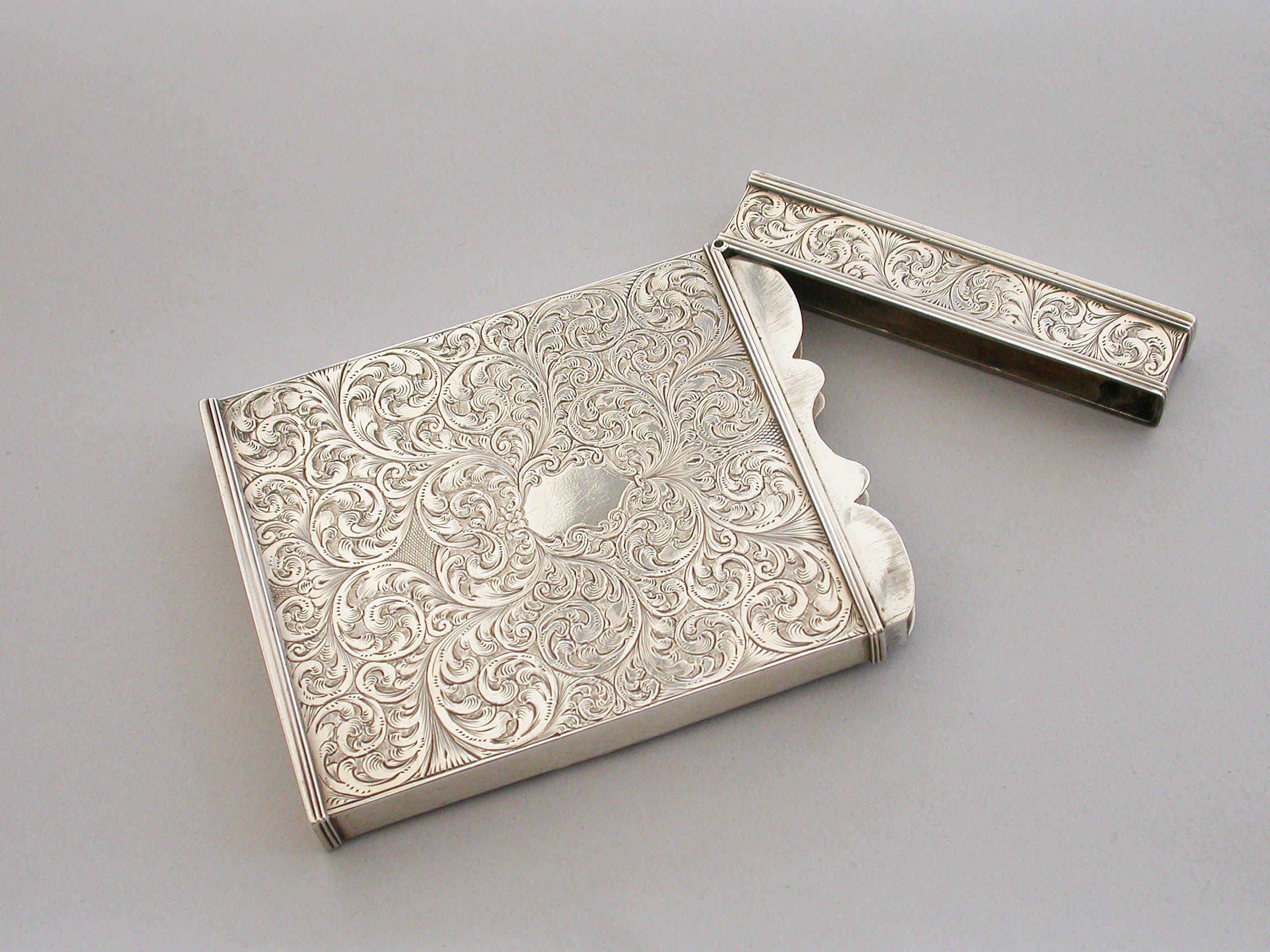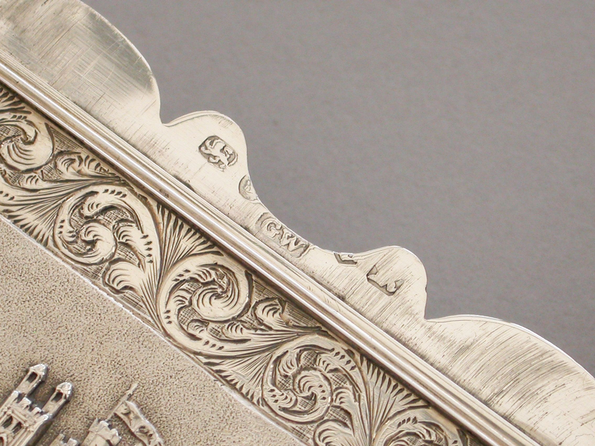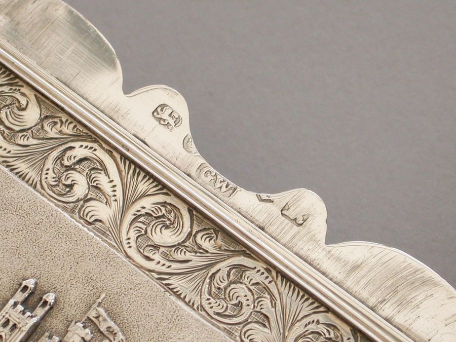 A good quality early Victorian silver castle-top Card Case, of rectangular form with hinged lid and raised reeded borders, foliate scroll engraved decoration to both sides and the face with a raised chased scene depicting Windsor Castle and garden in high relief.