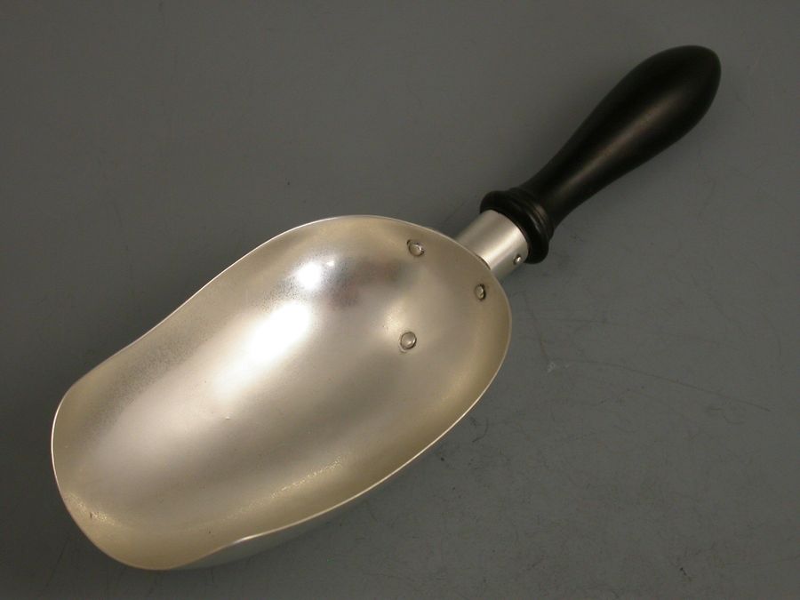 An interesting Victorian silver Scoop with attached turned ebony handle. It use unknown possibly for Coffee or Candy ?