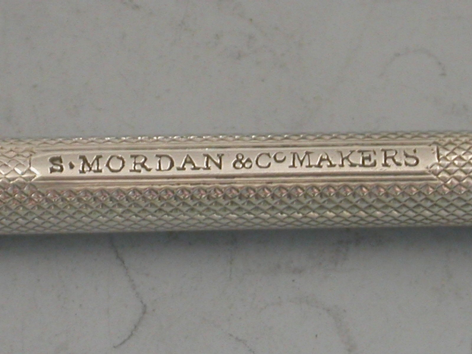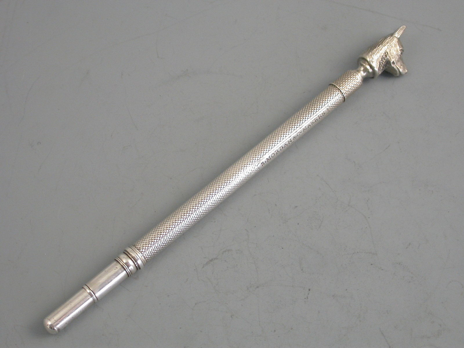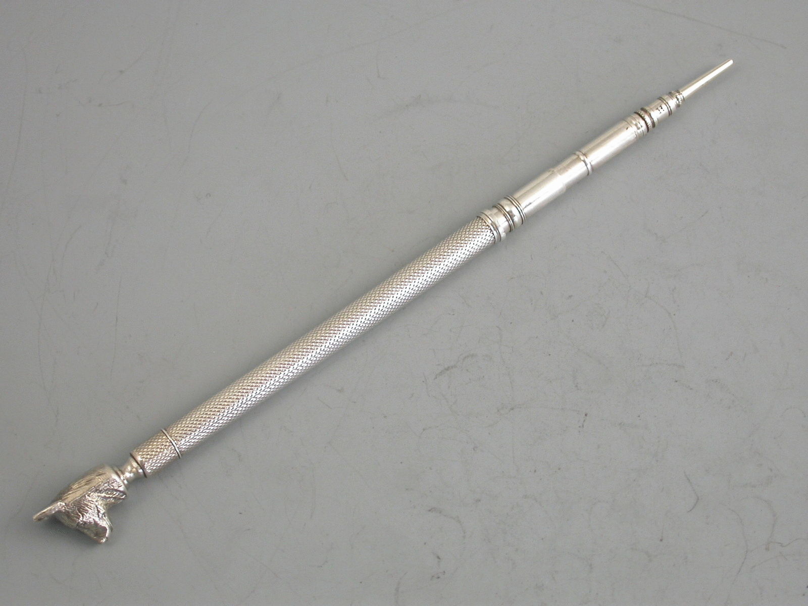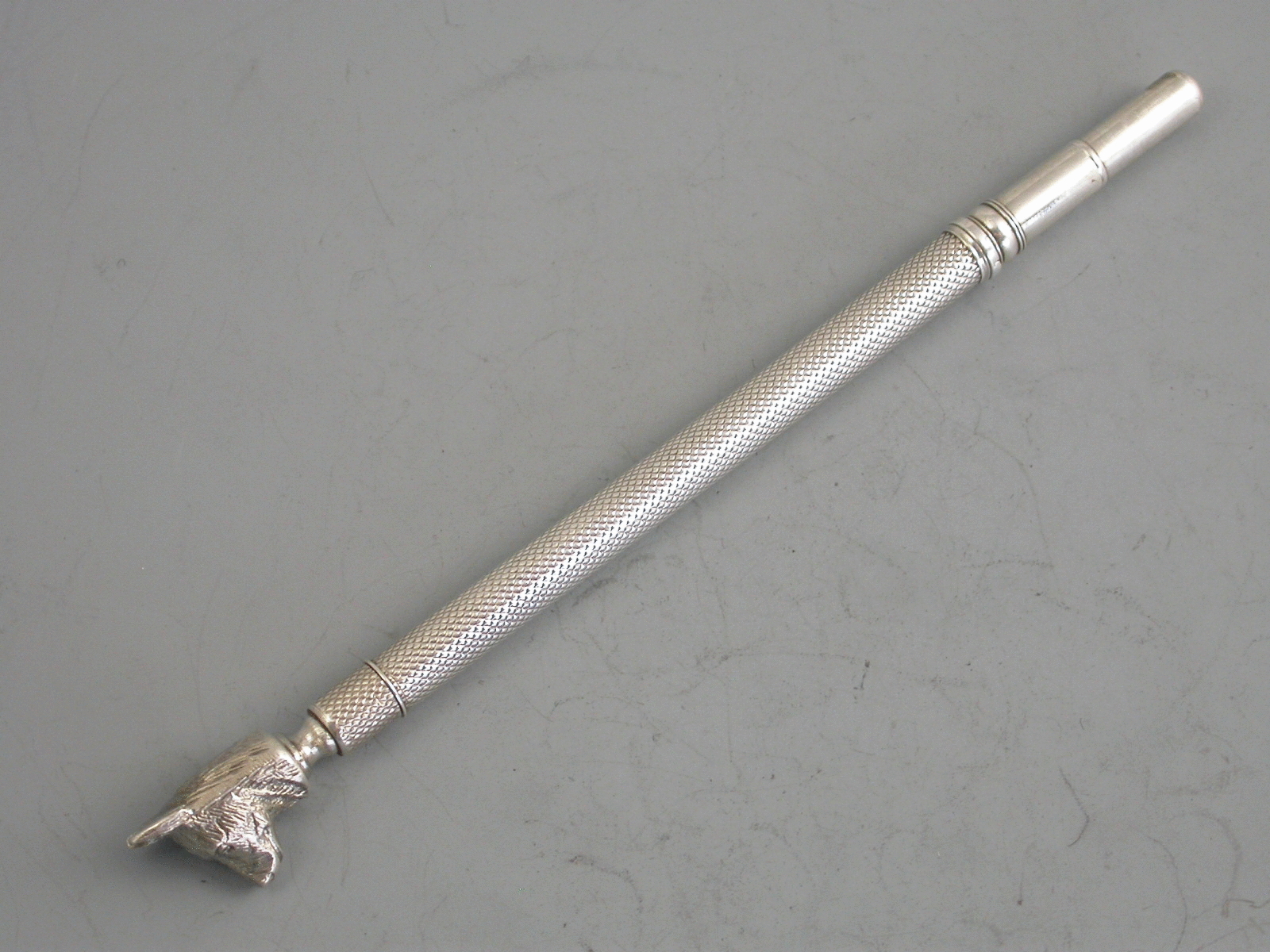 An unusual Victorian silver combination Dip Pen and Propelling Pencil, the tubular barrel with engine turned decoration, the screw off cap to the lead reservoir mounted with a cast figure of a German Shepherd dog, the pen and pencil both housed inside the tube and reversable.