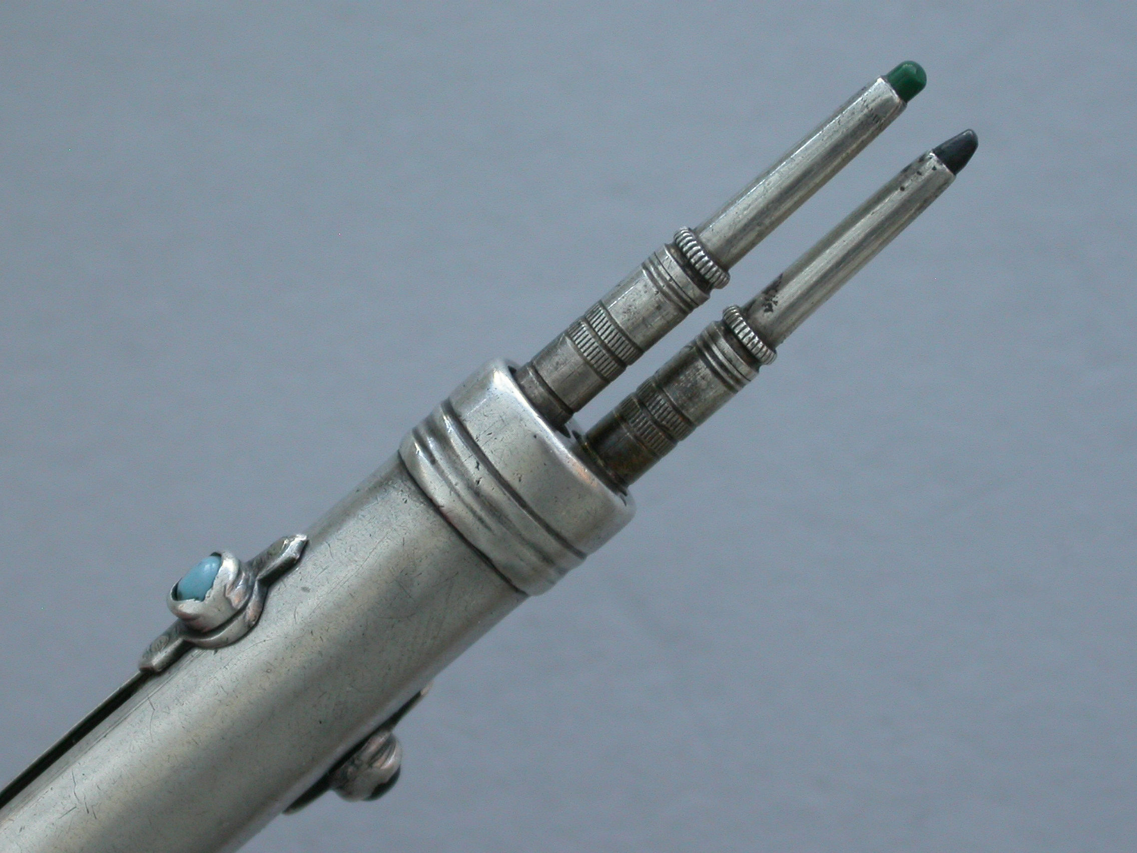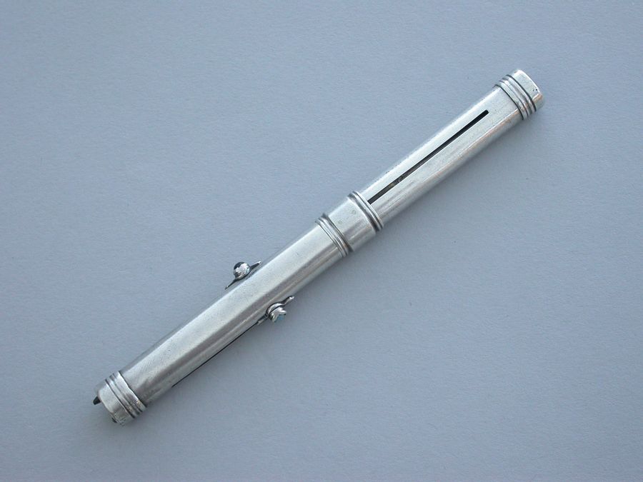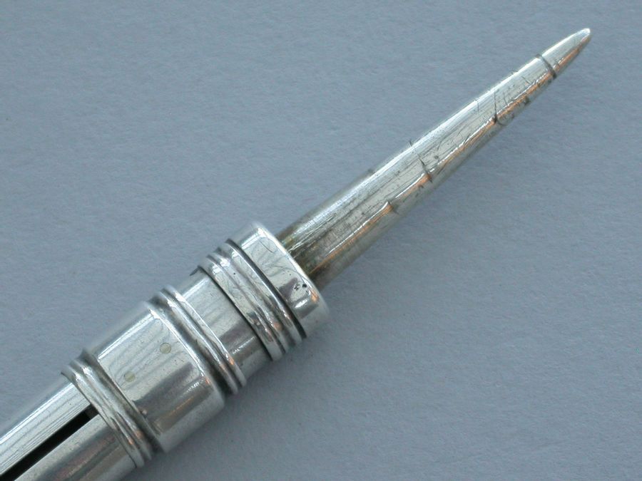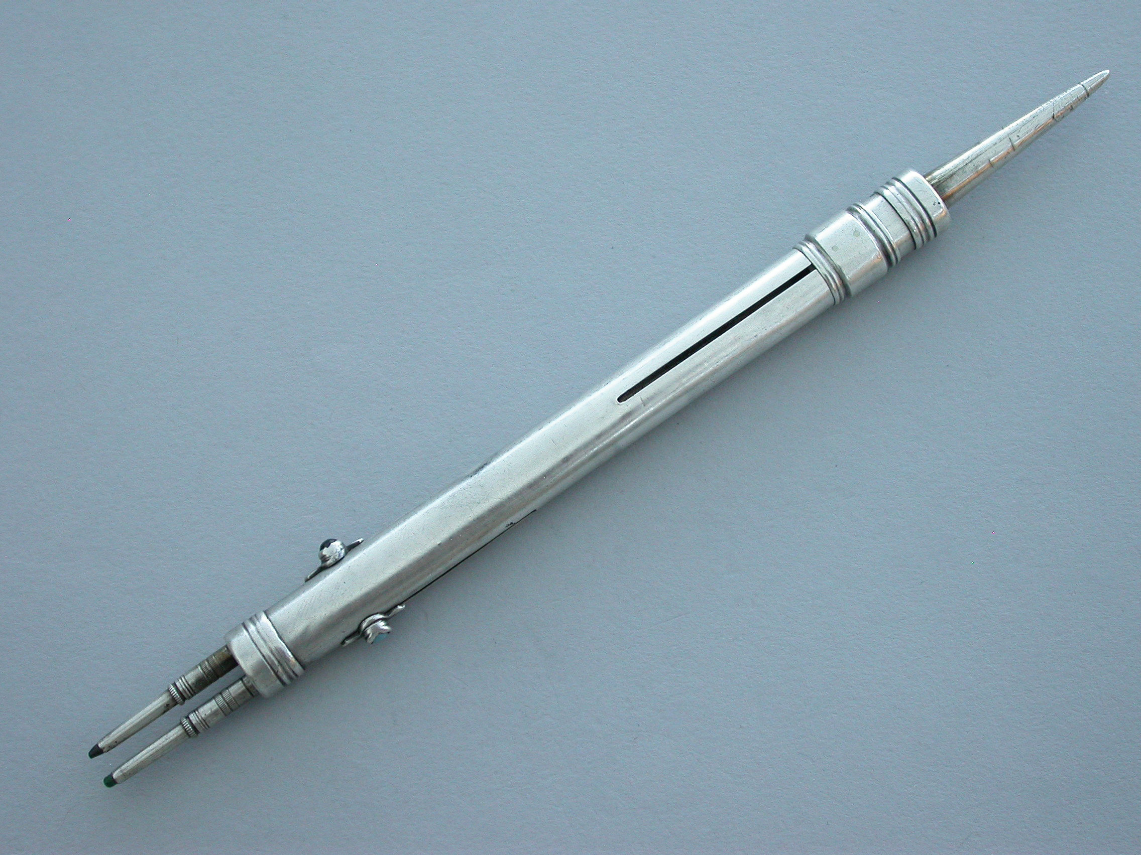 An unusual Victorian silver combined Writing Instrument consisting of two green and black sliding Propelling Pencils with matching coloured stones to the slider buttons combined with a steel spike (for the marking out of parchment?) also on a sliding mechanism.