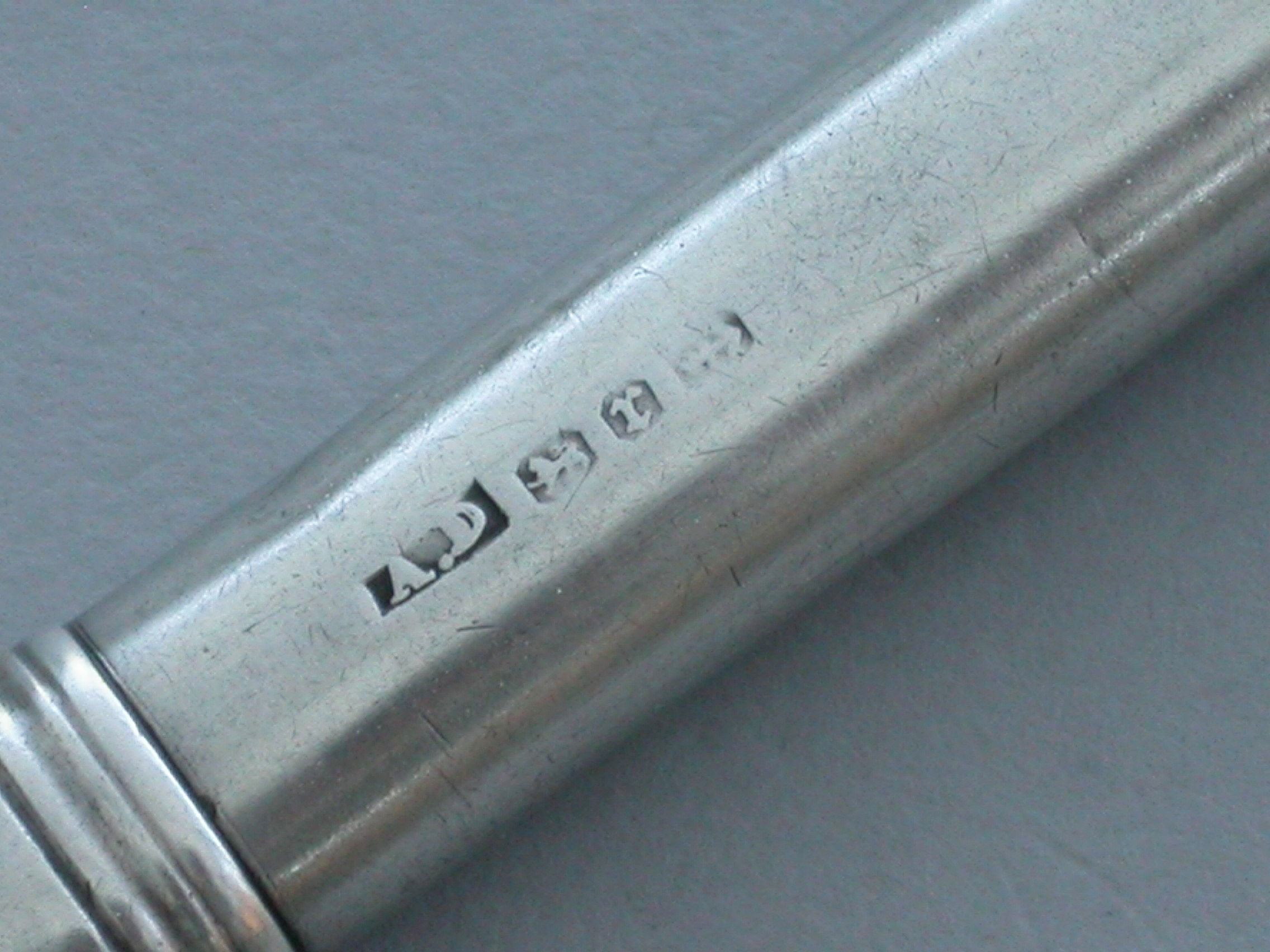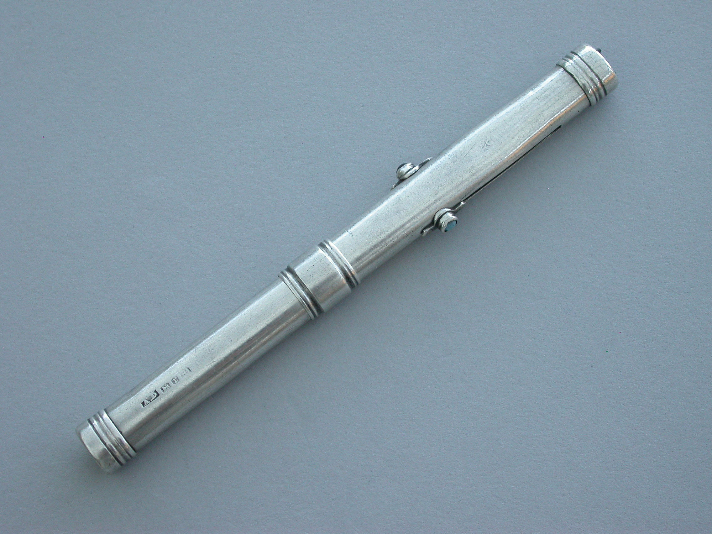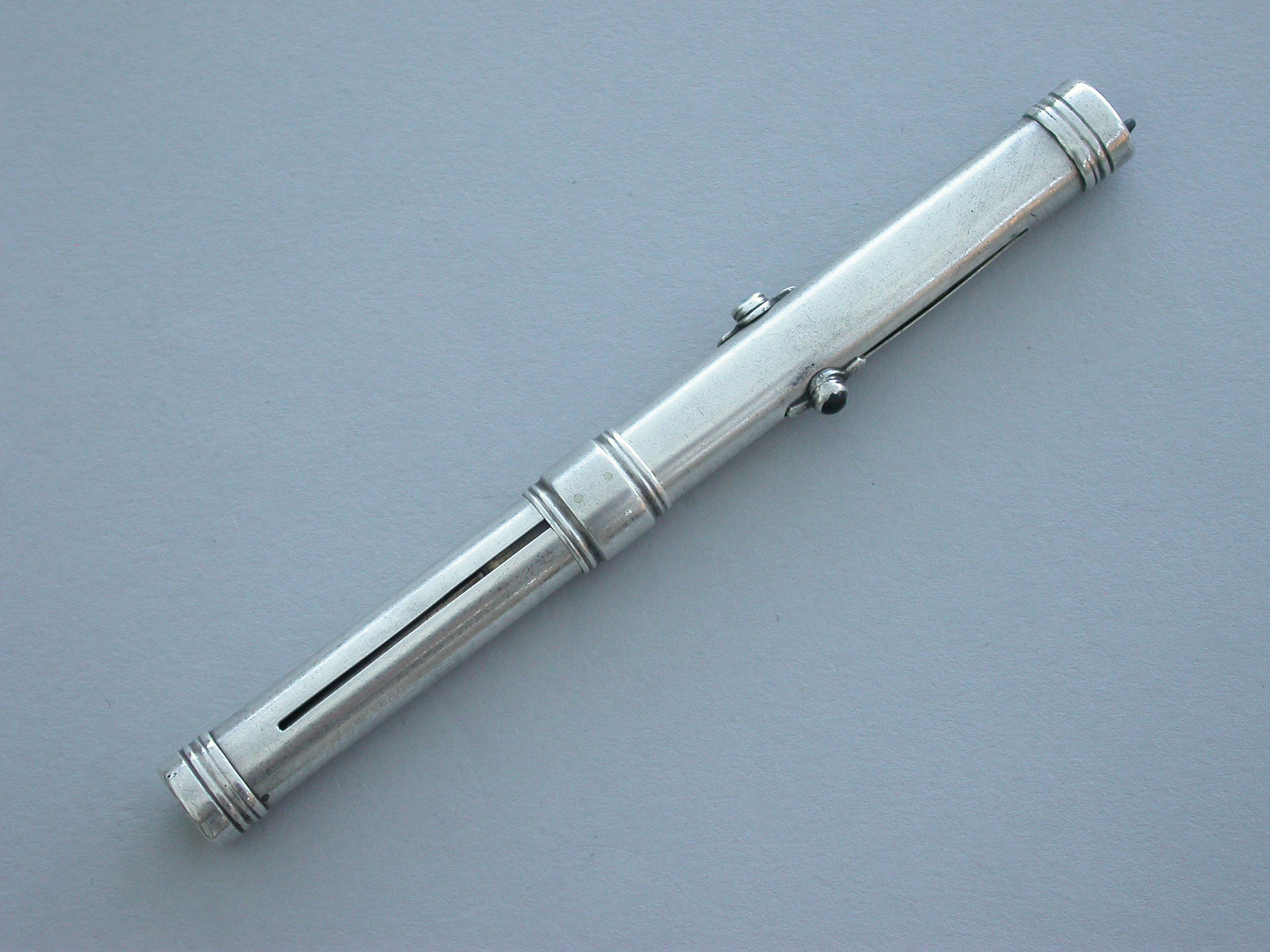 An unusual Victorian silver combined Writing Instrument consisting of two green and black sliding Propelling Pencils with matching coloured stones to the slider buttons combined with a steel spike (for the marking out of parchment?) also on a sliding mechanism.