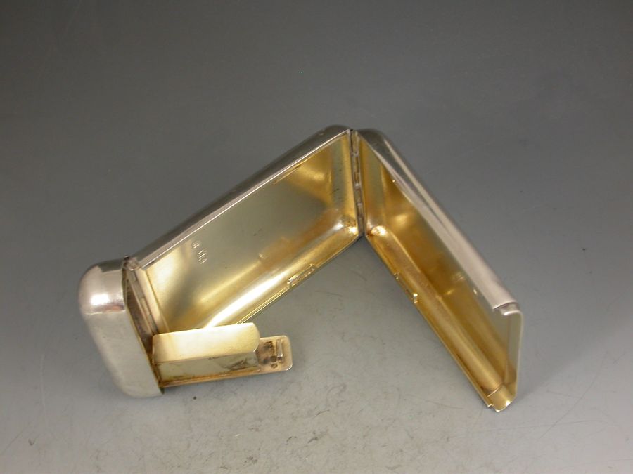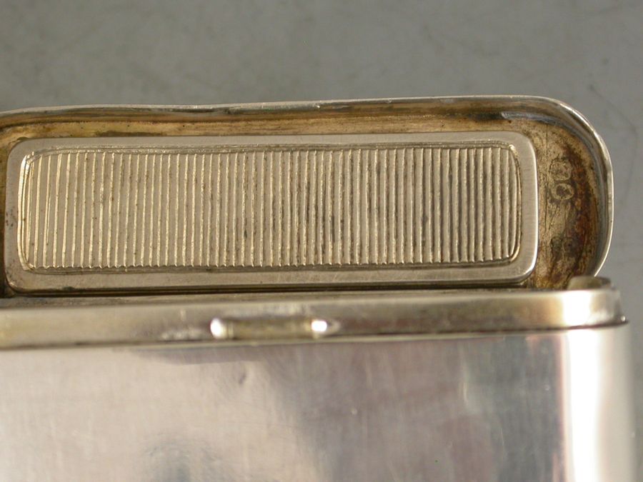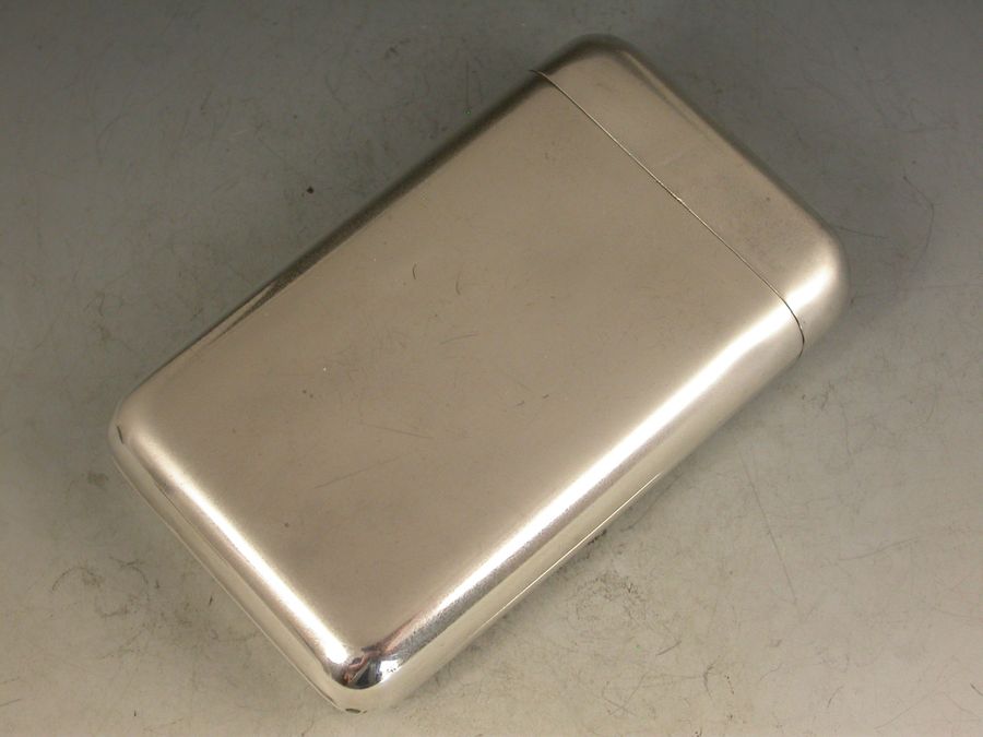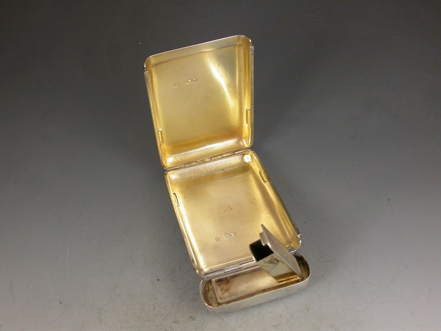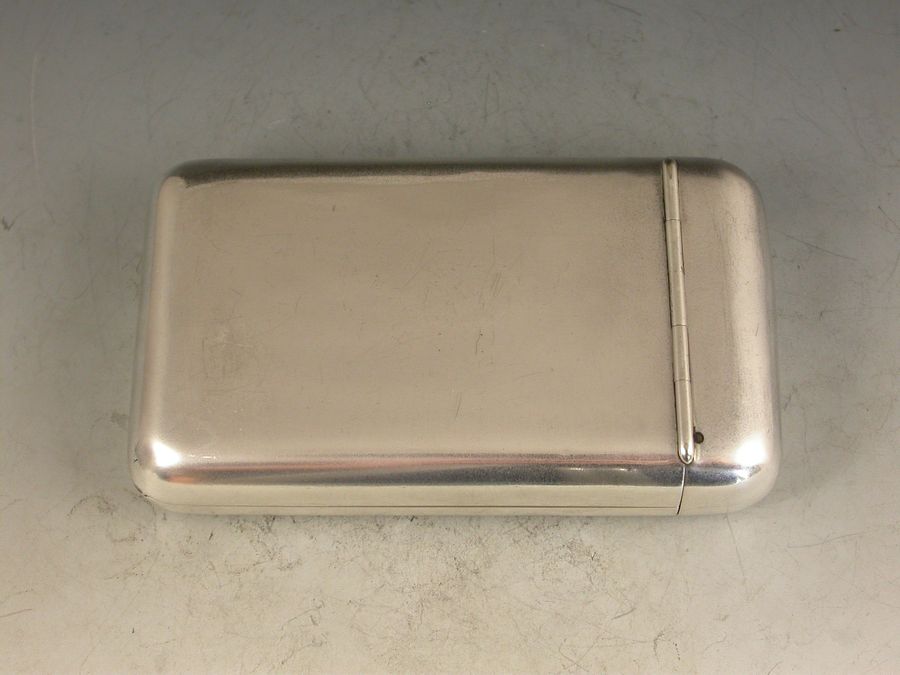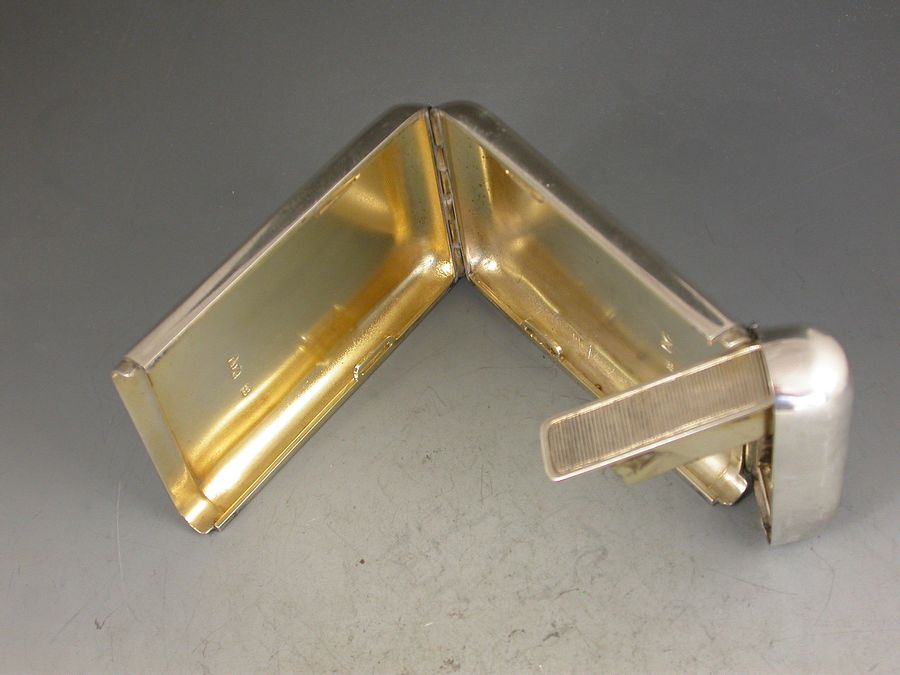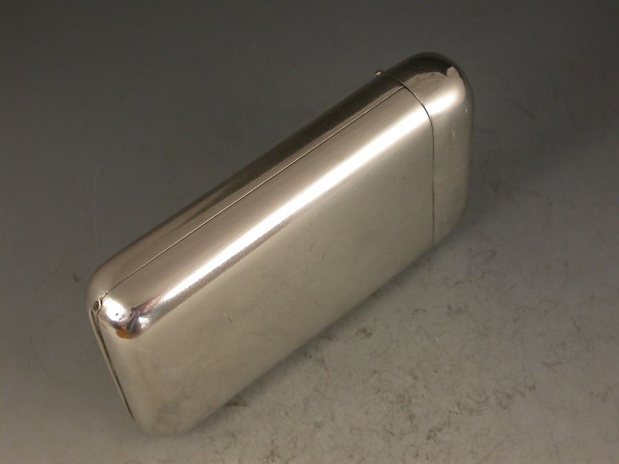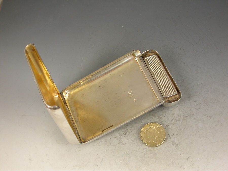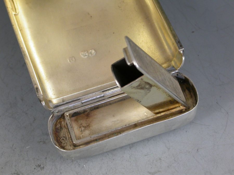 An unusual Victorian silver Cheroot Case combined with a concealed Vesta Case and Striker, of rounded rectangular form with spring loaded hinge lid opening to reveal a silver gilt interior with a concealed Vesta compartment in the lid.