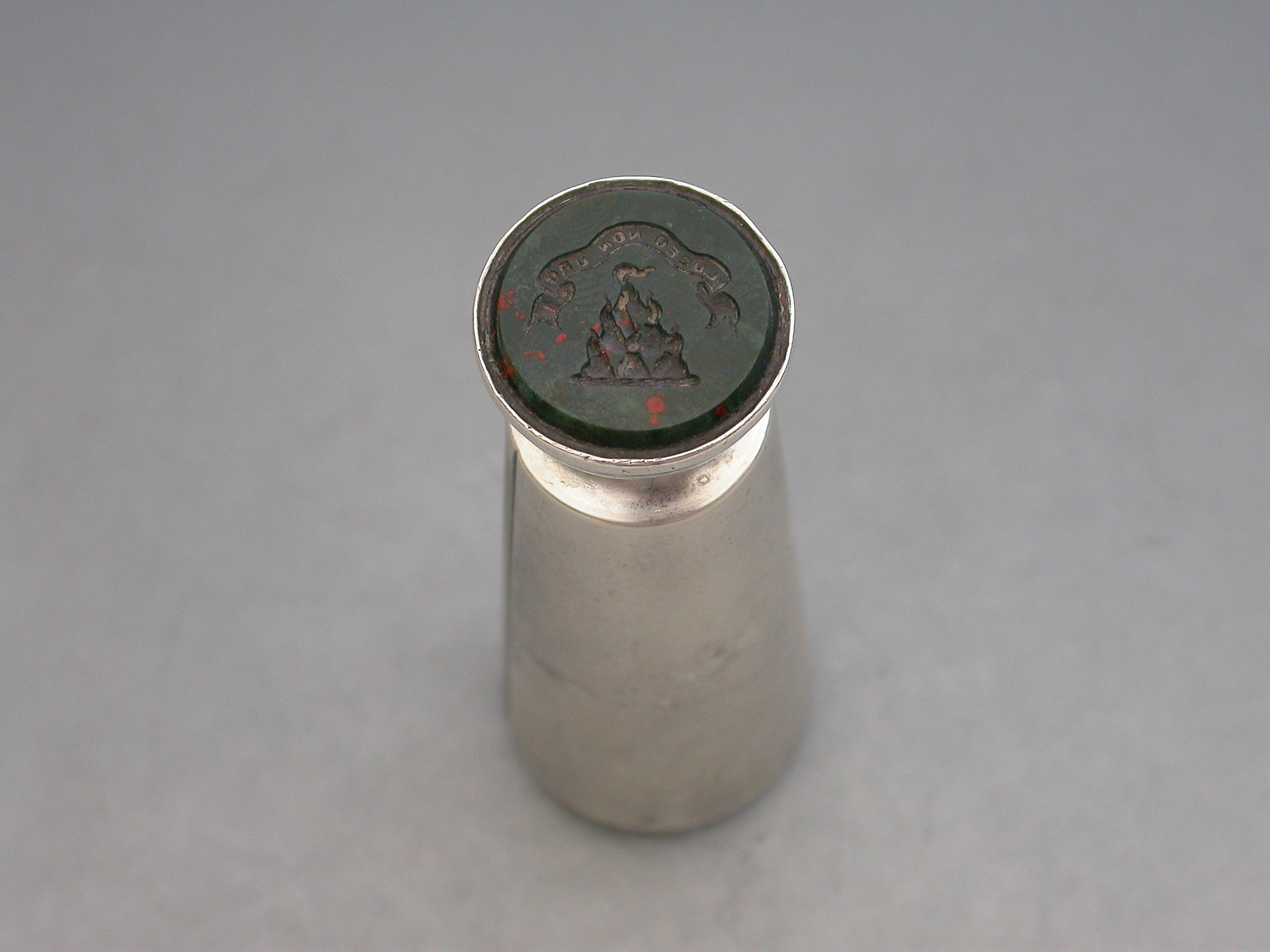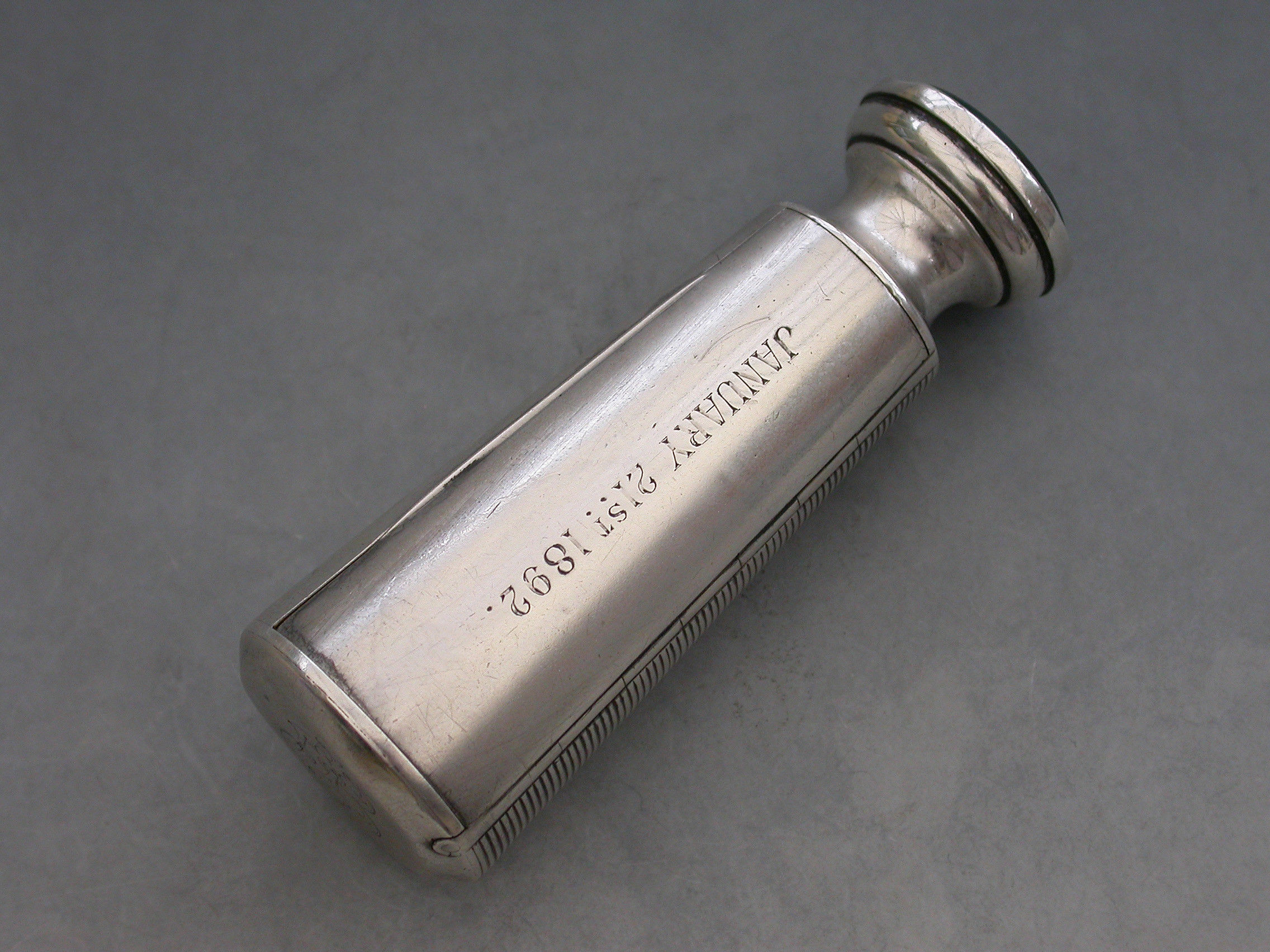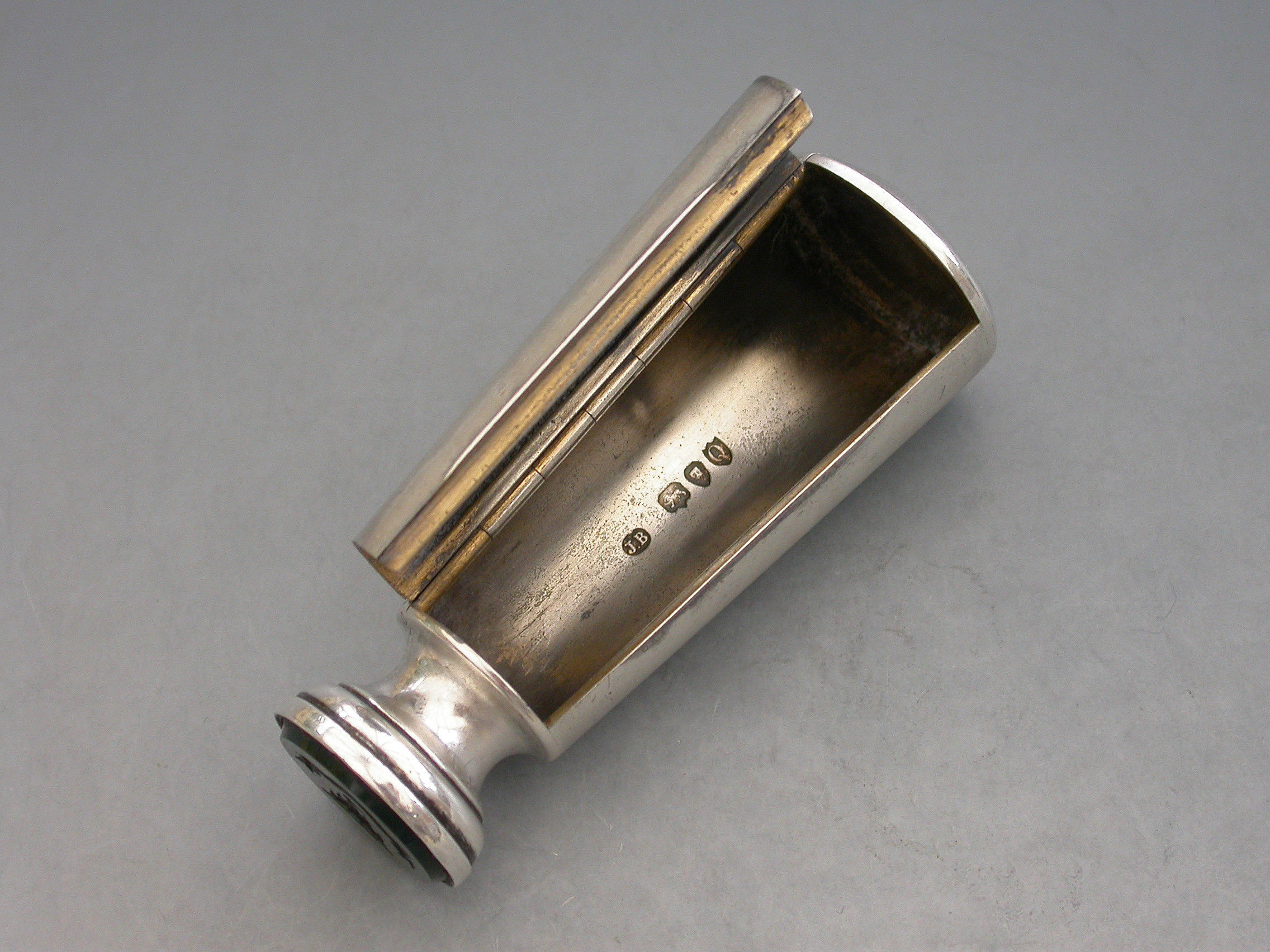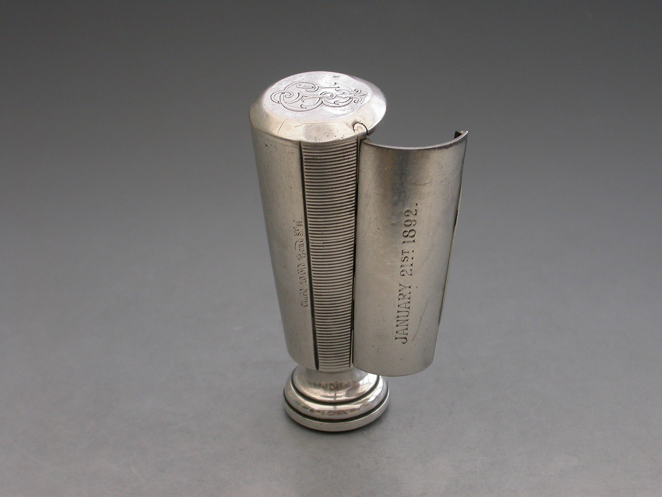 A good Victorian silver Vesta Case combined with a Table Seal, of flared cylindrical form with engraved striker to the side, the top engraved with a contemporary cypher and the hinged lid engraved with the date - January 21st 1892. The circular bloodstone seal matrix carved a crest and motto. Silver gilt interior.