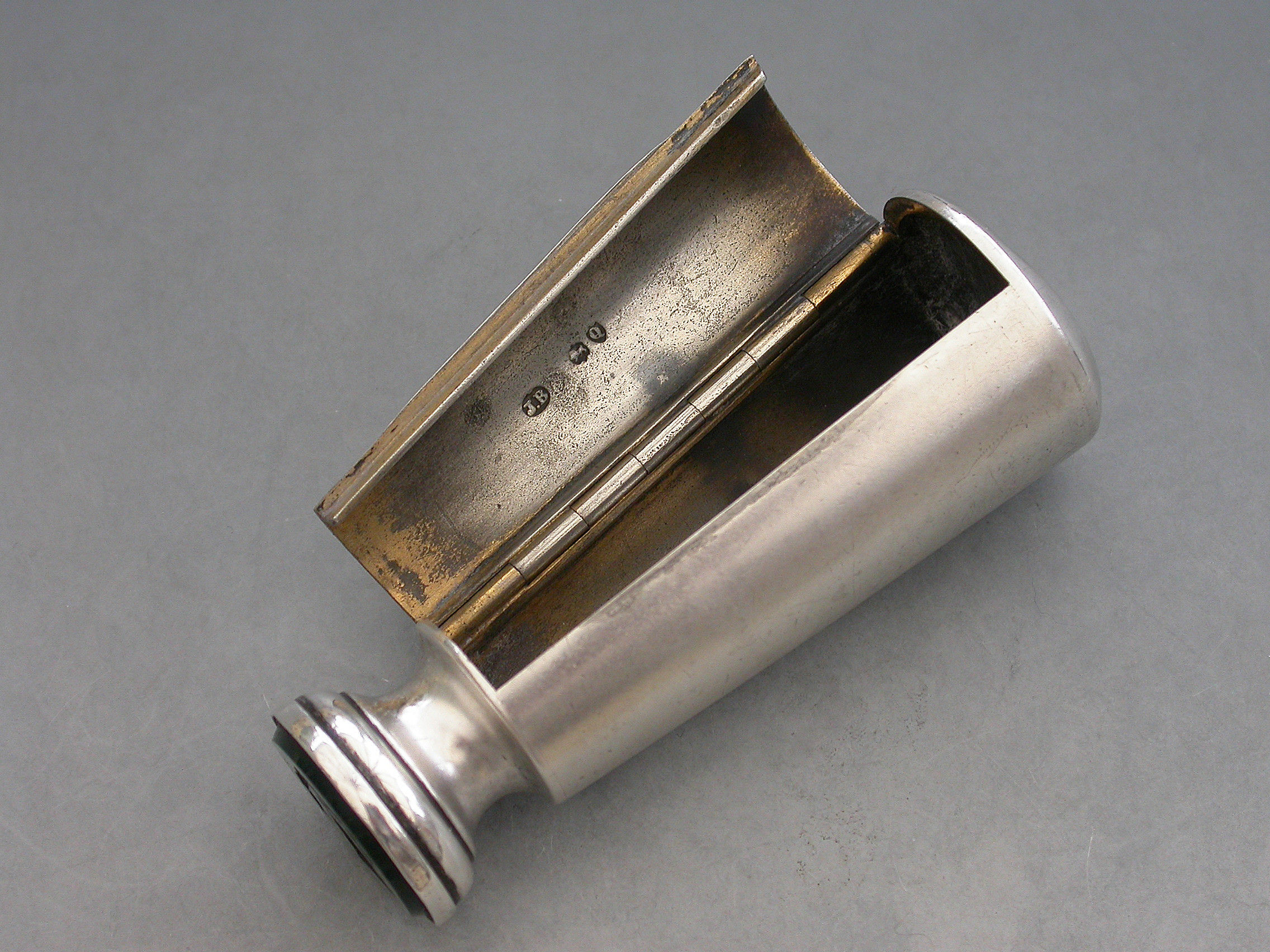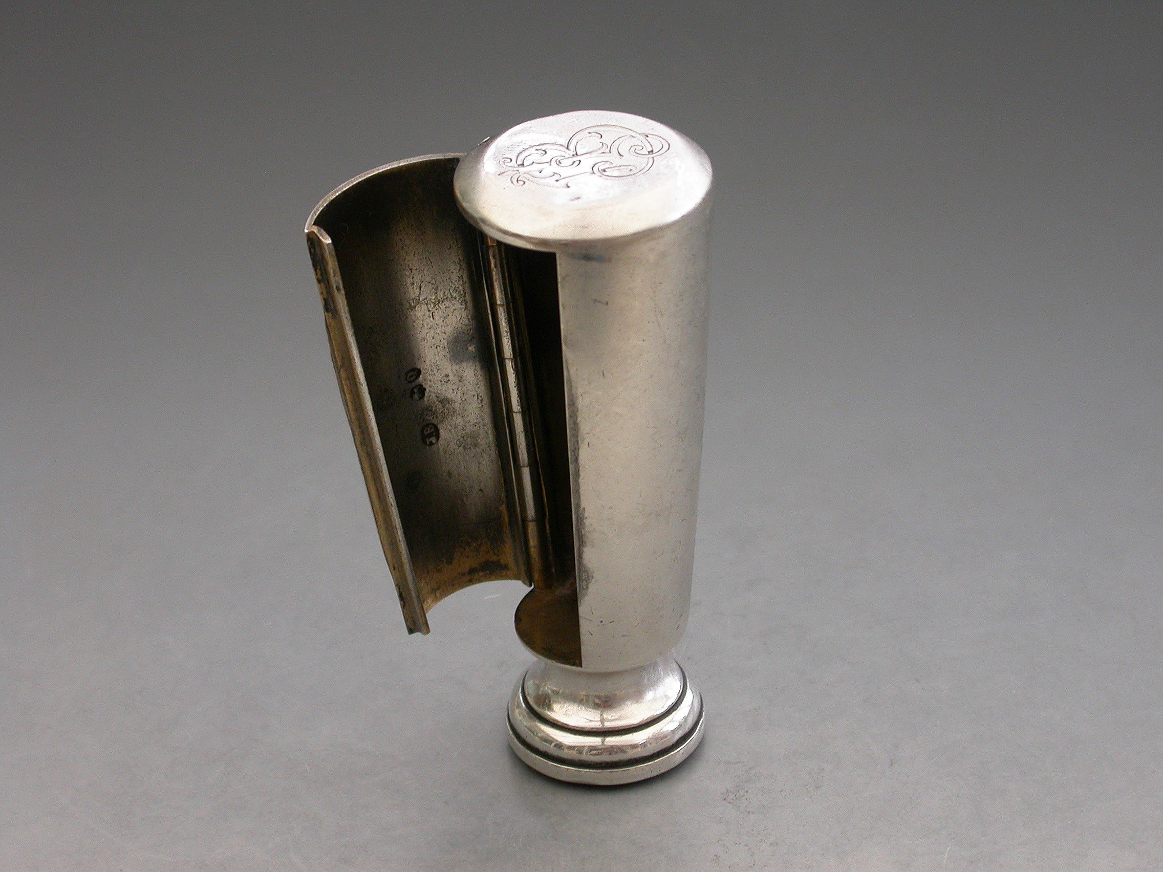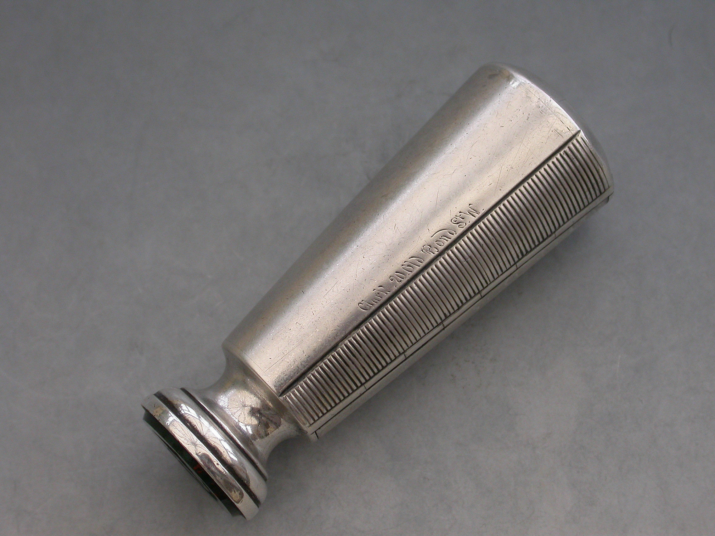 A good Victorian silver Vesta Case combined with a Table Seal, of flared cylindrical form with engraved striker to the side, the top engraved with a contemporary cypher and the hinged lid engraved with the date - January 21st 1892. The circular bloodstone seal matrix carved a crest and motto. Silver gilt interior.