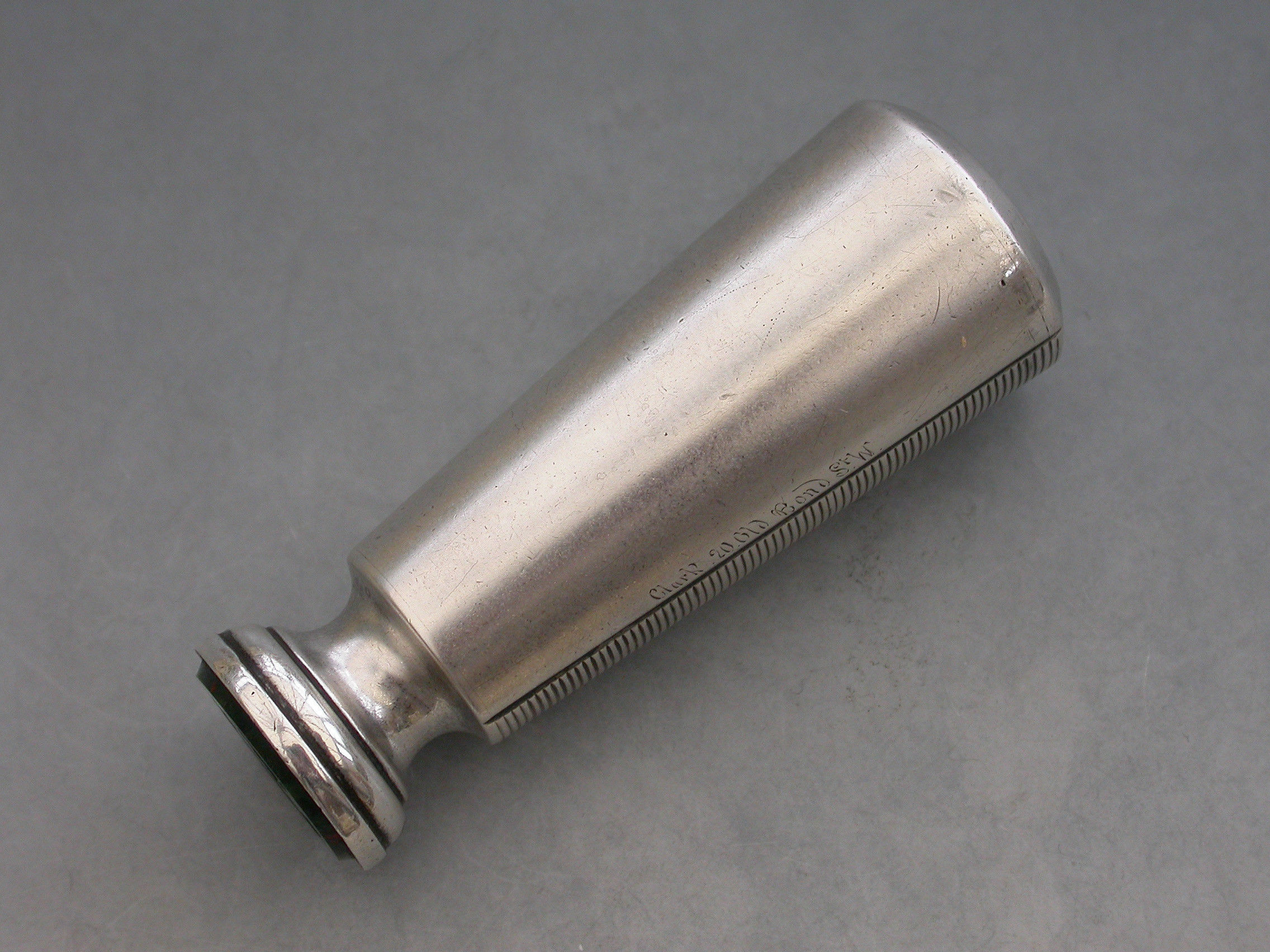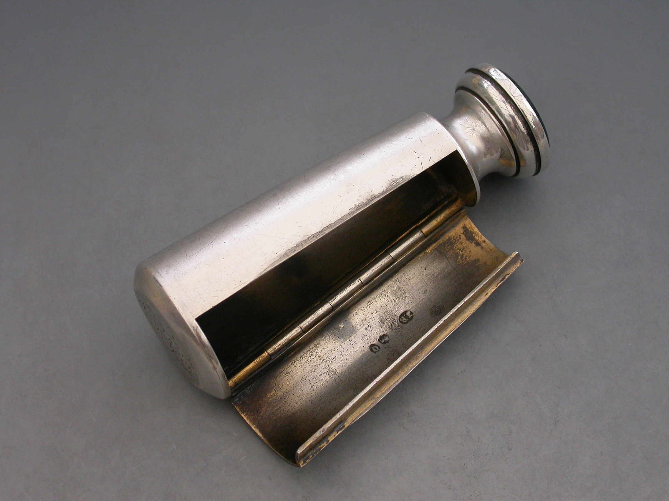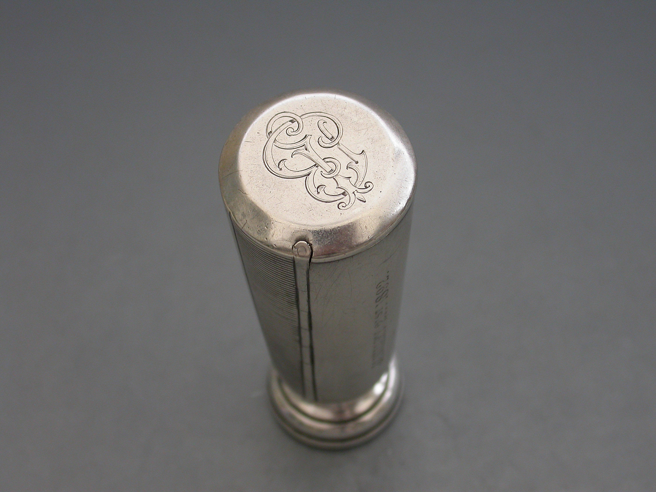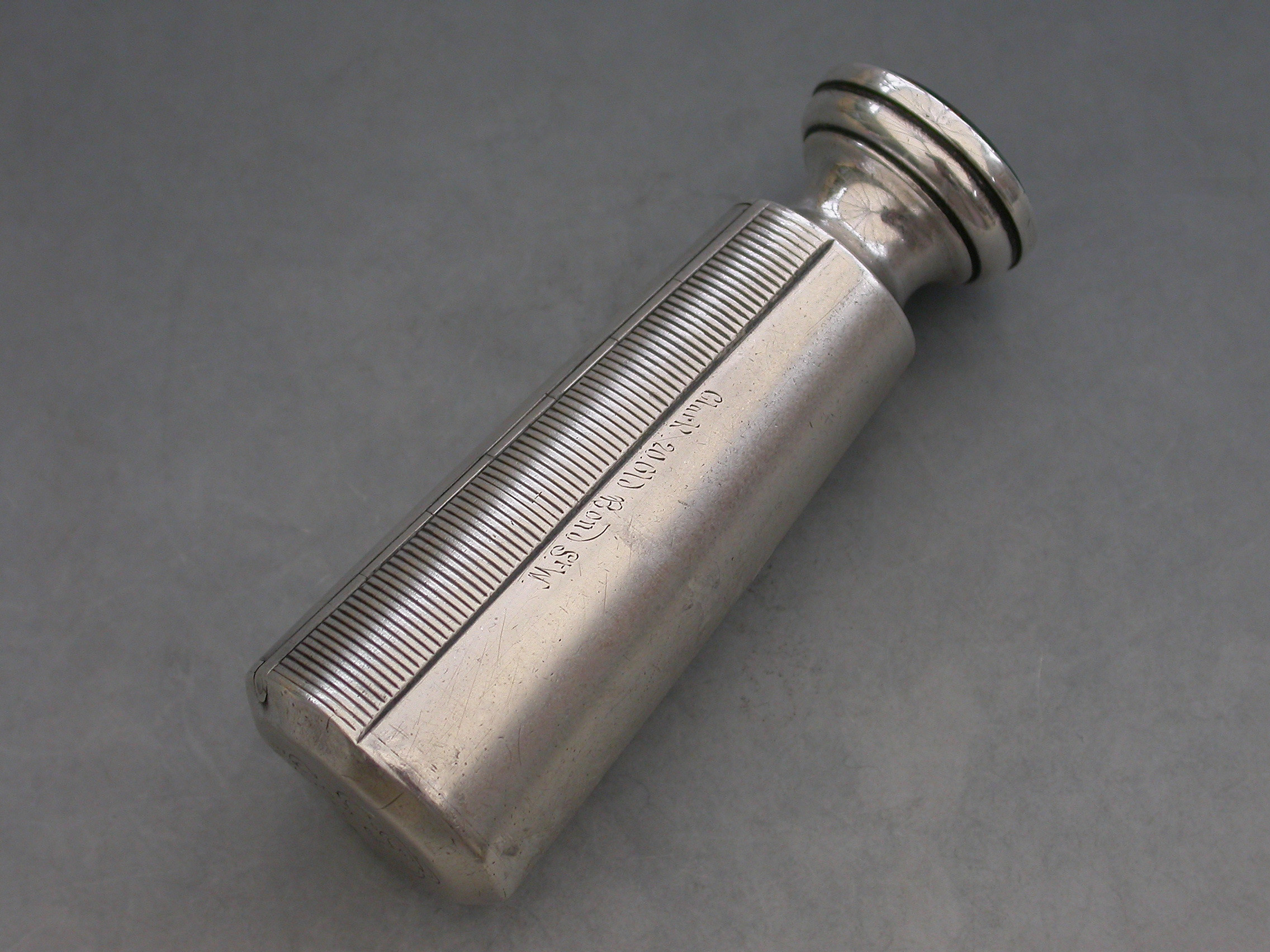 A good Victorian silver Vesta Case combined with a Table Seal, of flared cylindrical form with engraved striker to the side, the top engraved with a contemporary cypher and the hinged lid engraved with the date - January 21st 1892. The circular bloodstone seal matrix carved a crest and motto. Silver gilt interior.