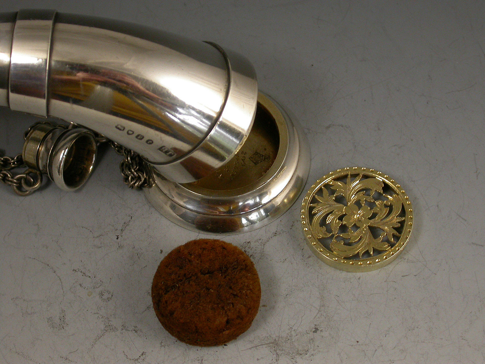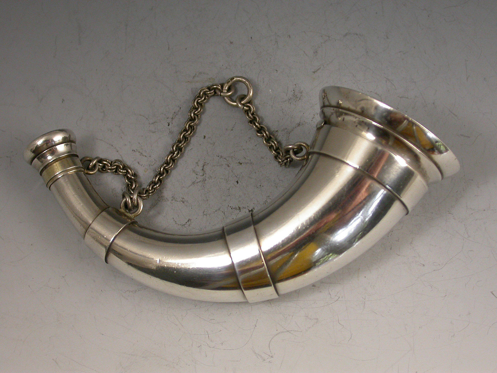 A good quality Victorian silver combined Scent Bottle and Vinaigrette in the form of a horn, with attached suspension chains, the larger hinged cover opening to reveal a silver gilt interior and pull-out pierced grille, the narrow end with screw off cover to the scent bottle. The cover engraved with contemporary initial ""I"".