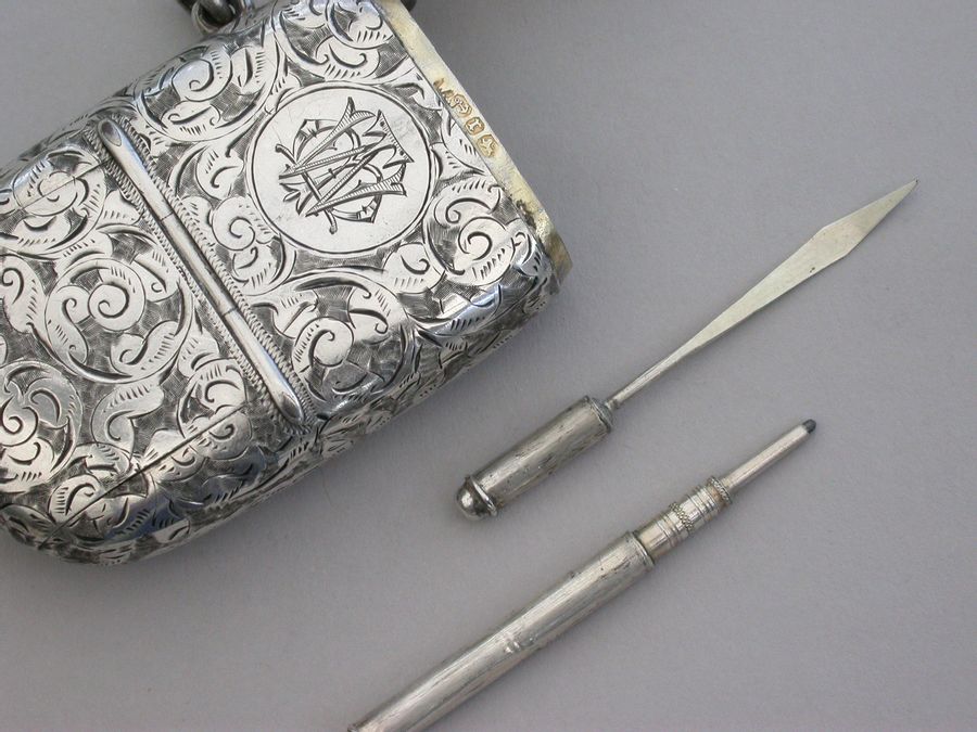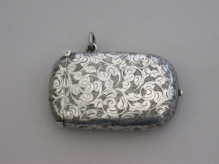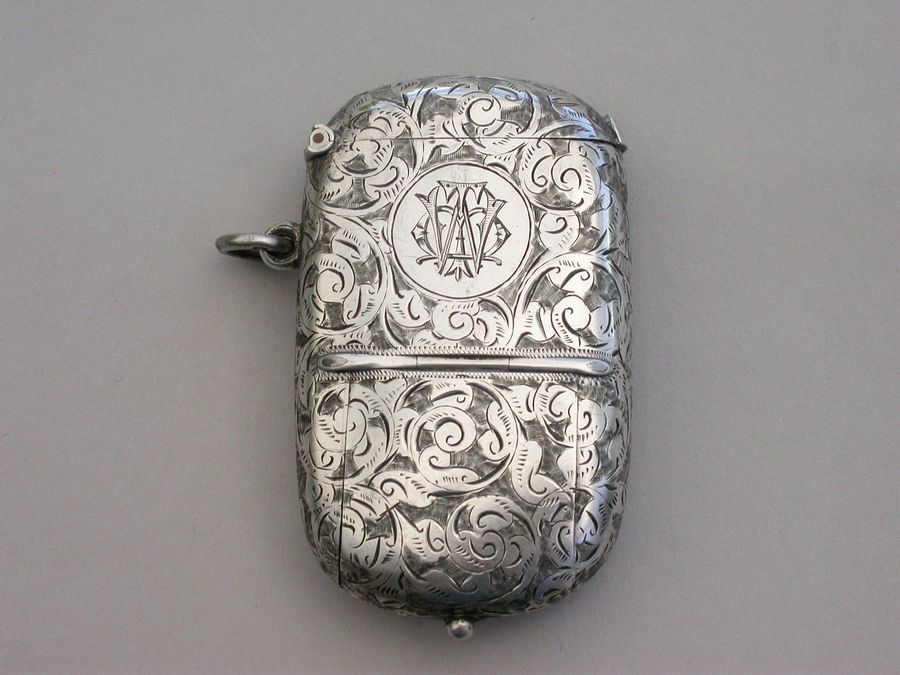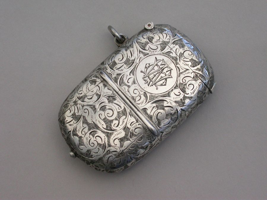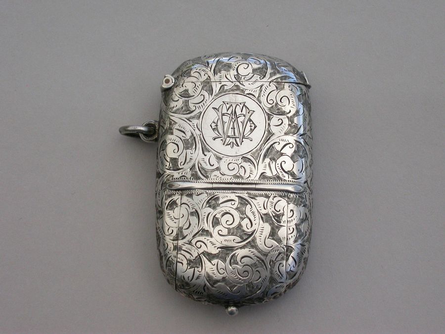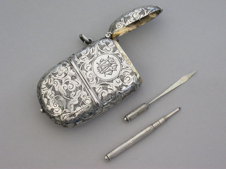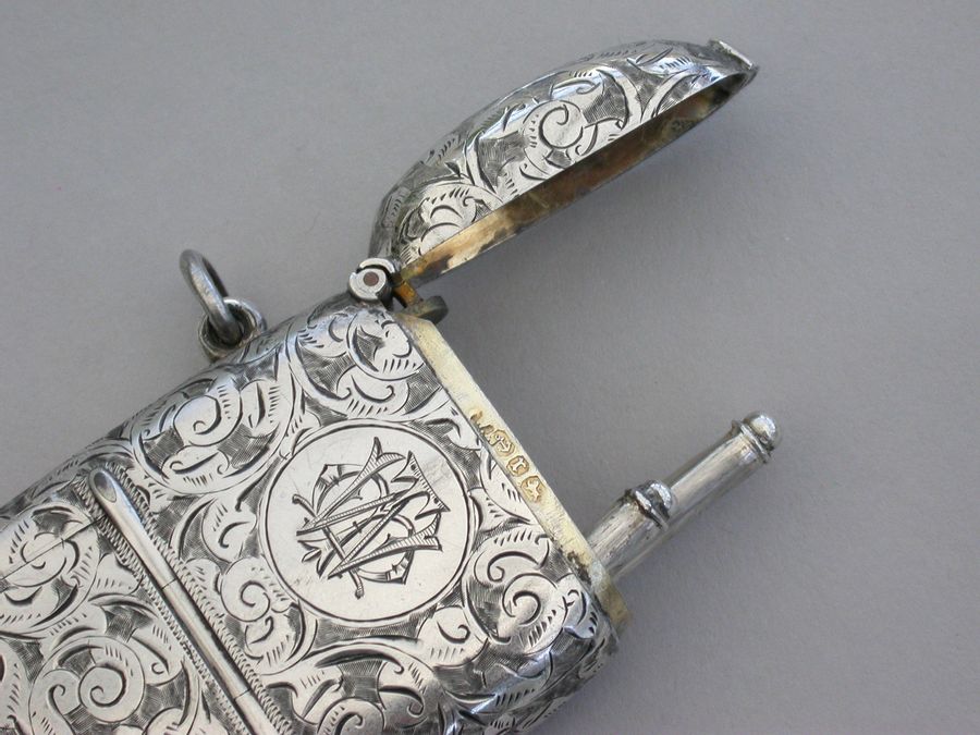 A good Victorian silver combined Vesta Case and Sovereign Holder with Stamp compartment, of rounded rectangular form with two hinged lids and silver gilt interior. Engraved on all sides with foliate scroll decoration, hinged flip-top lid and suspension ring. The Vesta compartment fitted with integral pull-out Propelling Pencil and Toothpick.