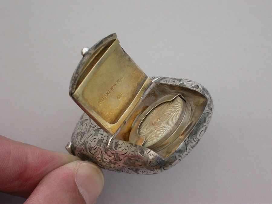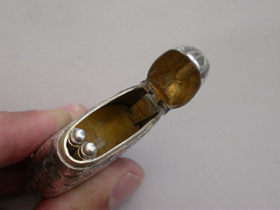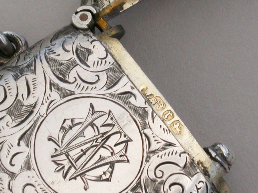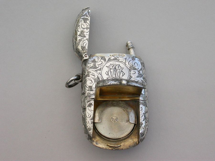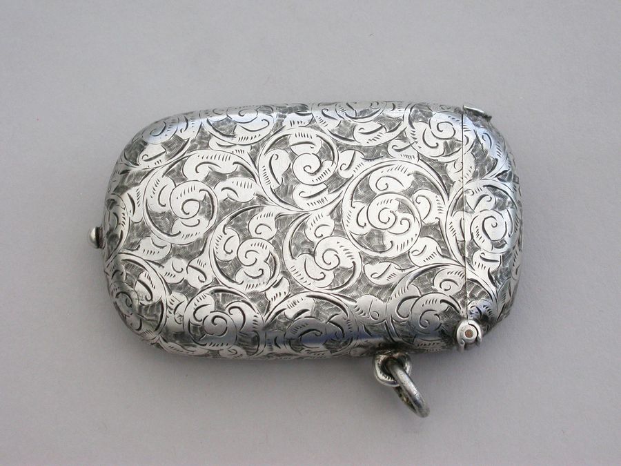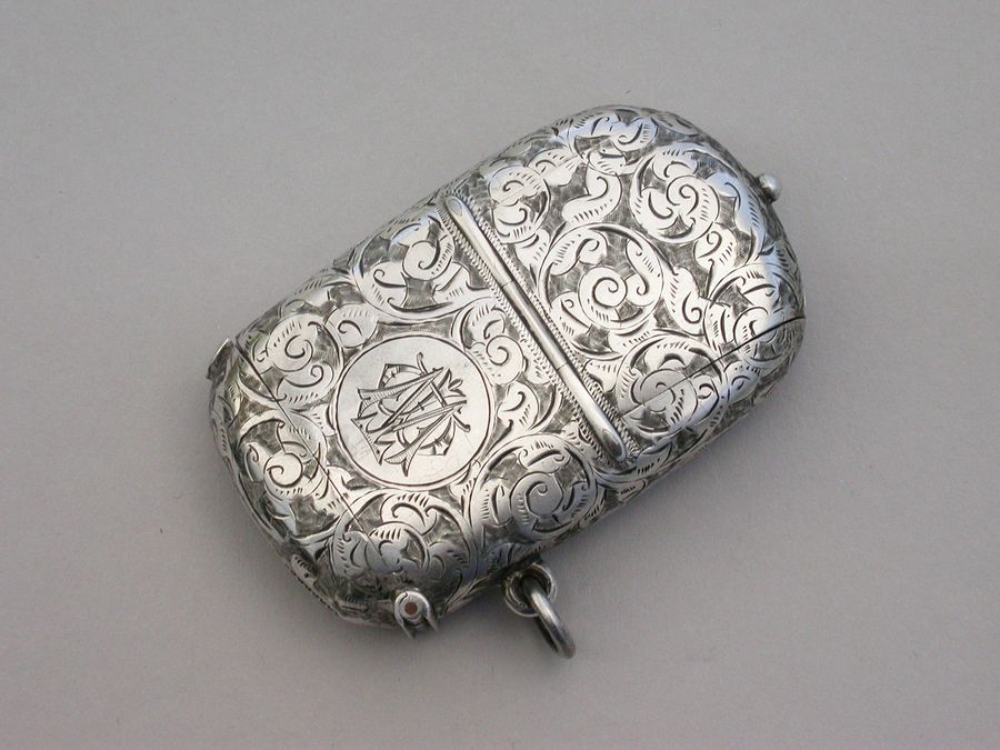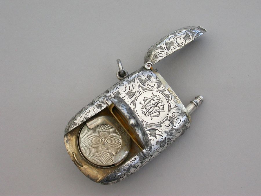 A good Victorian silver combined Vesta Case and Sovereign Holder with Stamp compartment, of rounded rectangular form with two hinged lids and silver gilt interior. Engraved on all sides with foliate scroll decoration, hinged flip-top lid and suspension ring. The Vesta compartment fitted with integral pull-out Propelling Pencil and Toothpick.