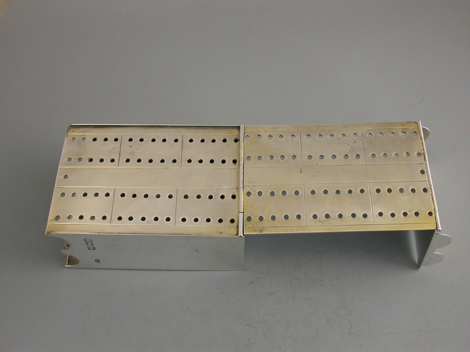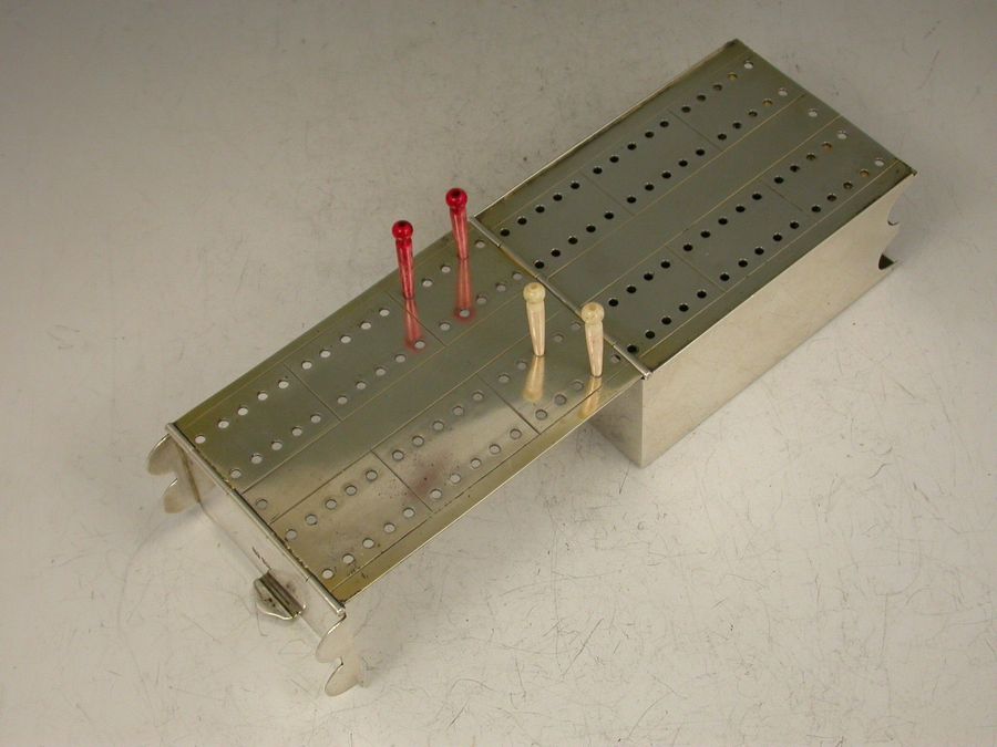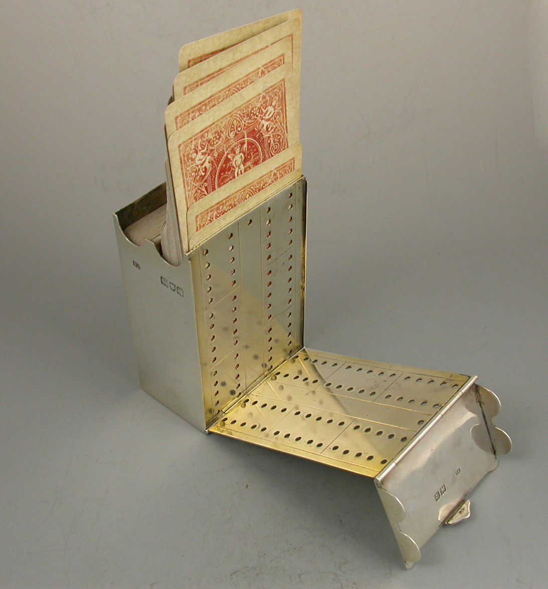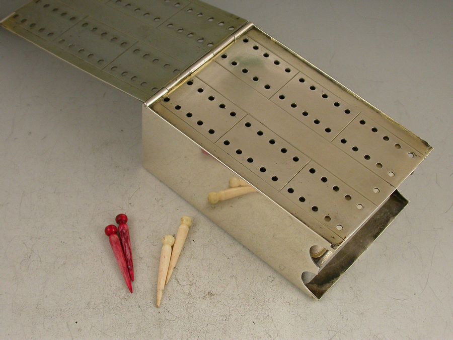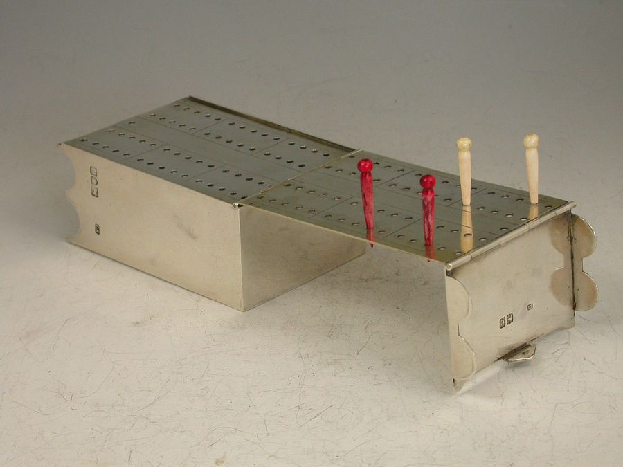 A rare Victorian silver combined Cribbage Board and Twin-Pack Card Box, the cover and side hinging open to form the gilded cribbage scoring board with drilled holes to accept the turned ivory pegs. The main body housing two packs of playing cards. Engraved with registered design number 315161.