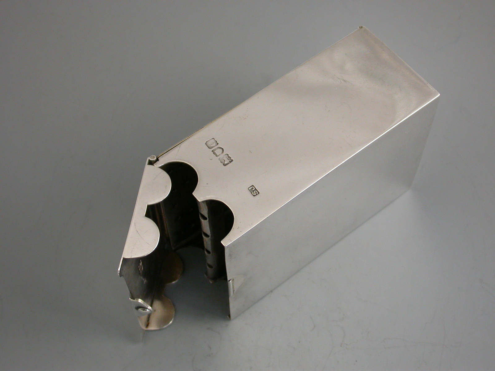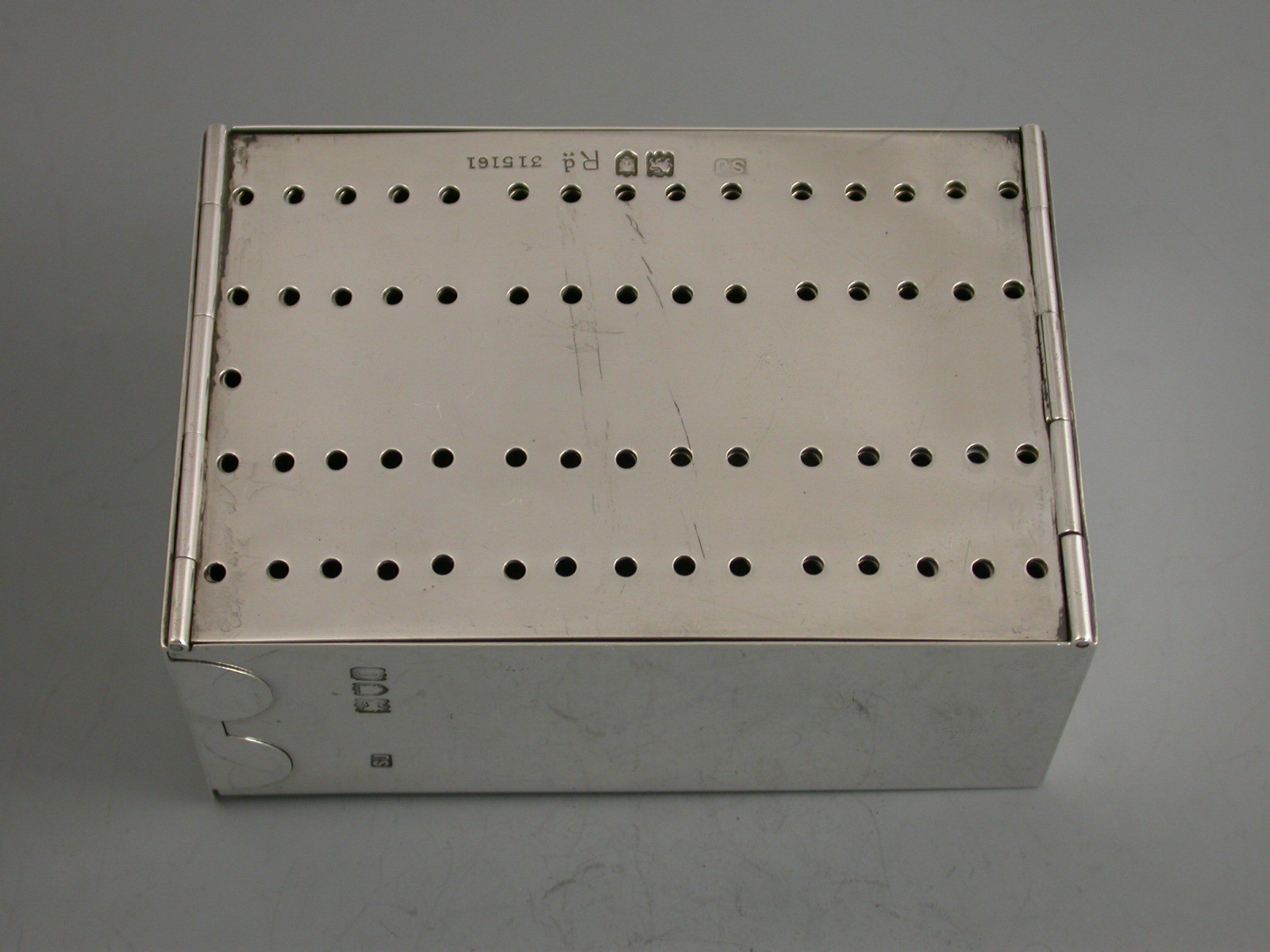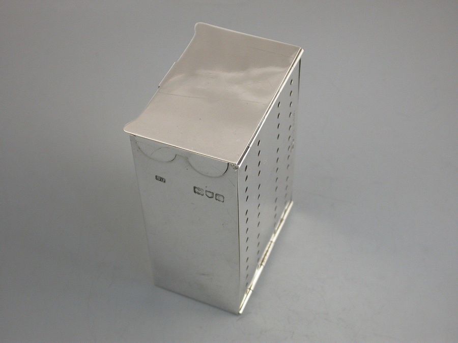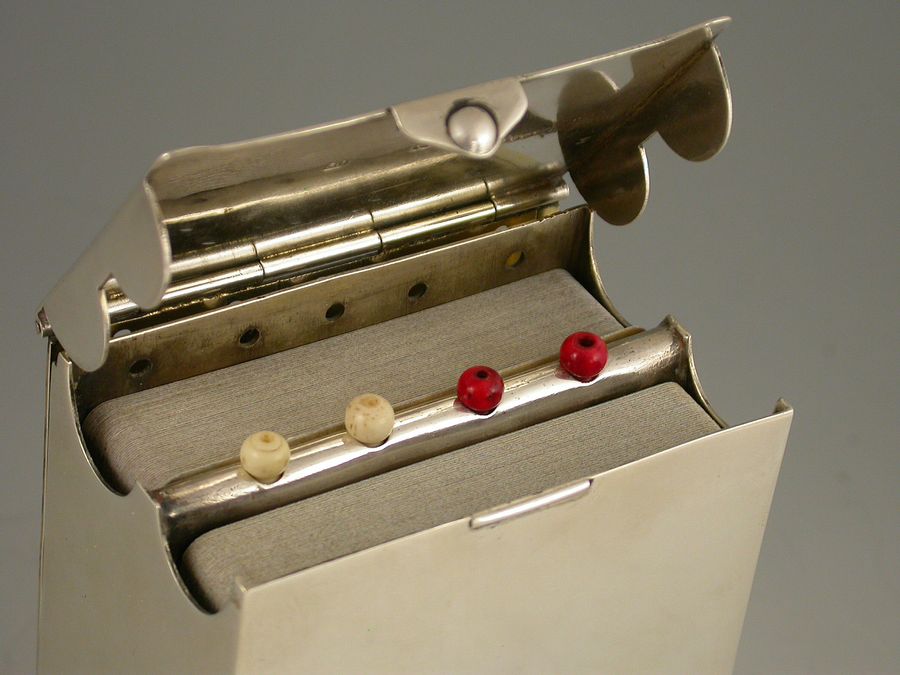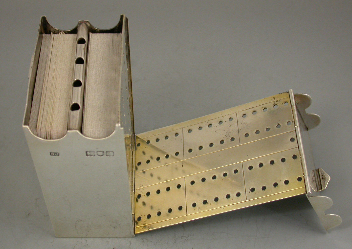 A rare Victorian silver combined Cribbage Board and Twin-Pack Card Box, the cover and side hinging open to form the gilded cribbage scoring board with drilled holes to accept the turned ivory pegs. The main body housing two packs of playing cards. Engraved with registered design number 315161.
