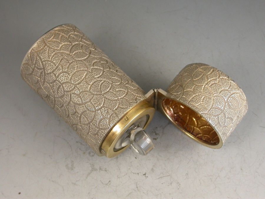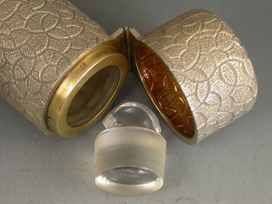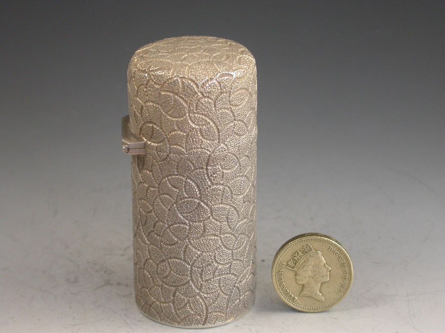 An unusual Victorian silver cylindrical Scent Bottle of larger than average size, the body deeply engraved with simulated crocodile skin decoration, the hinged cover opening to reveal a silver gilt interior with pull-out glass stopper.