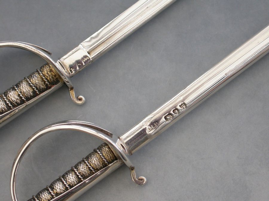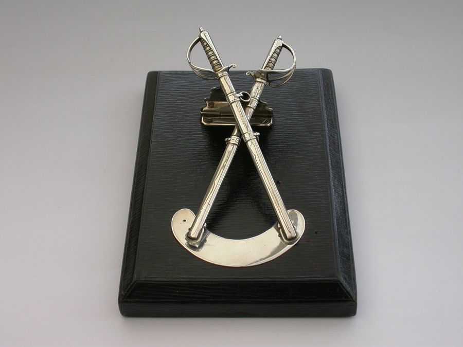 A Victorian silver Desk Clip mounted on a leather covered wooden base, formed as a crossed pair of British Officers Dress Swords complete with suspension rings and scabbards mounted on a sprung hinged stand. One sword is a propelling pencil and the other is a paper knife/letter opener.