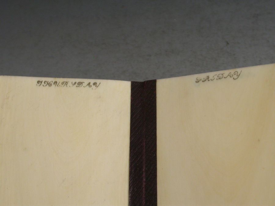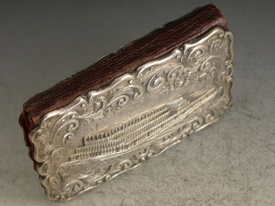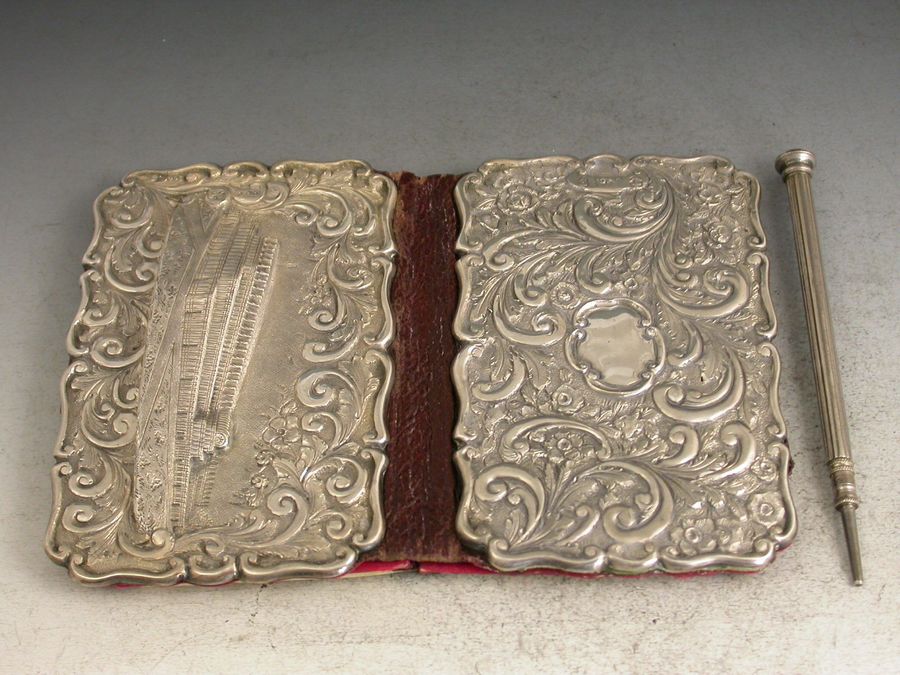 A fine Victorian silver Aide Memoire, the two silver covers chased and embossed with foliate scroll work, the cover with a raised scene depicting the Crystal Palace. Almost certainly made to commemorate the Great Exhibition of 1851. The red leather and silk lined interior complete with five ivory pages named with days of the week (excluding Sunday), the whole held together with a silver Propelling Pencil (stamped: Mordan & Co).