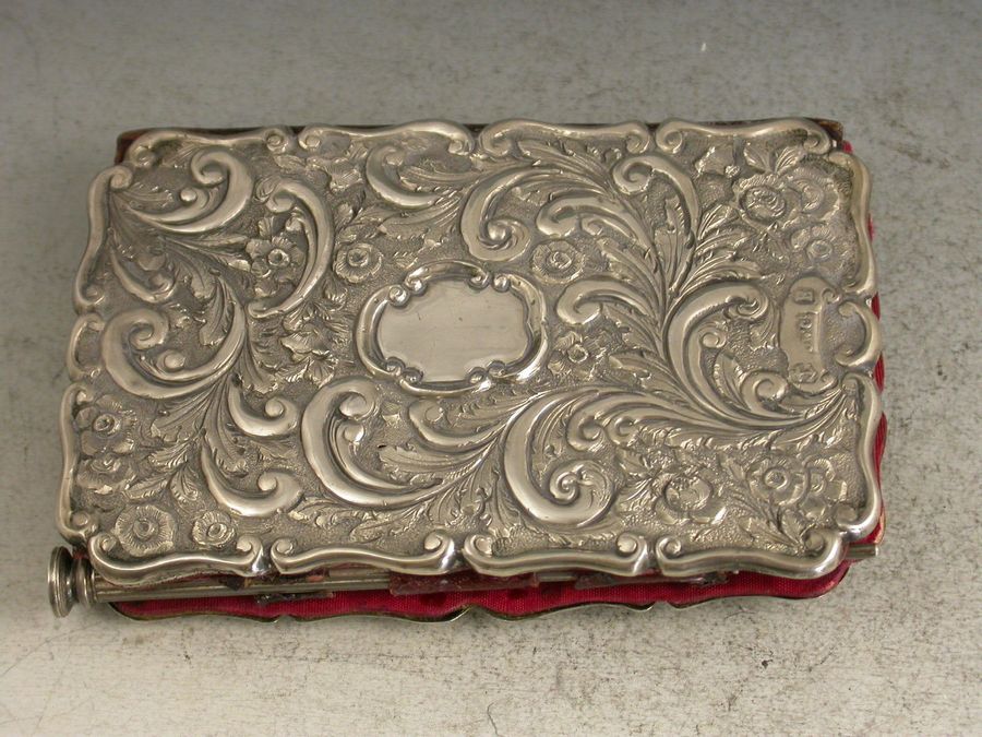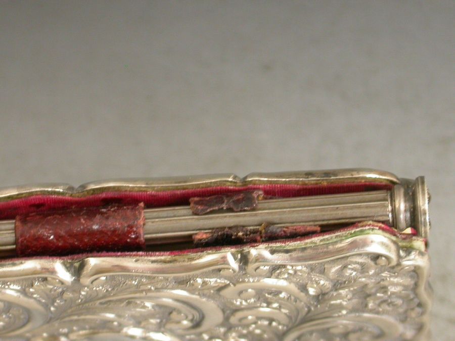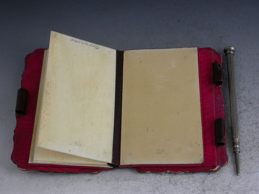 In very fine original condition, with no damage to the silver covers and complete with all five ivory pages and original silk lining. Slight damage to one of the leather pencil retaining loops. The Mordan and Co Propelling Pencil may not be original but fits perfectly.