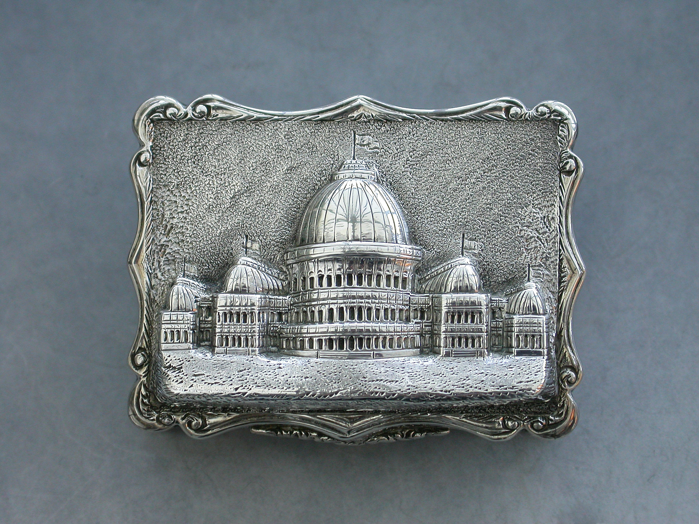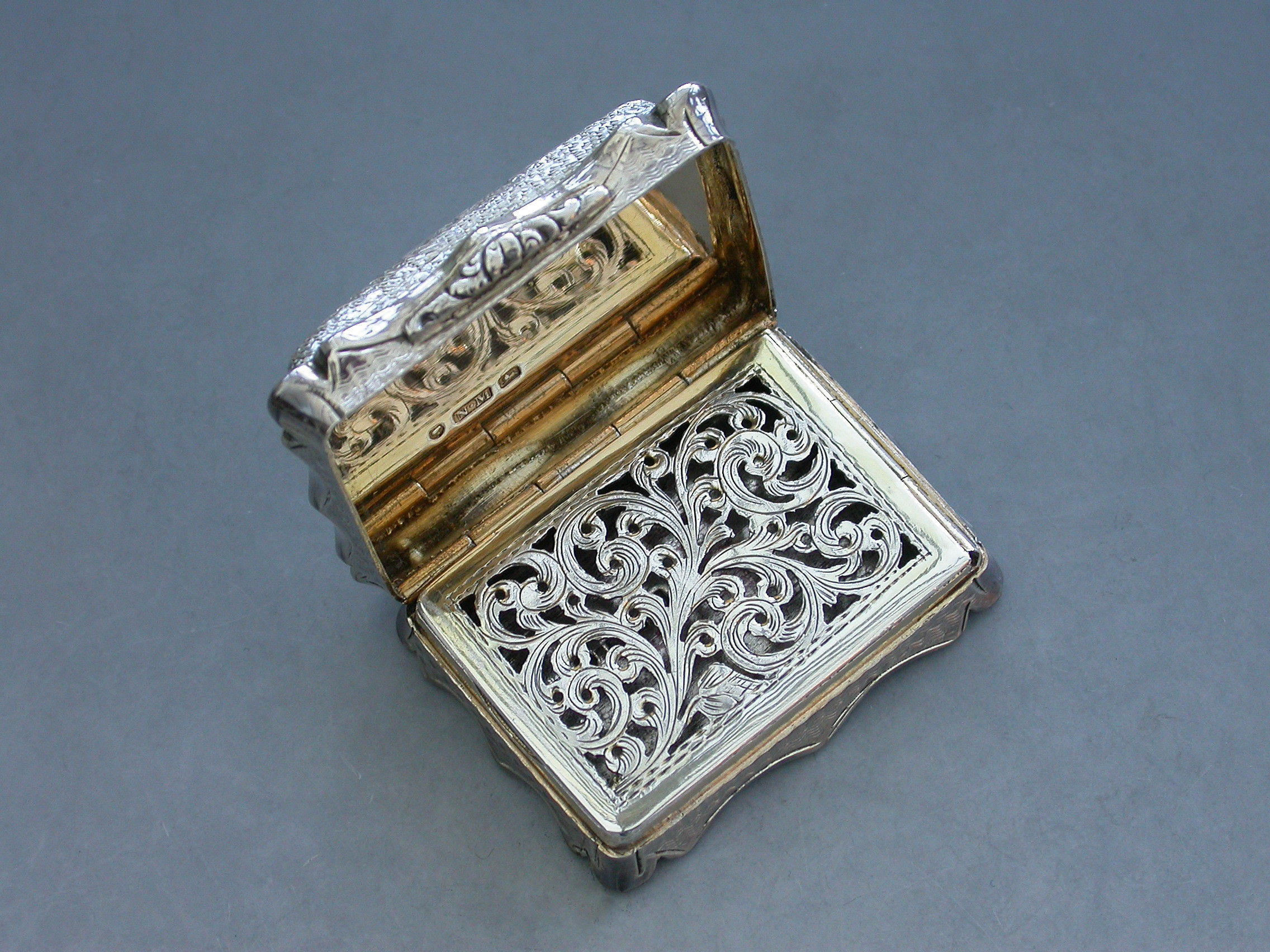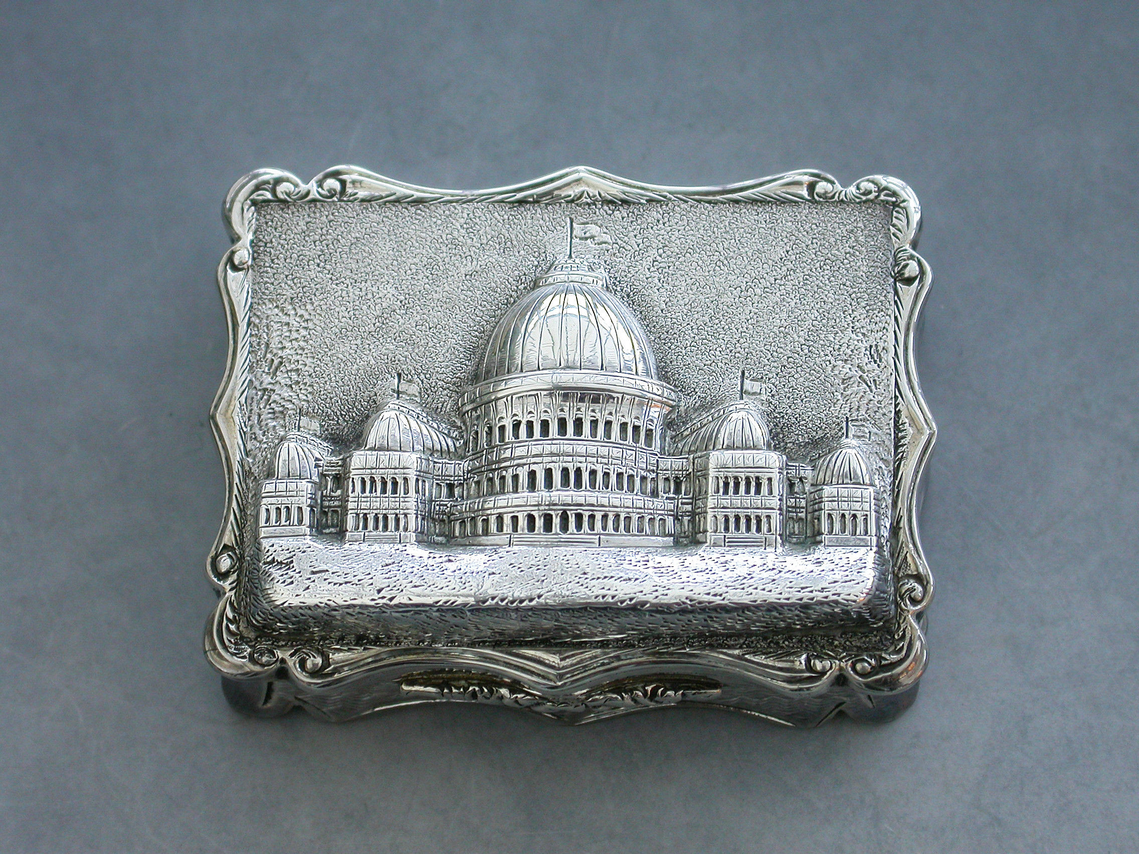An extremely rare Victorian silver “Castle Top” Vinaigrette of shaped rectangular form, the base and sides engraved with engine turned decoration and a cartouche engraved with a presentation inscription, the lid decorated with a scene depicting the “Industrial Exhibition Building” in Dublin, Ireland in high relief. The silver gilt interior with scroll pierced grille.