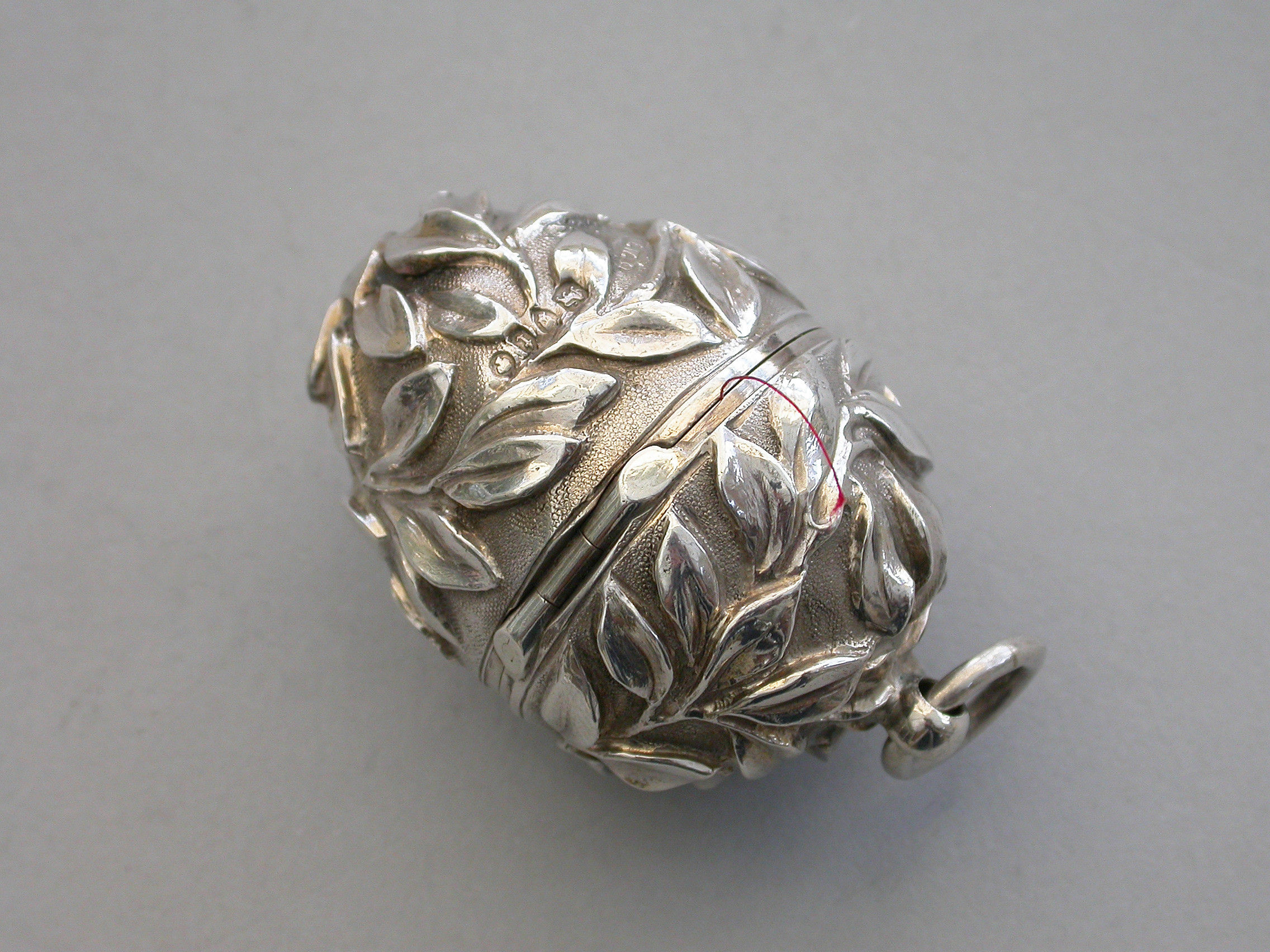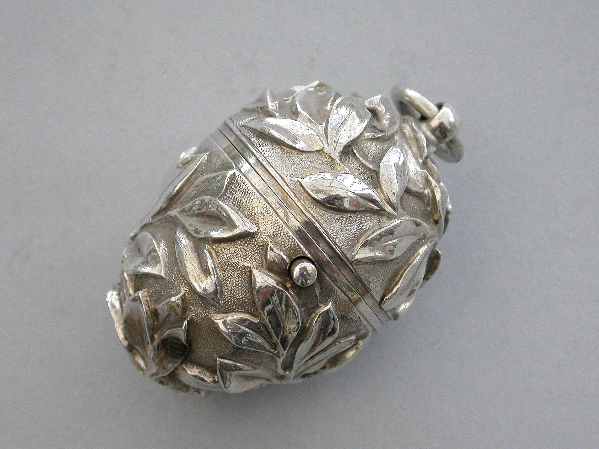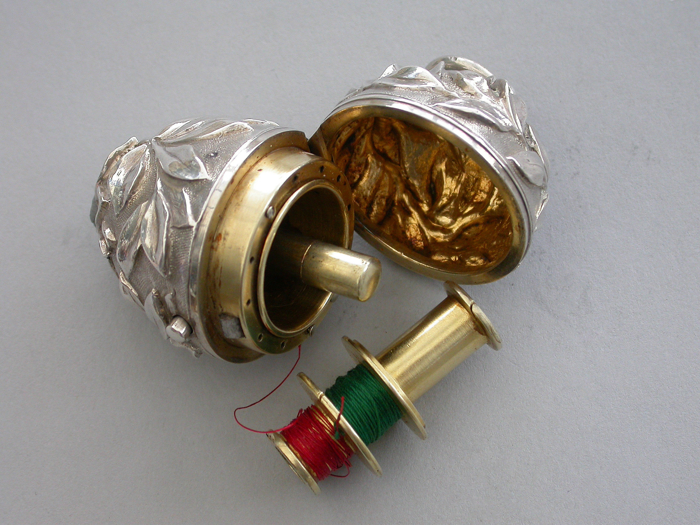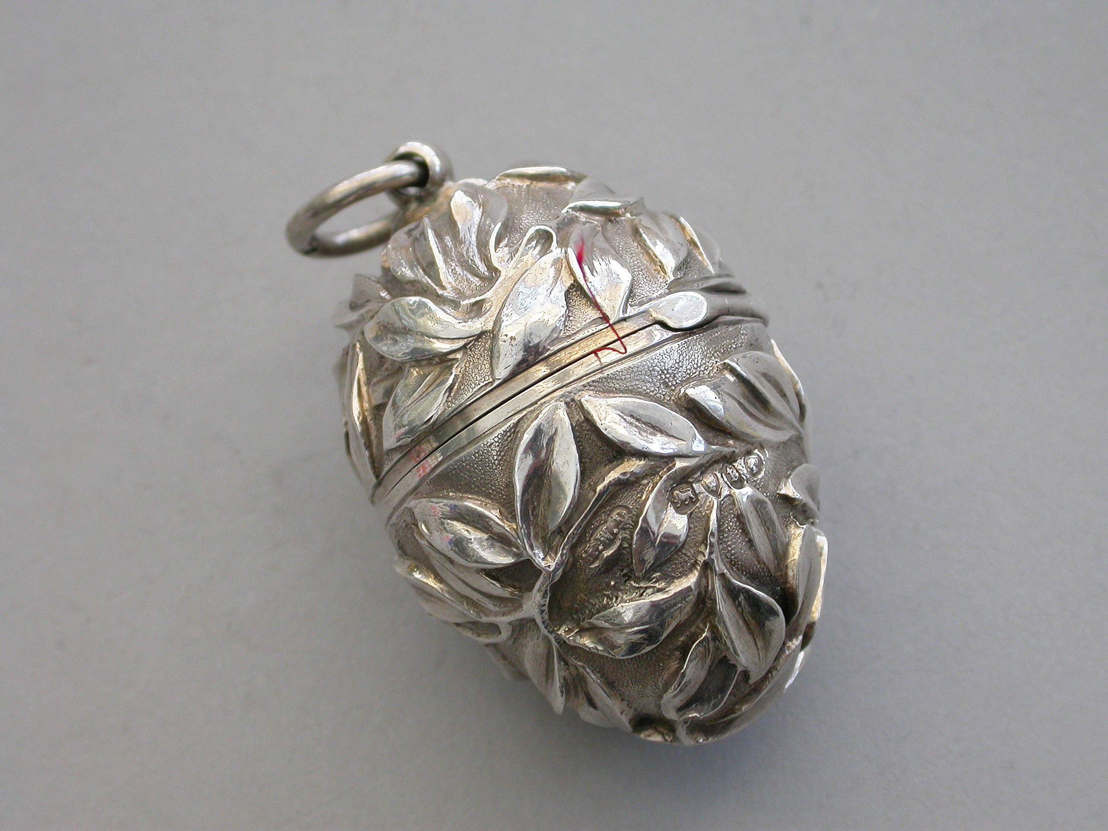 A very fine quality Victorian silver egg shaped Sewing Etui, the body profusely chased with branches of foliate decoration on a matt background, a push button opening mechanism to the hinged lid with attached suspension ring. Silver gilt interior complete with silk bobbins, a needle case with pull-off cover and pins stored around the rim.