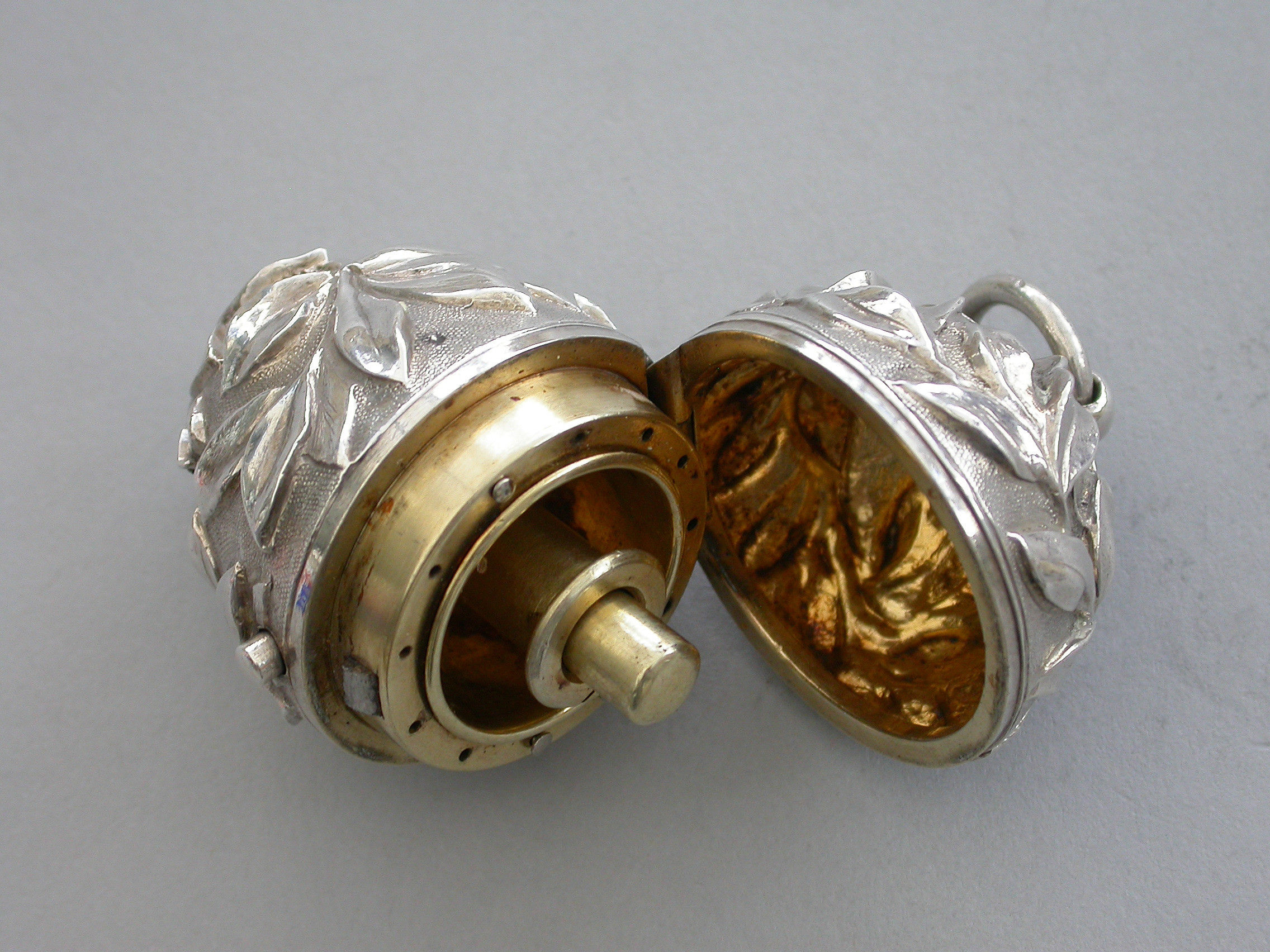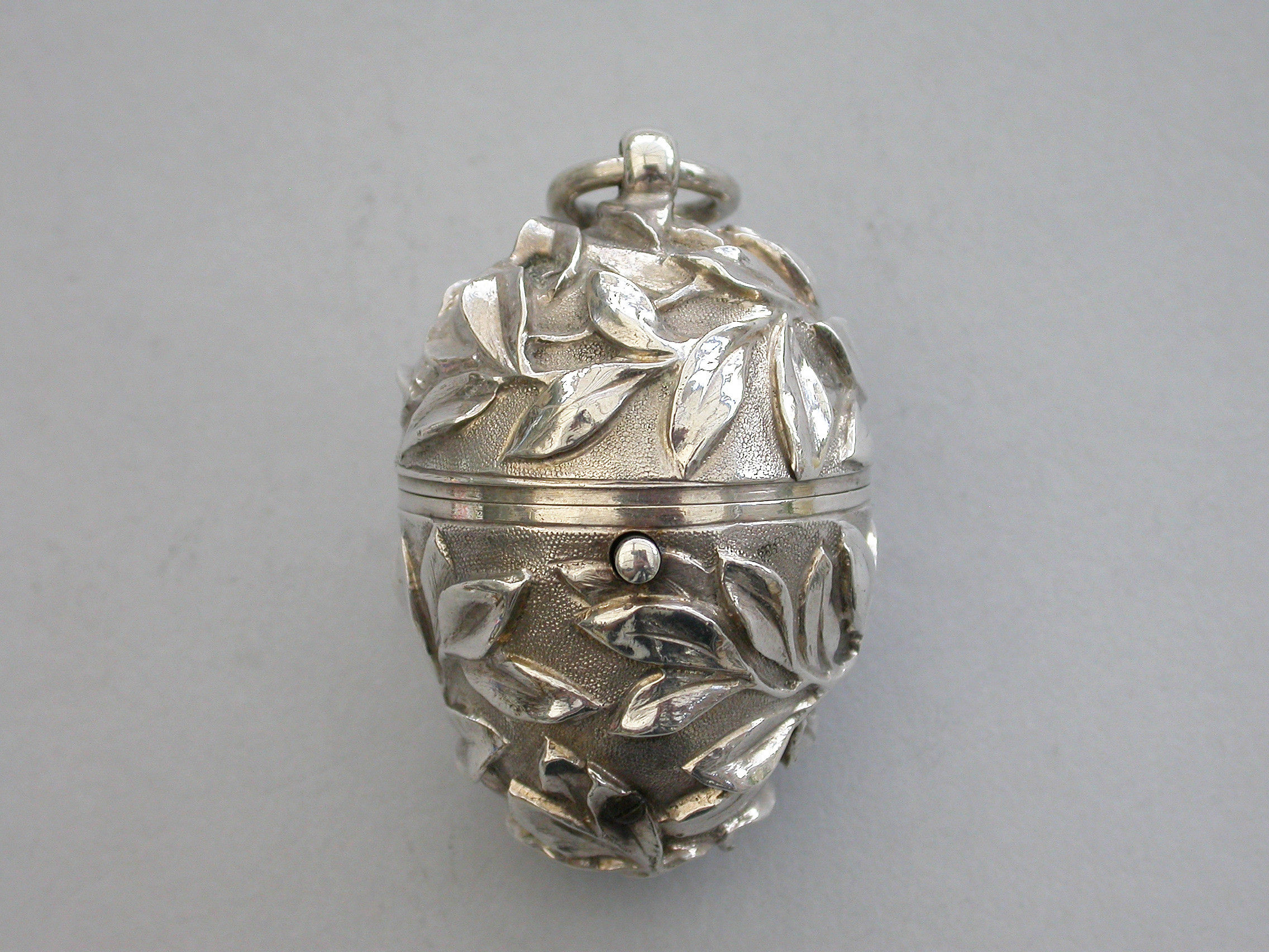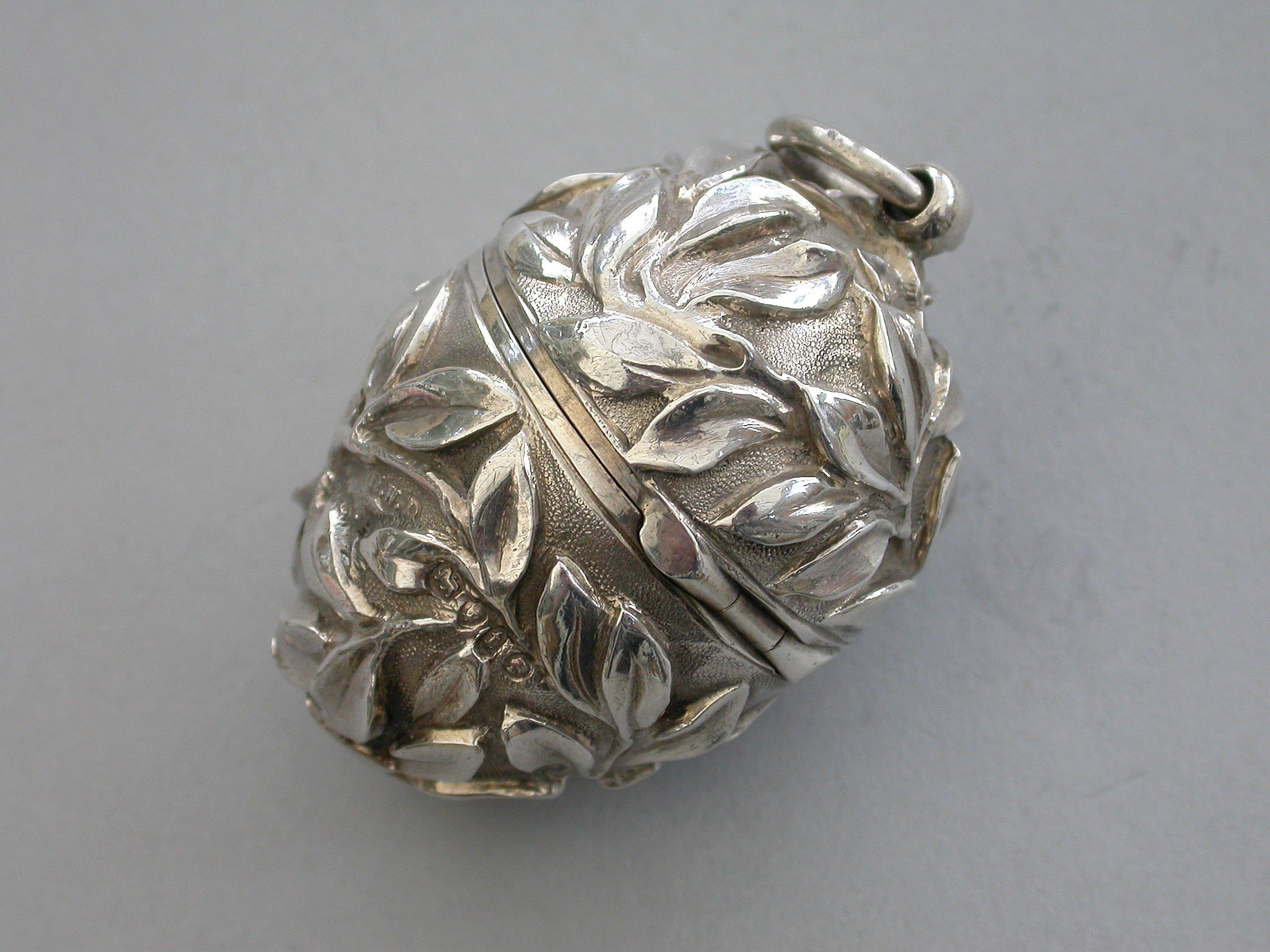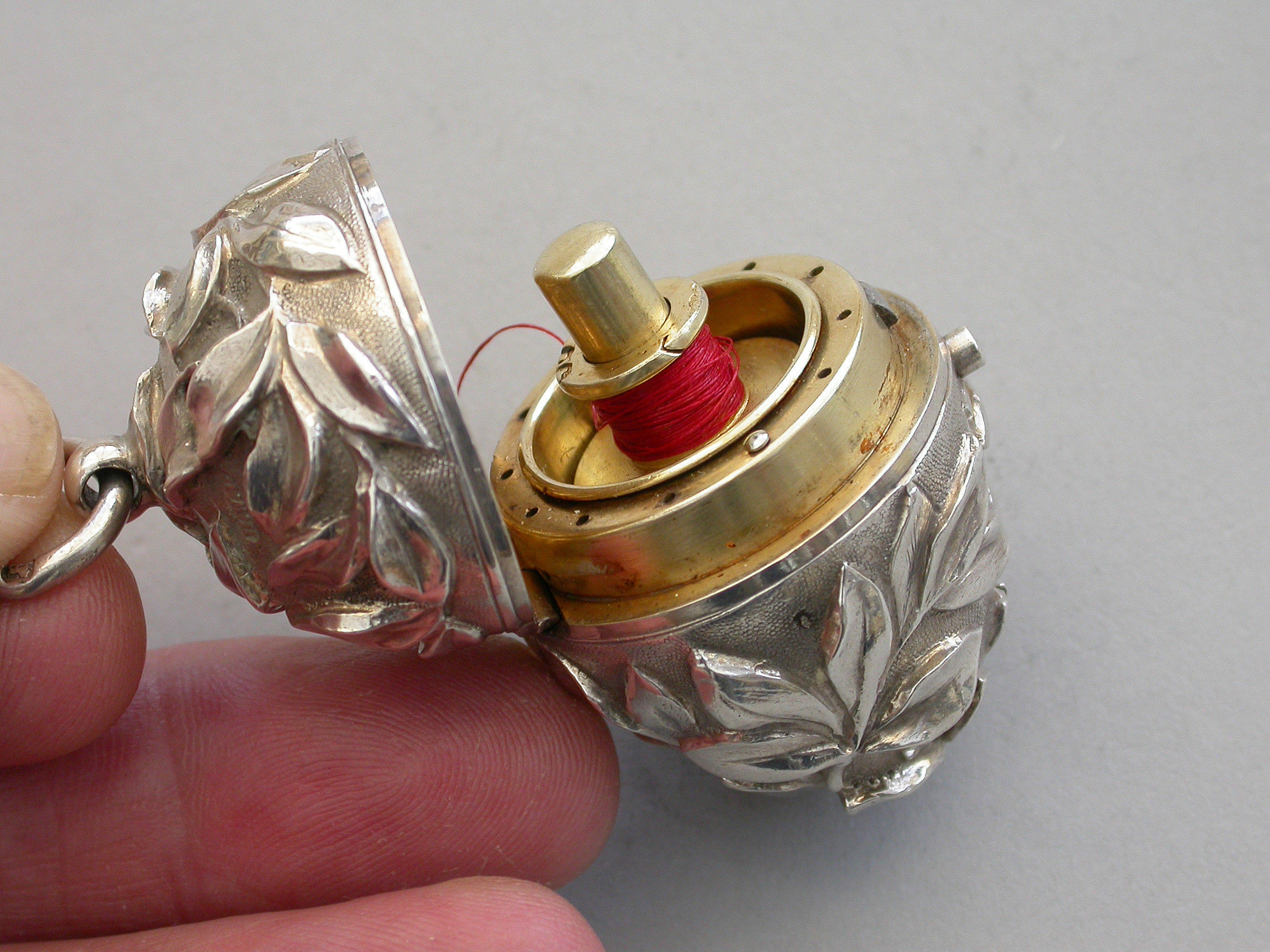 A very fine quality Victorian silver egg shaped Sewing Etui, the body profusely chased with branches of foliate decoration on a matt background, a push button opening mechanism to the hinged lid with attached suspension ring. Silver gilt interior complete with silk bobbins, a needle case with pull-off cover and pins stored around the rim.