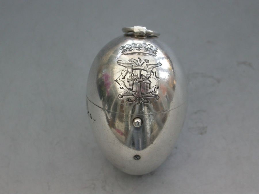 A very fine Victorian silver egg shaped Sewing Etui, the plain silver body engraved with a Viscount's Coronet and Cypher, a push button mechanism to the hinged lid opening to reveal the silver gilt interior complete with a contemporary silver thimble, silk bobbins, a needle case with pull-off cover and pins stored in the pierced rim.