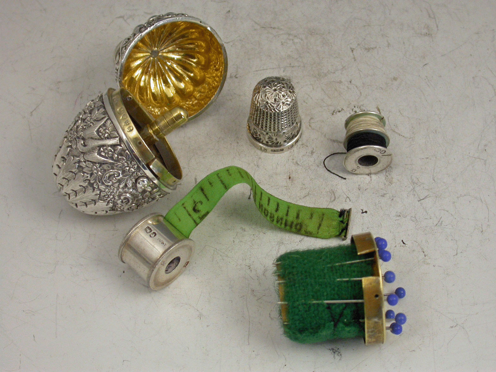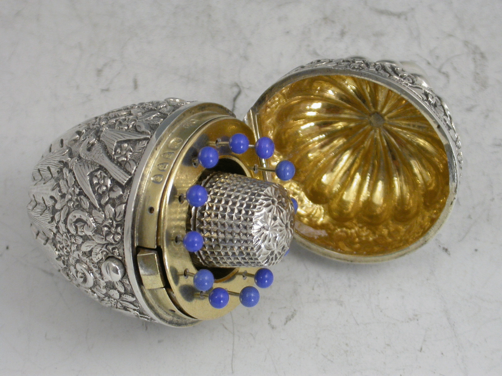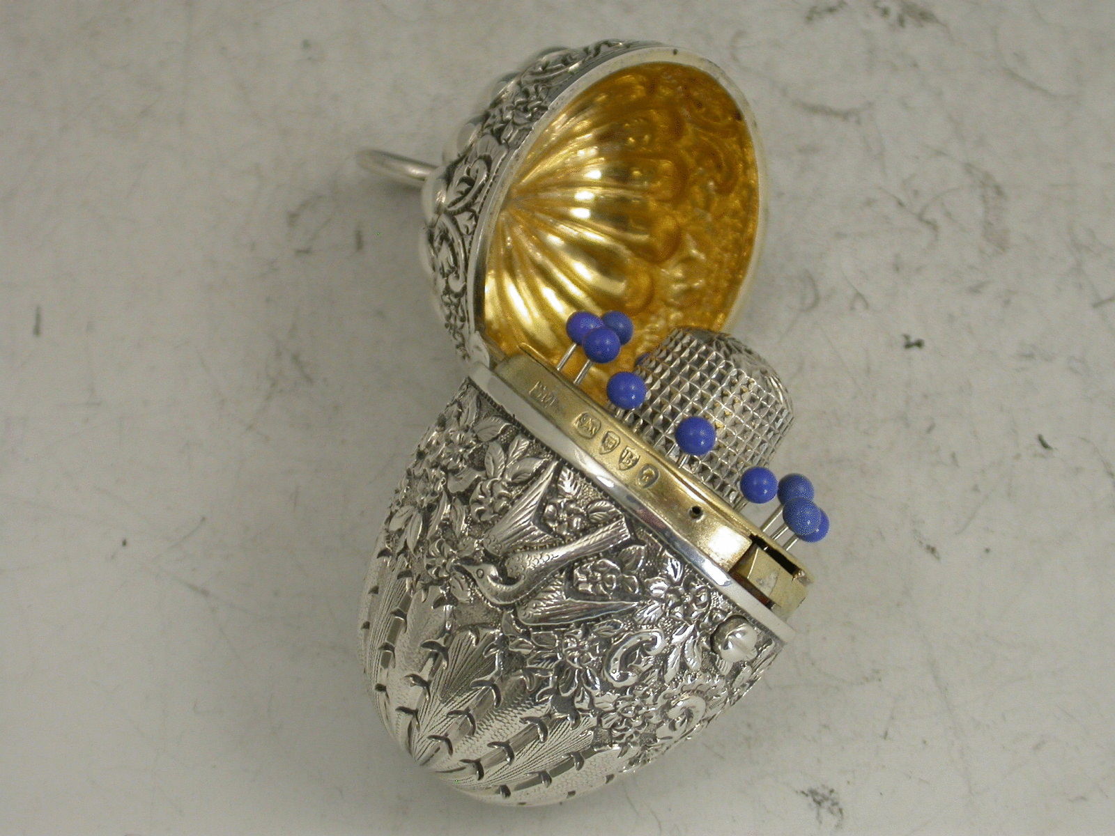 A very fine Victorian silver egg shaped Sewing Etui, the partly fluted body profusely chased and engraved with exotic birds amongst foliage. The hinged cover opening to reveal the gilded interior fitted with two bobbins, a tape measure, a pin holder and a needle case. Also containing a slightly later thimble (by Henry Griffiths, Chester 1887). Suspension ring to lid.