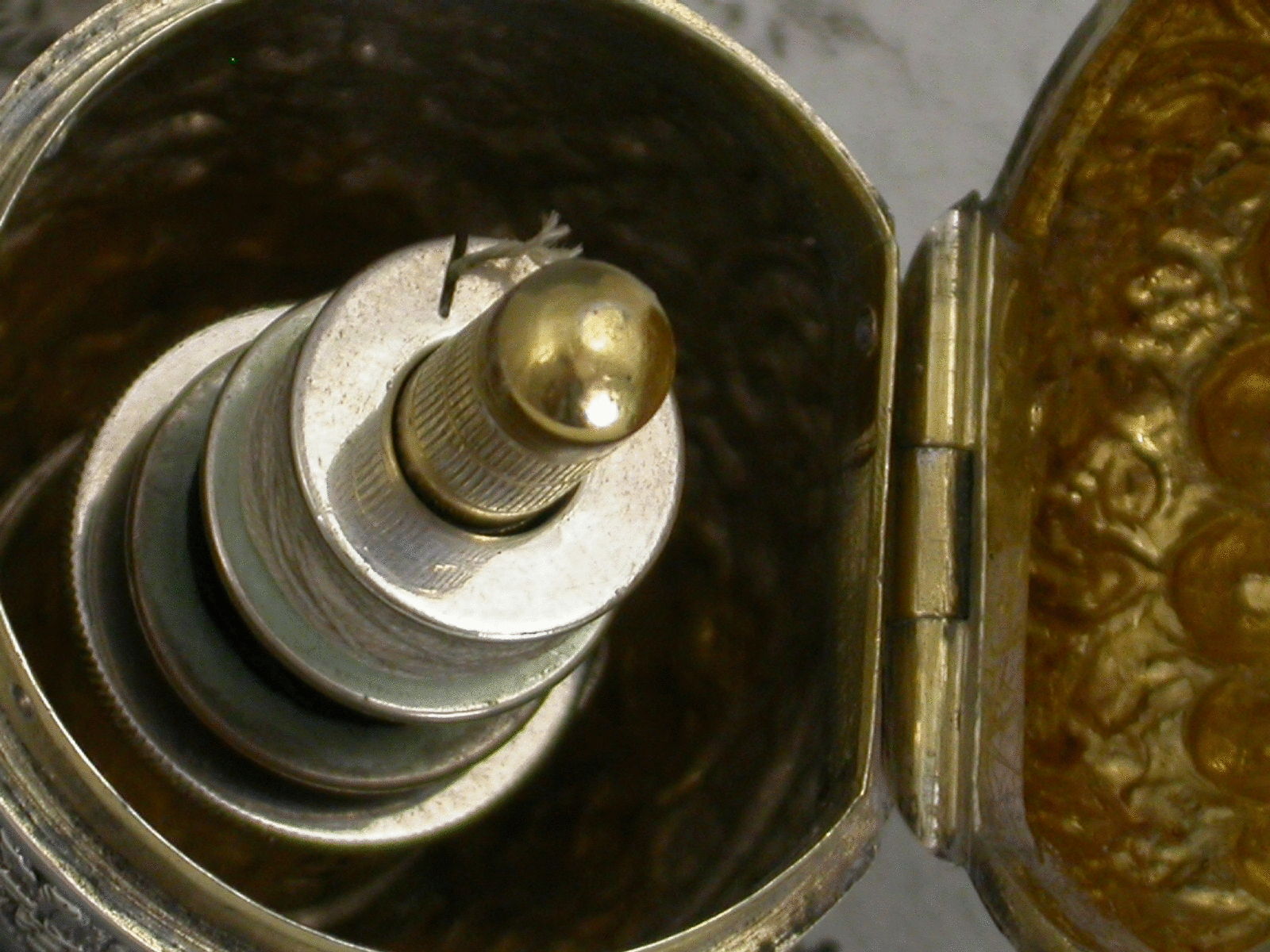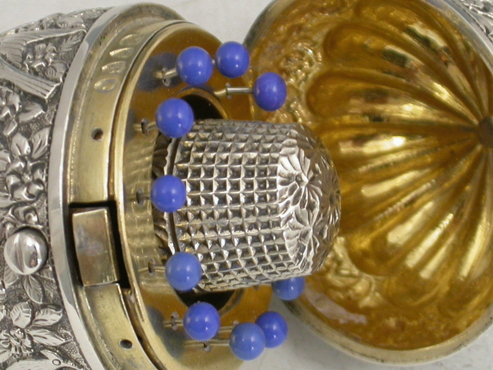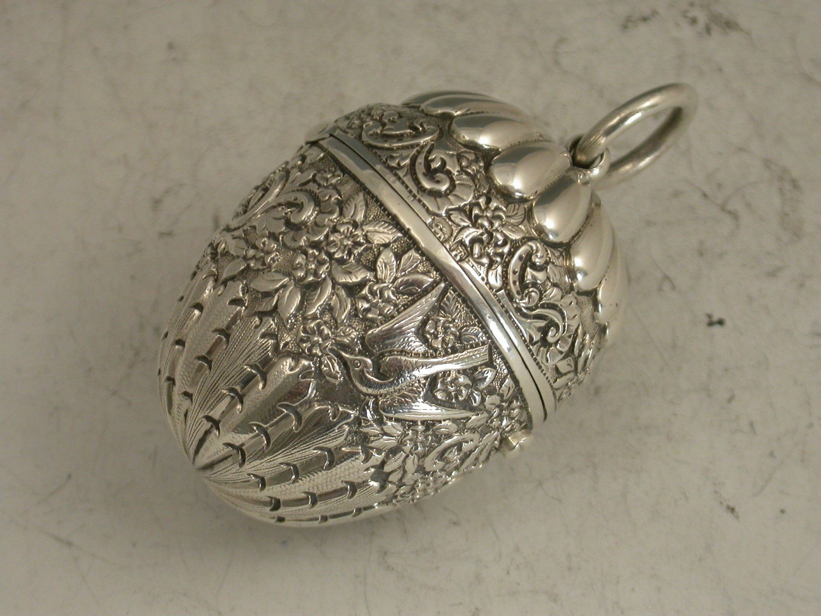A very fine Victorian silver egg shaped Sewing Etui, the partly fluted body profusely chased and engraved with exotic birds amongst foliage. The hinged cover opening to reveal the gilded interior fitted with two bobbins, a tape measure, a pin holder and a needle case. Also containing a slightly later thimble (by Henry Griffiths, Chester 1887). Suspension ring to lid.