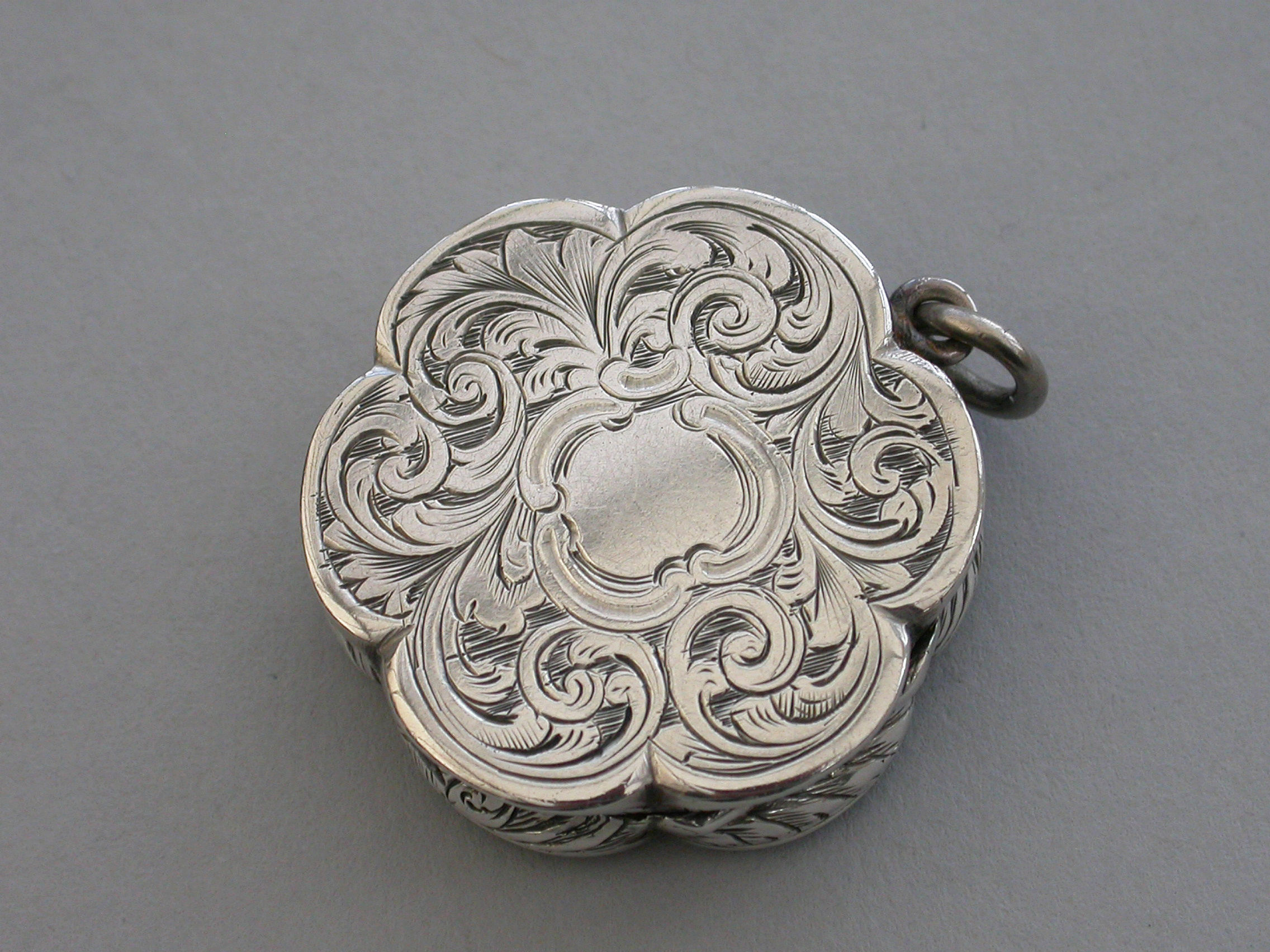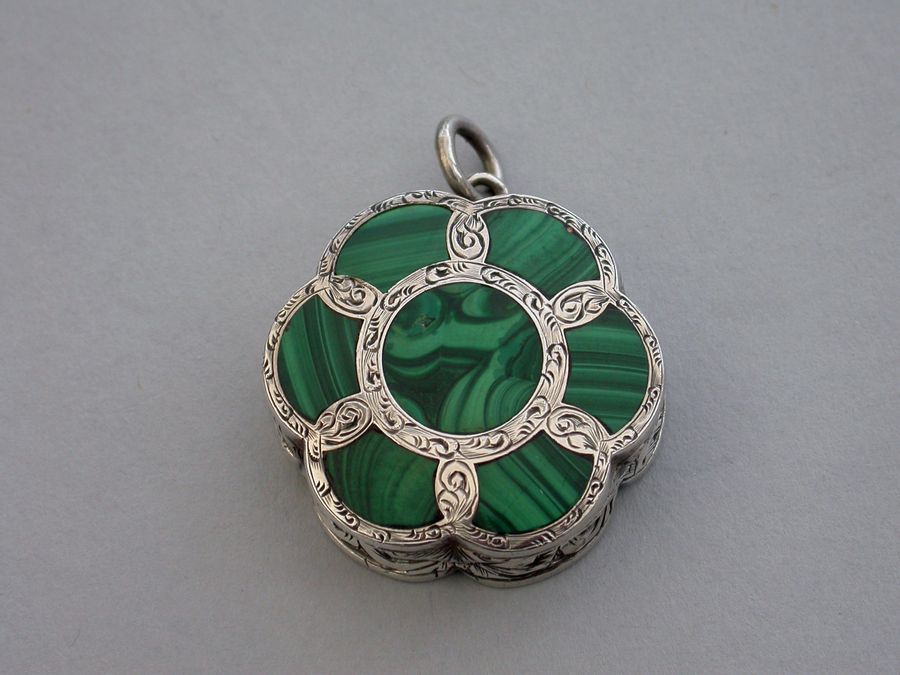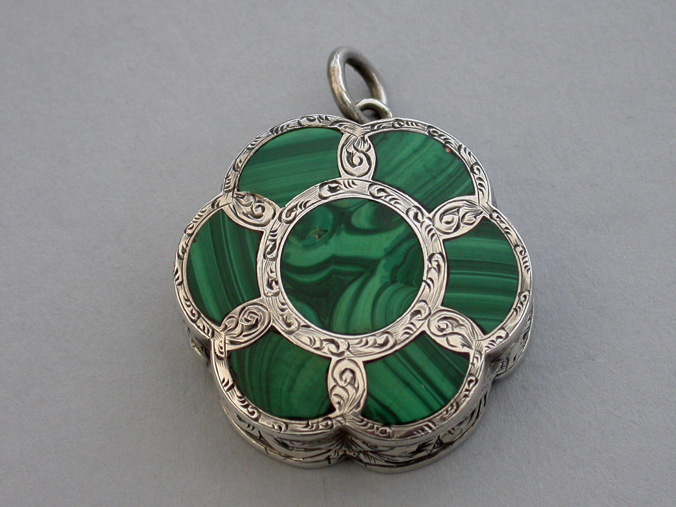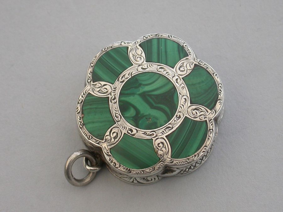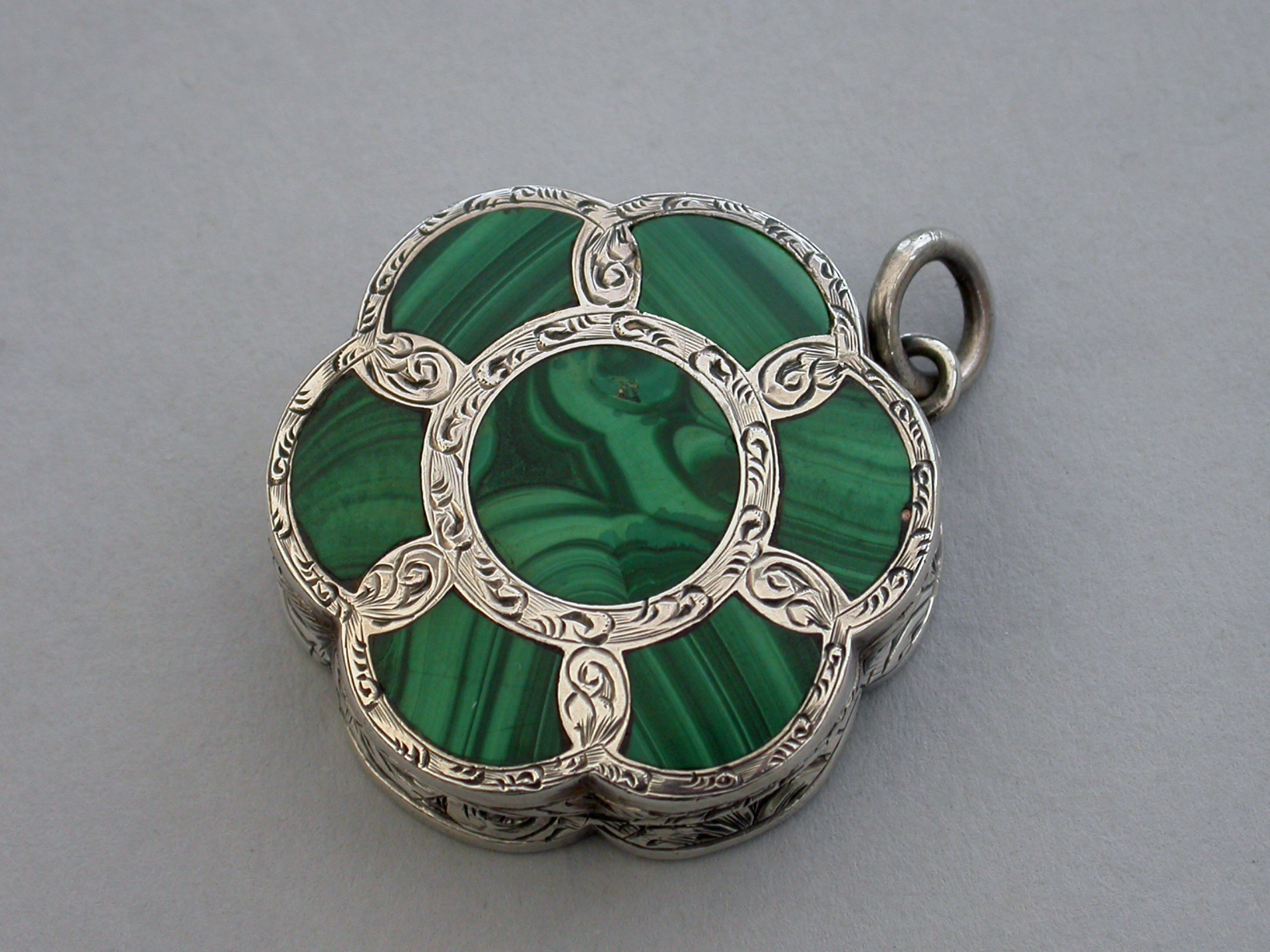 A rare Victorian silver hexafoil or flower shaped Vinaigrette, the cover set with malachite panels within borders of engraved silver around a round central panel, the base similarly shaped with central vacant cartouche bordered by engraved lines surrounded by scrolling leaves. The interior pierced silver gilt grille with central flower head surrounded by scrolling leaves. Attached suspension ring.
