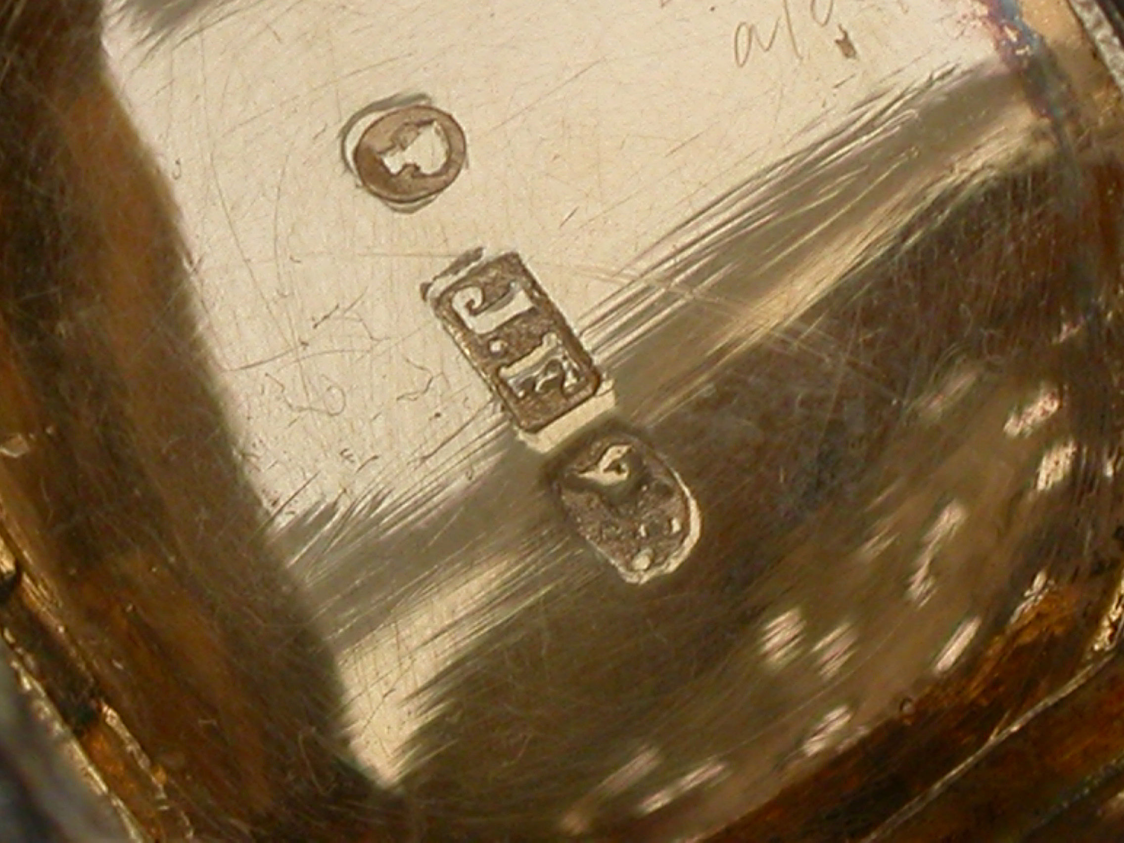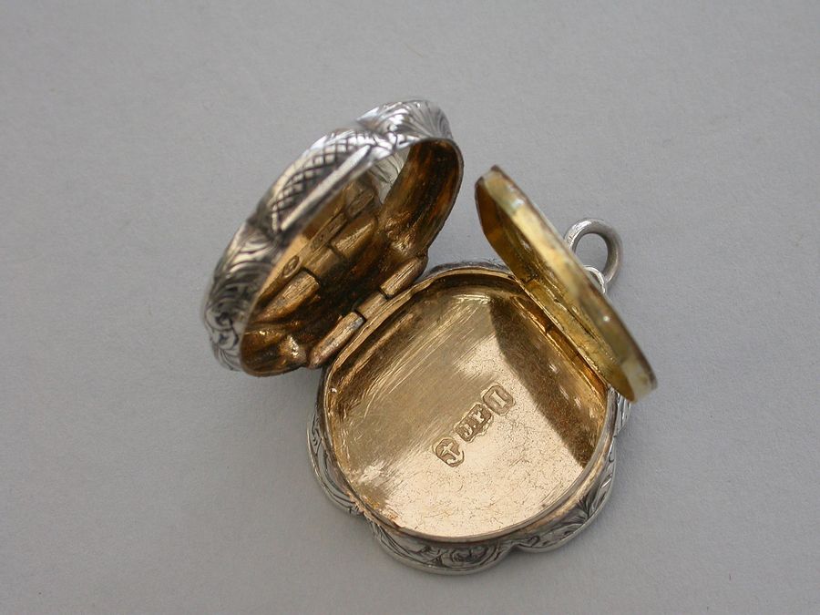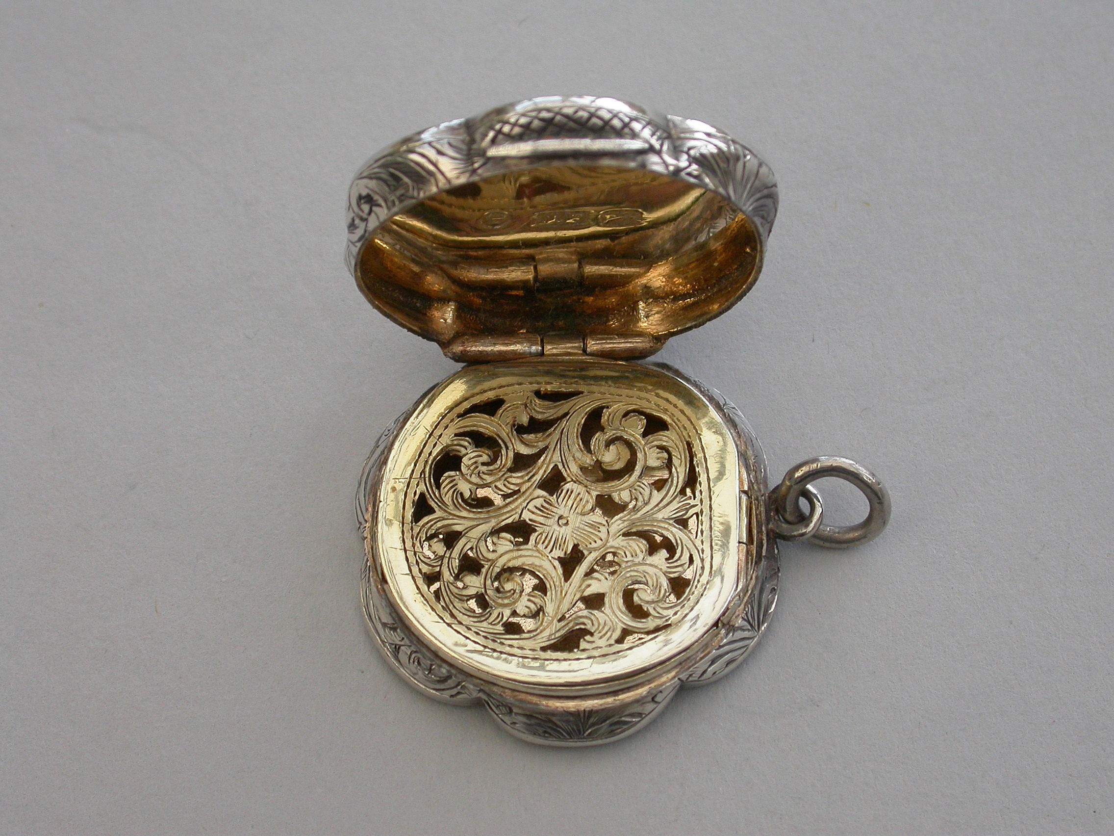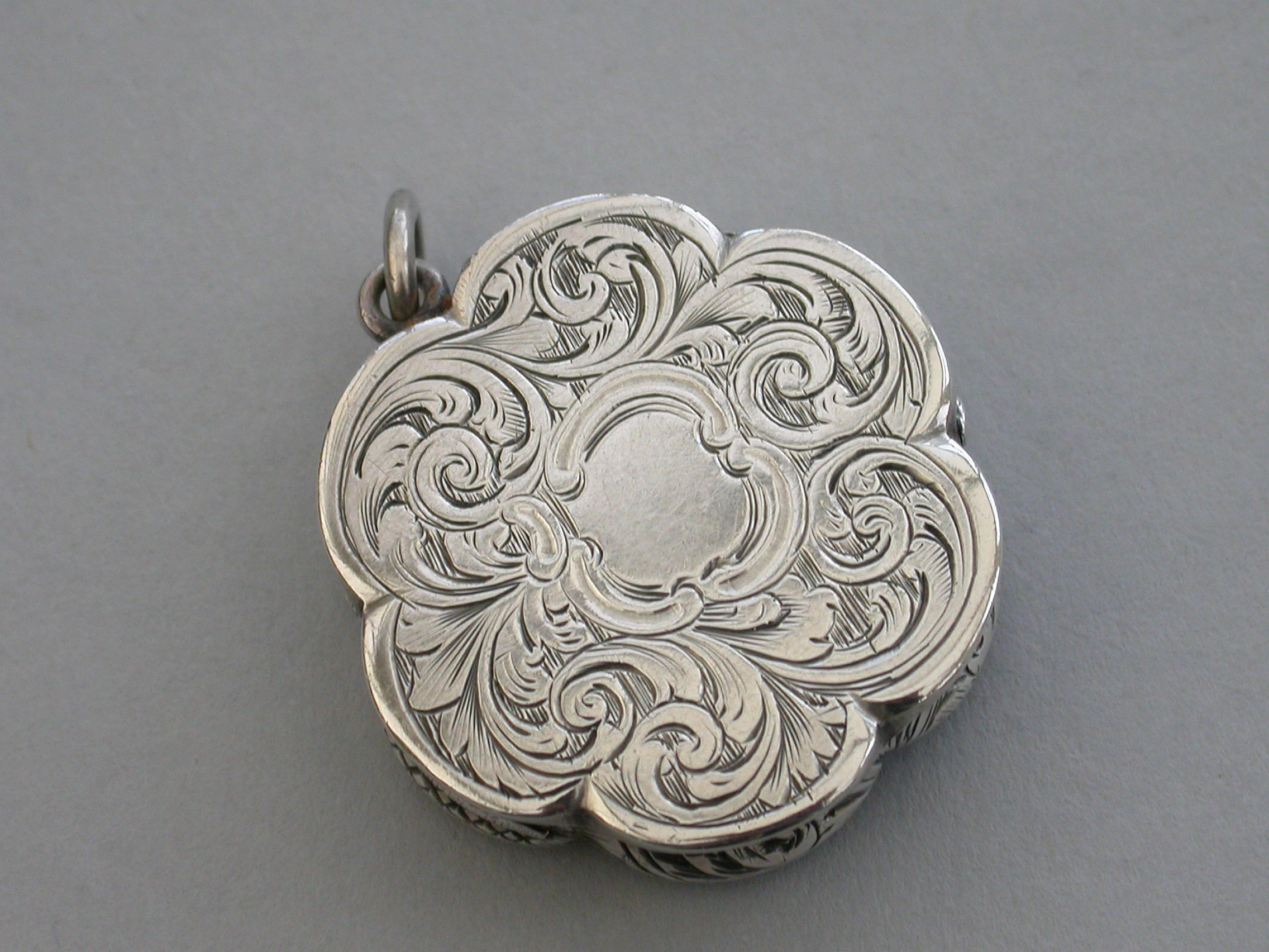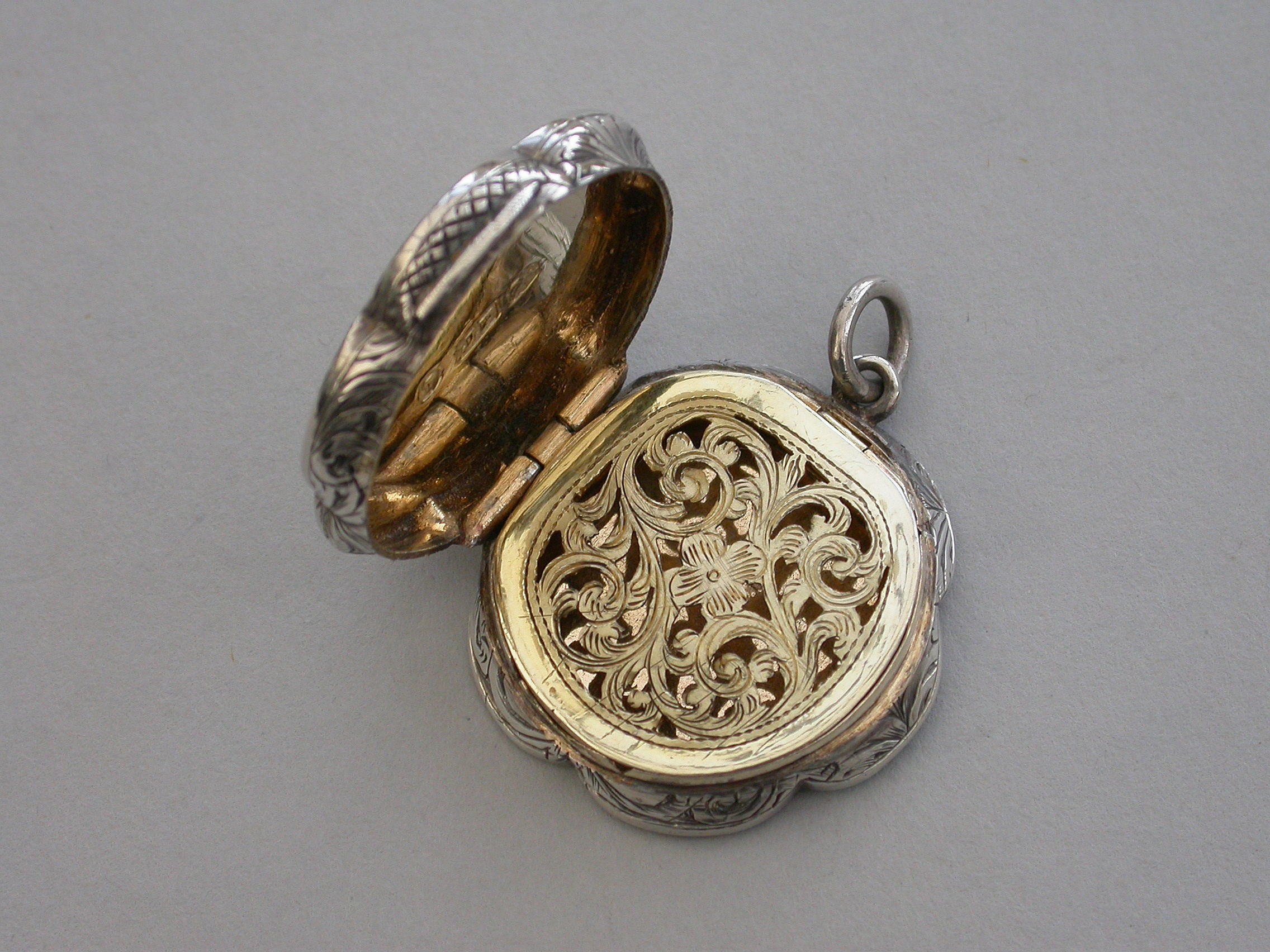 A rare Victorian silver hexafoil or flower shaped Vinaigrette, the cover set with malachite panels within borders of engraved silver around a round central panel, the base similarly shaped with central vacant cartouche bordered by engraved lines surrounded by scrolling leaves. The interior pierced silver gilt grille with central flower head surrounded by scrolling leaves. Attached suspension ring.