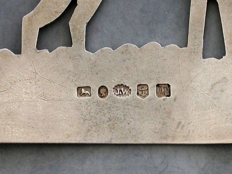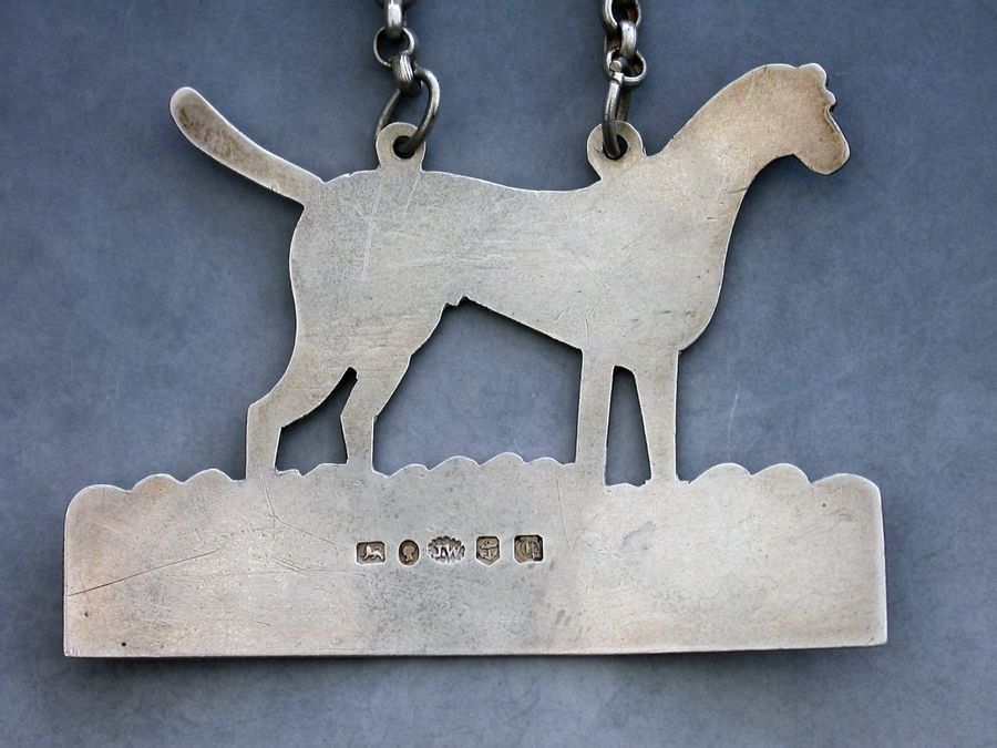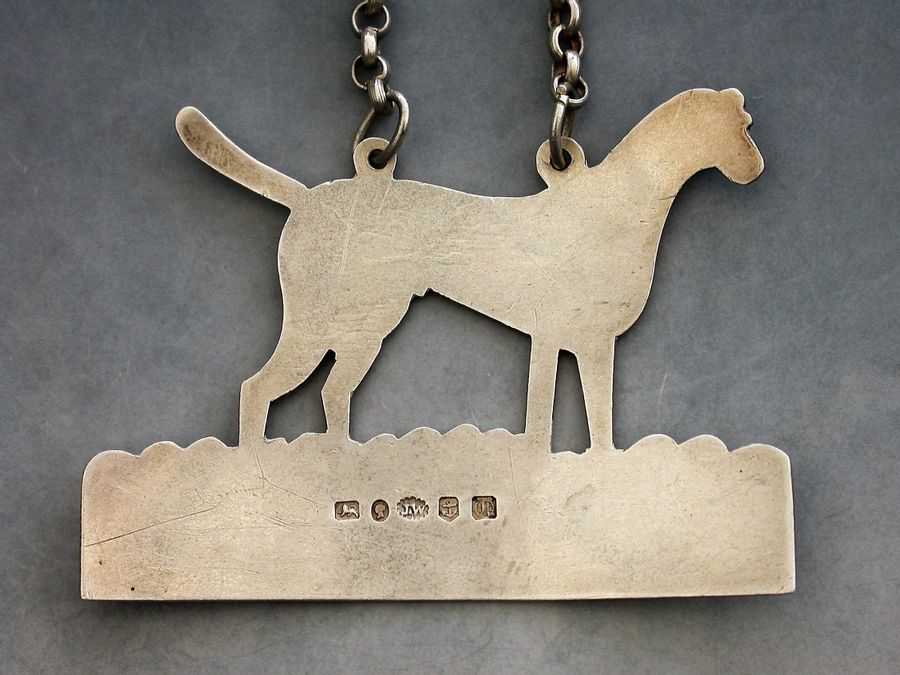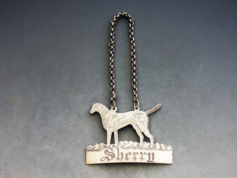 A rare early Victorian silver Wine Label made in the form of Foxhound standing on a narrow rectangular base with engraved foliage surmount. The hounds kennel name – “BELLE”, engraved on its collar. Incised for Sherry.