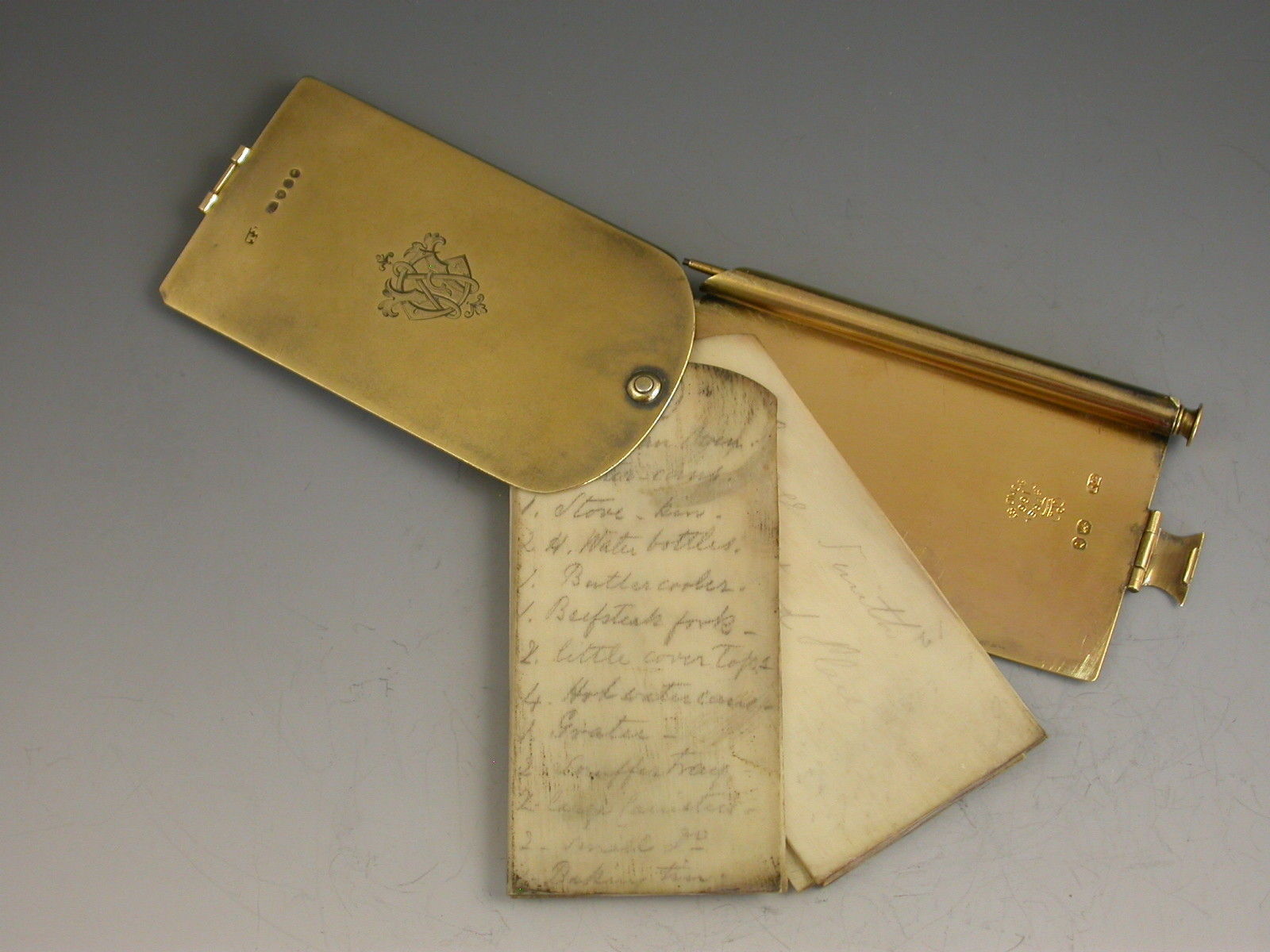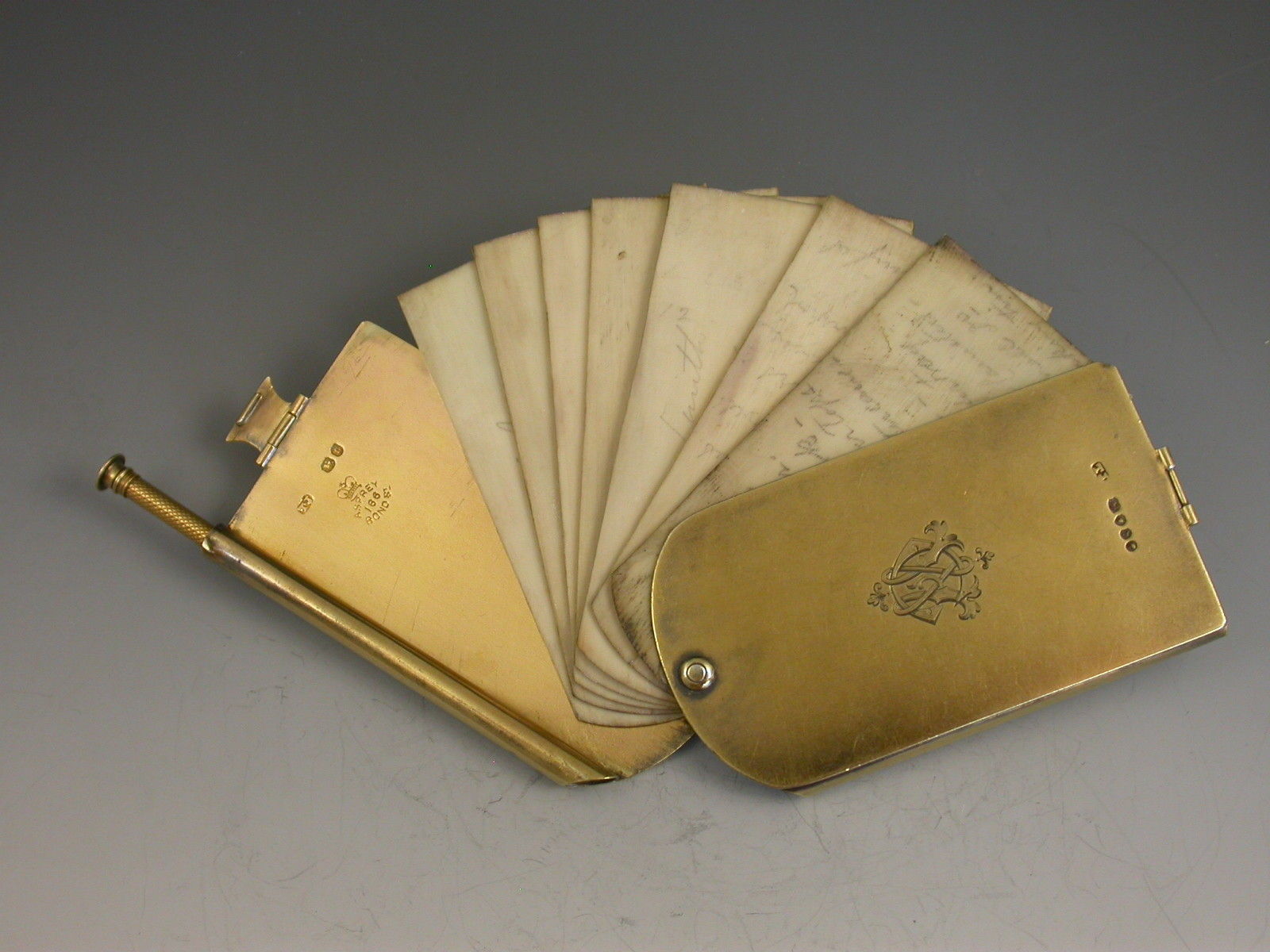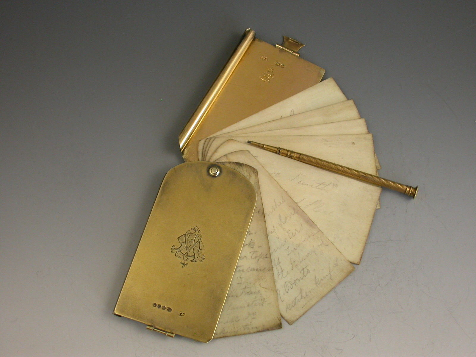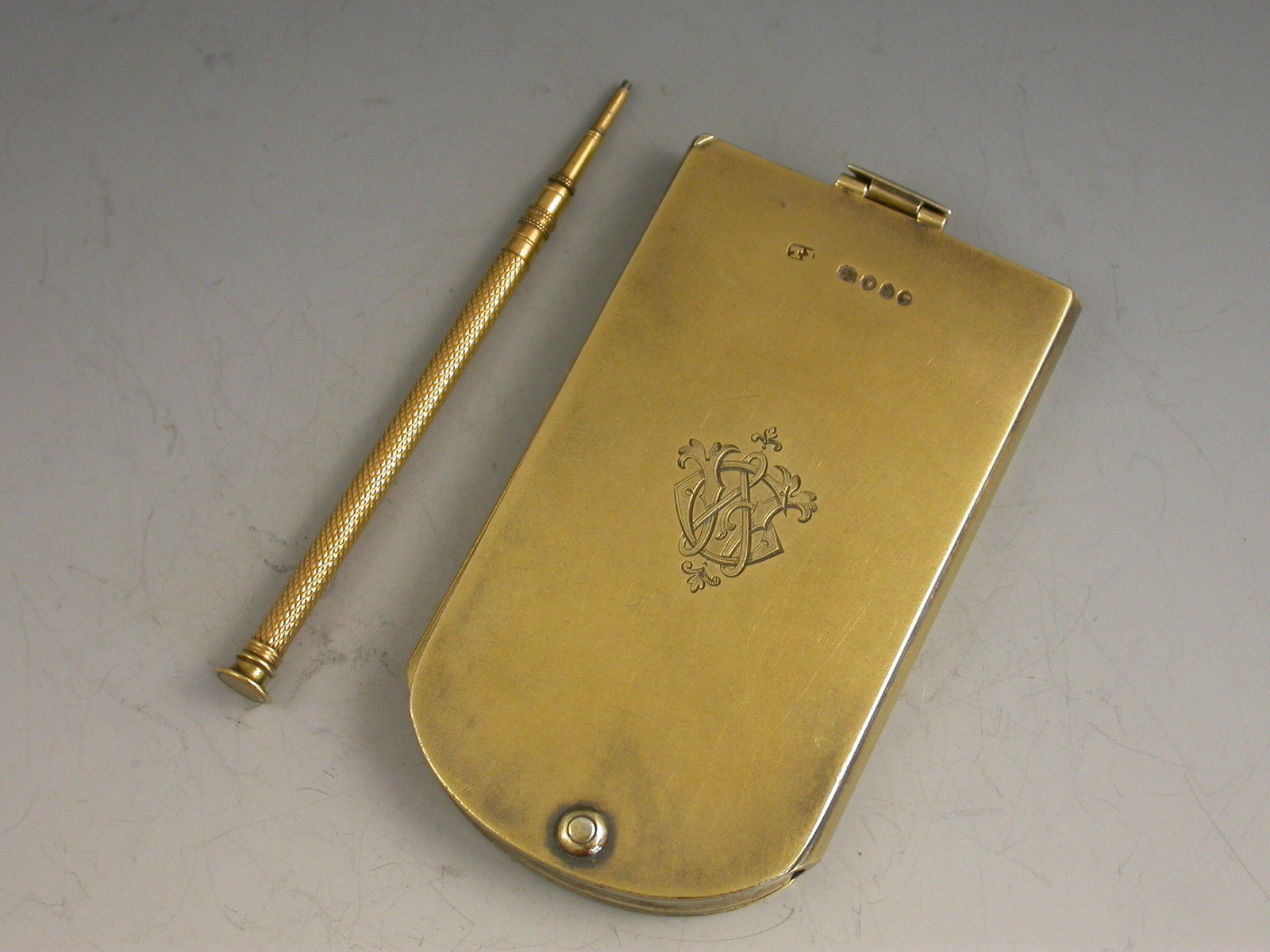 A fine quality Victorian silver gilt Aide Memoire of rounded rectangular form, the plain silver gilt covers opening on a swiveling pin and secured by a hinged clasp. The interior complete with the original seven ivory leaves (one for each day of the week) and retaining some original penciled notes. Complete with engine turned propelling pencil. The cover engraved with a monogram.