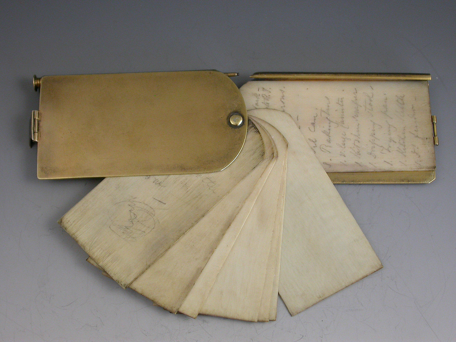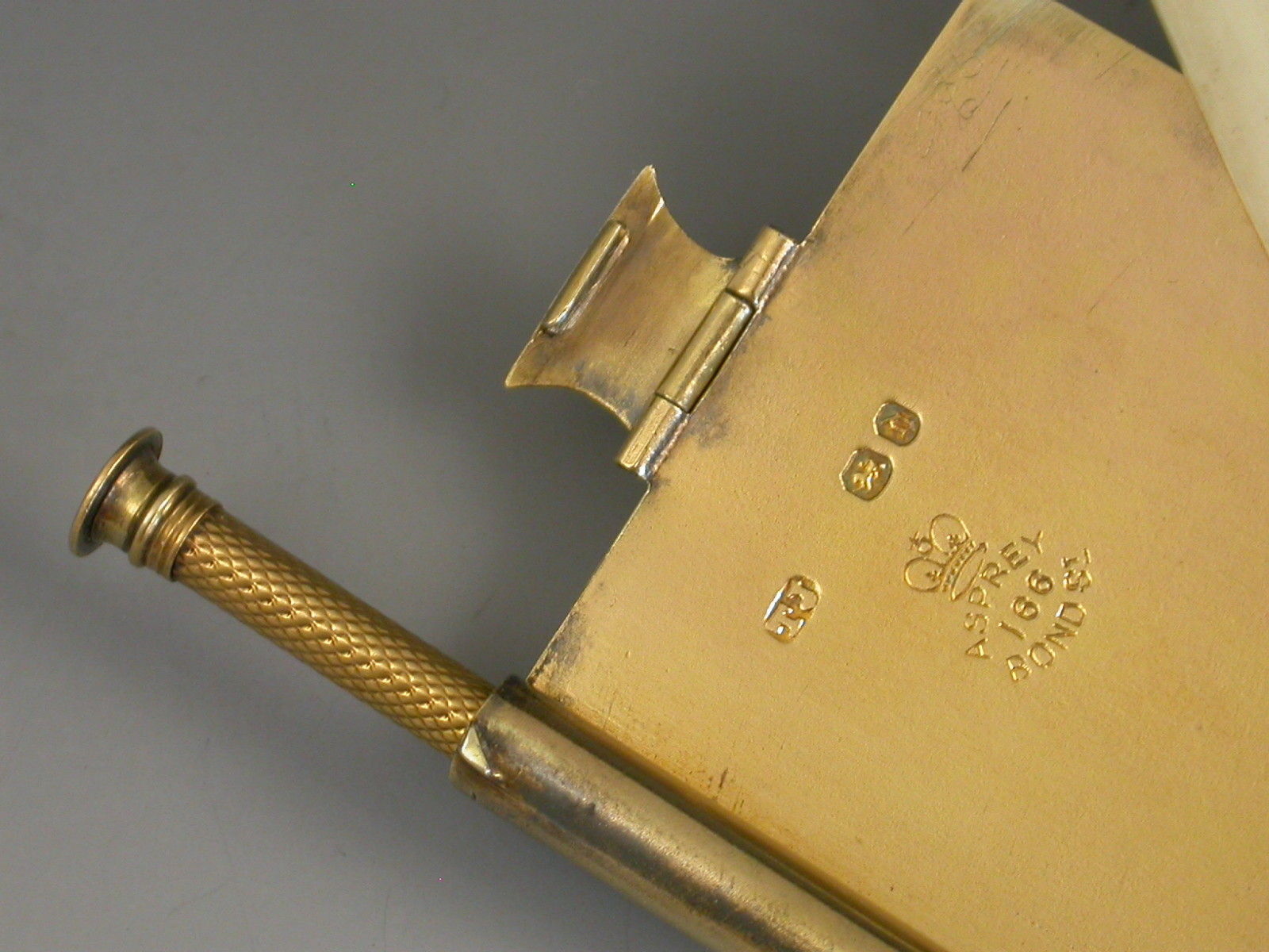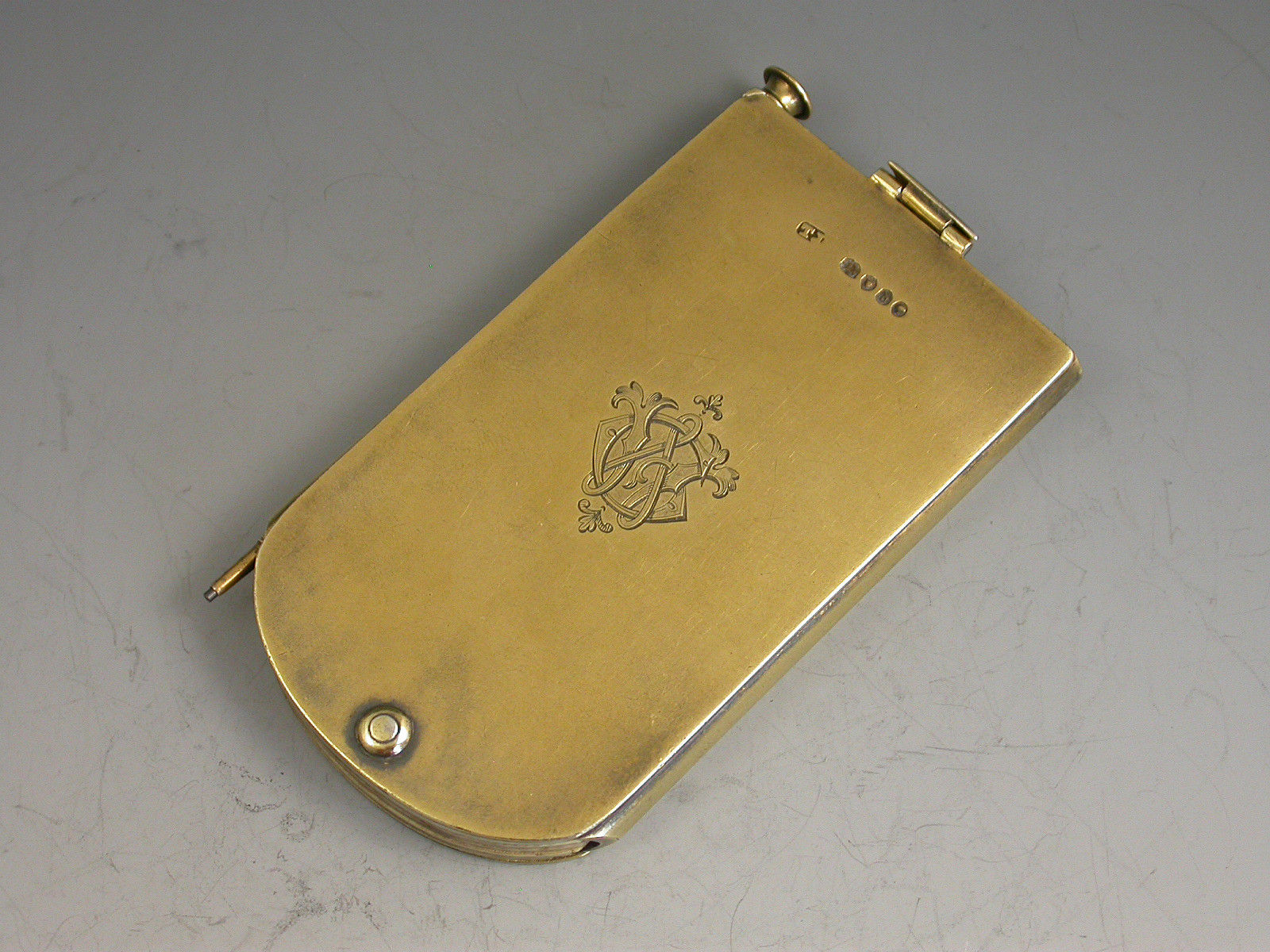 A fine quality Victorian silver gilt Aide Memoire of rounded rectangular form, the plain silver gilt covers opening on a swiveling pin and secured by a hinged clasp. The interior complete with the original seven ivory leaves (one for each day of the week) and retaining some original penciled notes. Complete with engine turned propelling pencil. The cover engraved with a monogram.