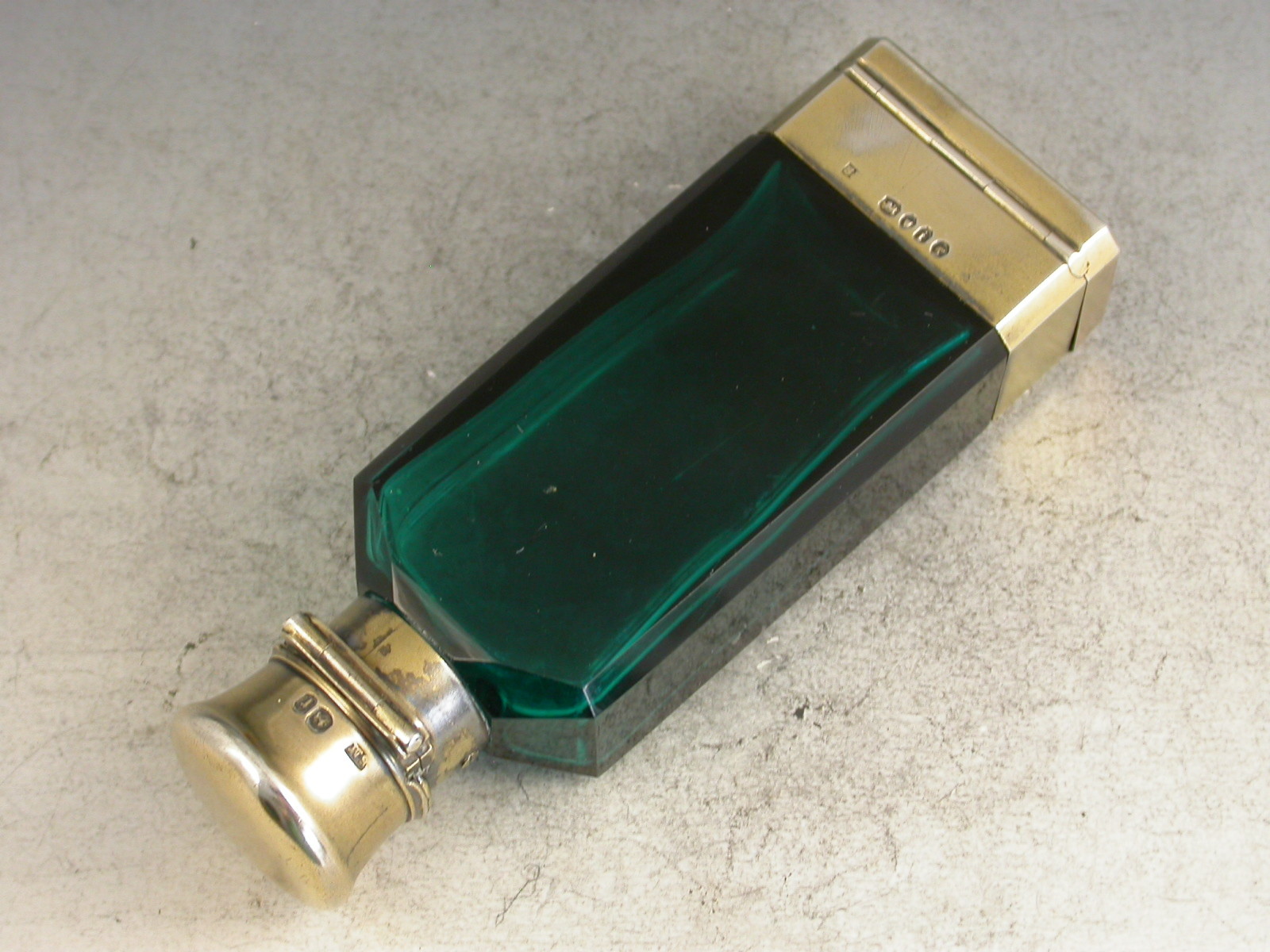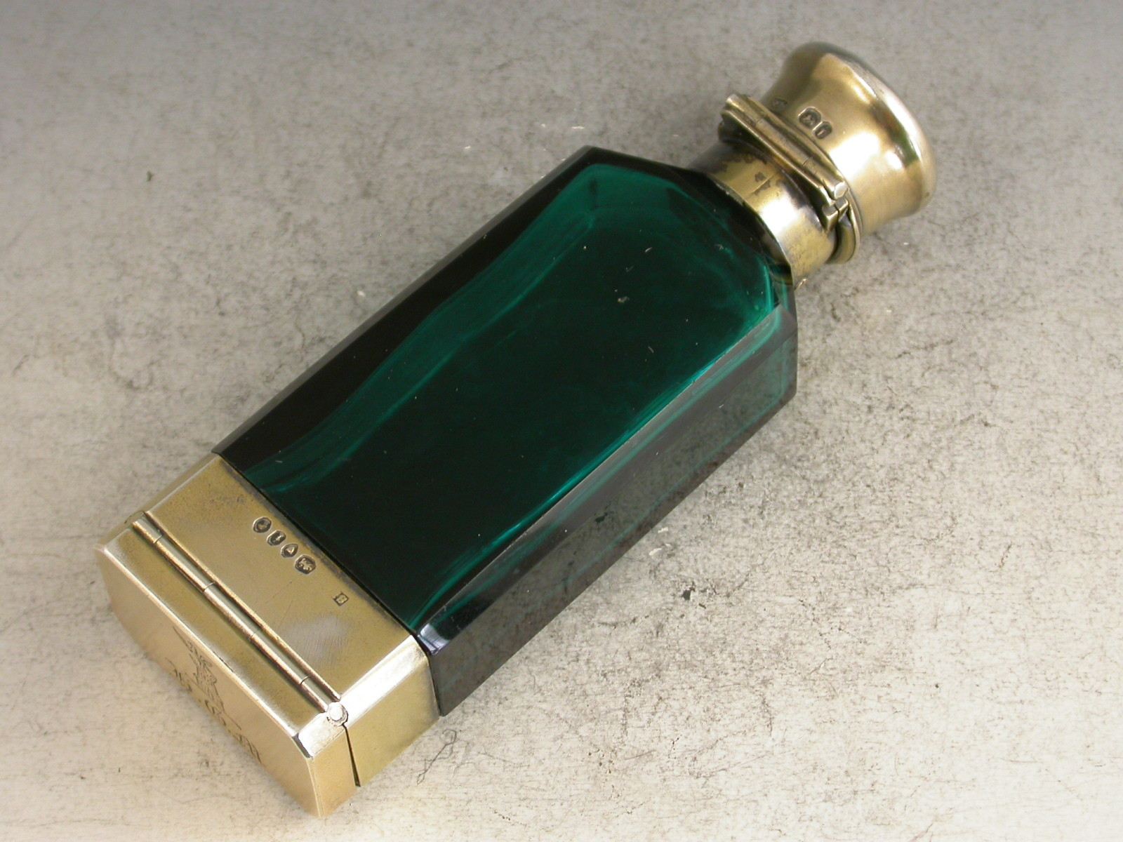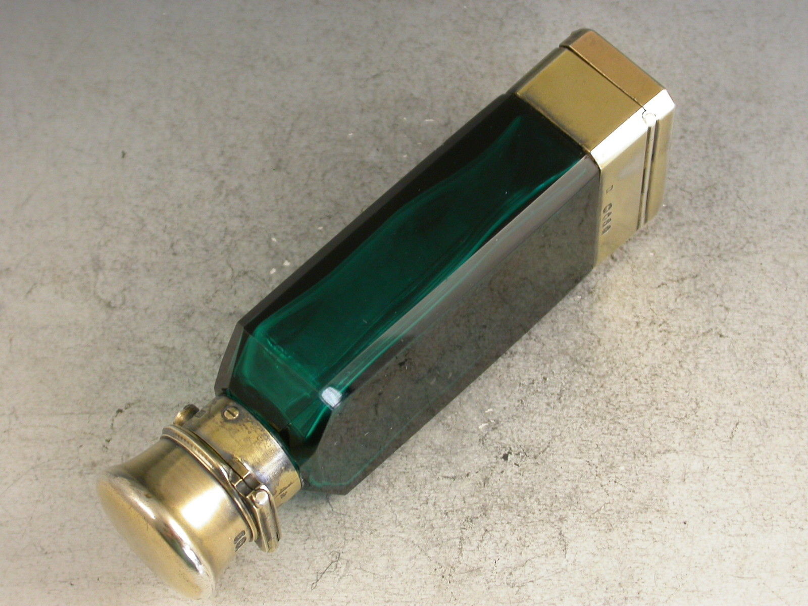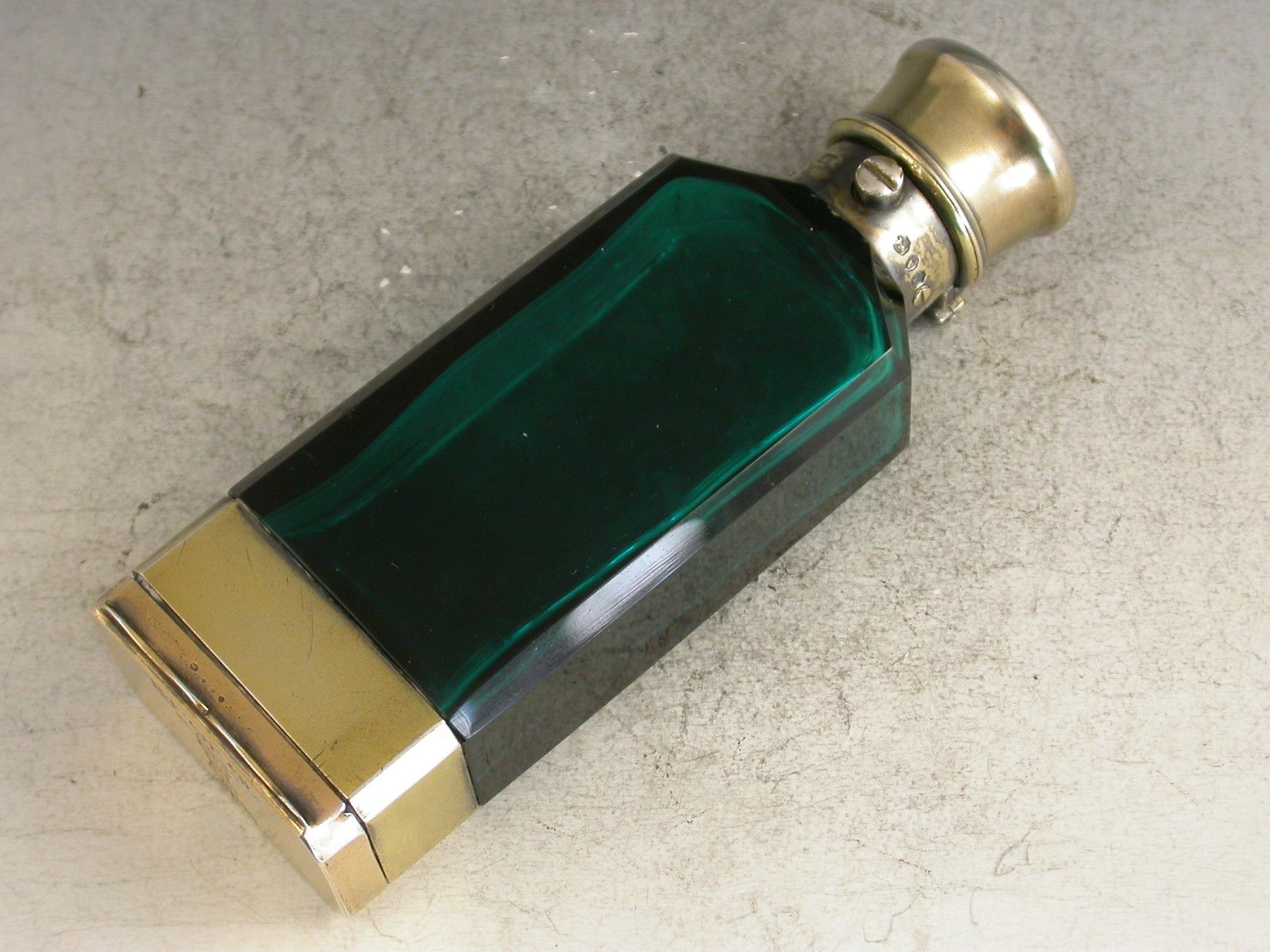 A fine Victorian silver gilt mounted glass combined Scent Bottle and Vinaigrette of flat rectangular form with chamfered corners, the glass body in an unusual blue/green colour, the Scent Bottle with hinged flip-top lid, the Vinaigrette to the base with intricately pierced grille, the cover engraved with a contemporary crest and initials.