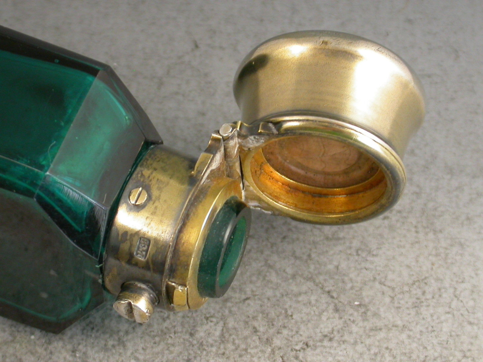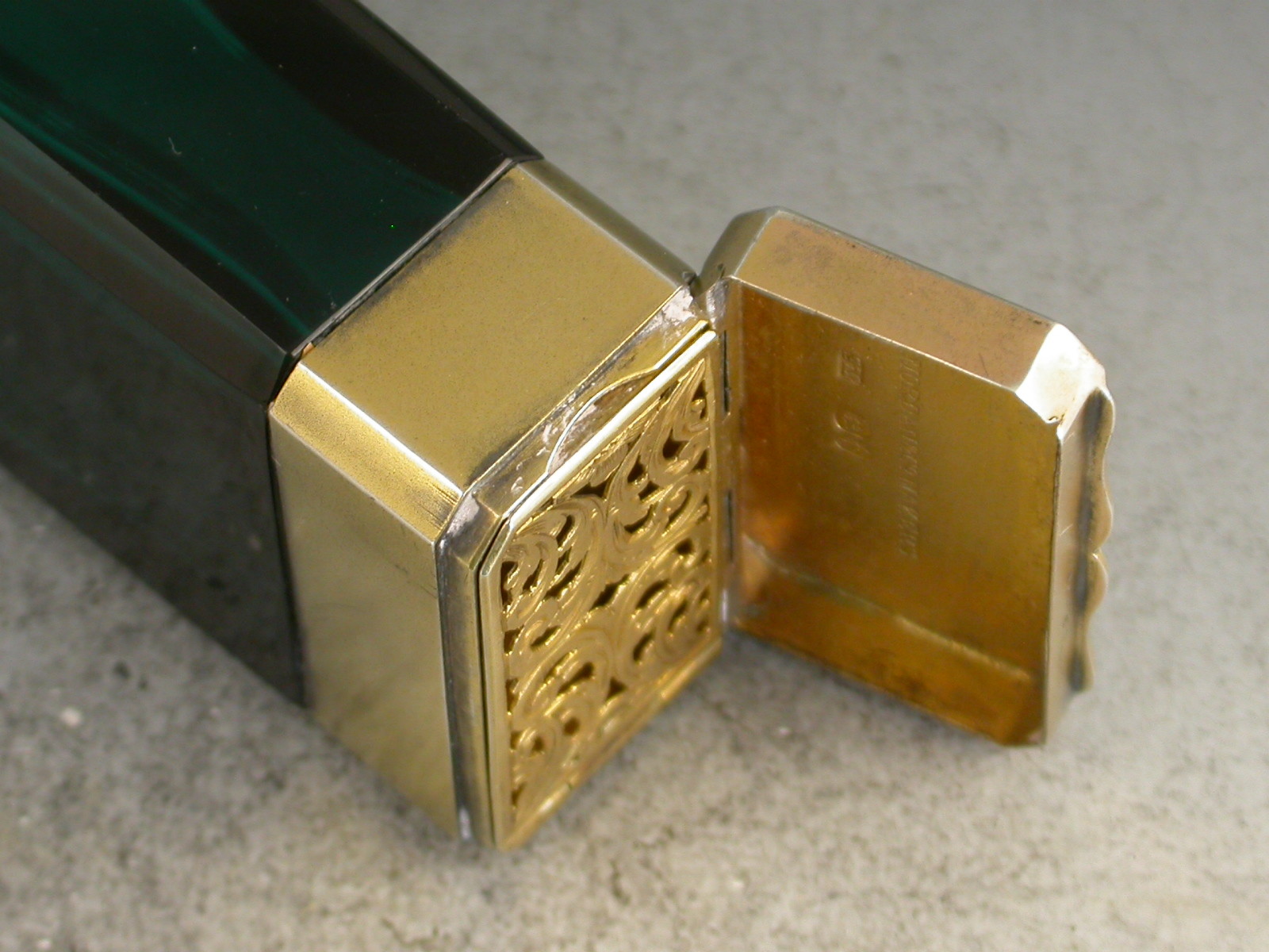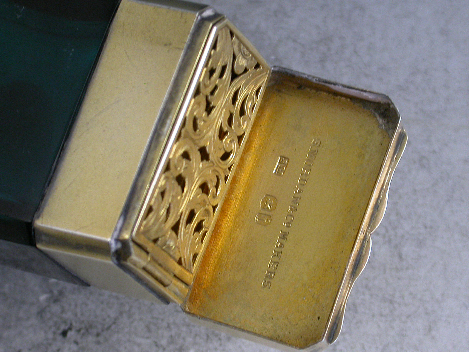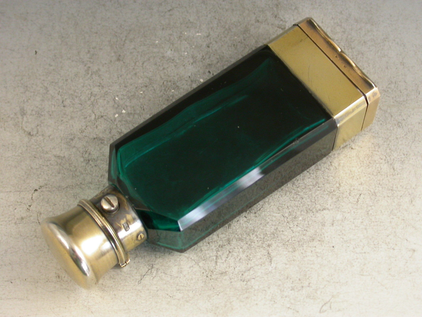A fine Victorian silver gilt mounted glass combined Scent Bottle and Vinaigrette of flat rectangular form with chamfered corners, the glass body in an unusual blue/green colour, the Scent Bottle with hinged flip-top lid, the Vinaigrette to the base with intricately pierced grille, the cover engraved with a contemporary crest and initials.