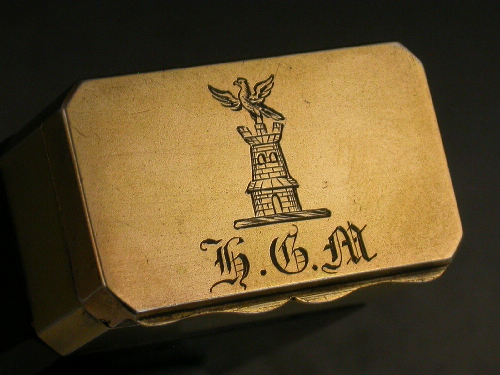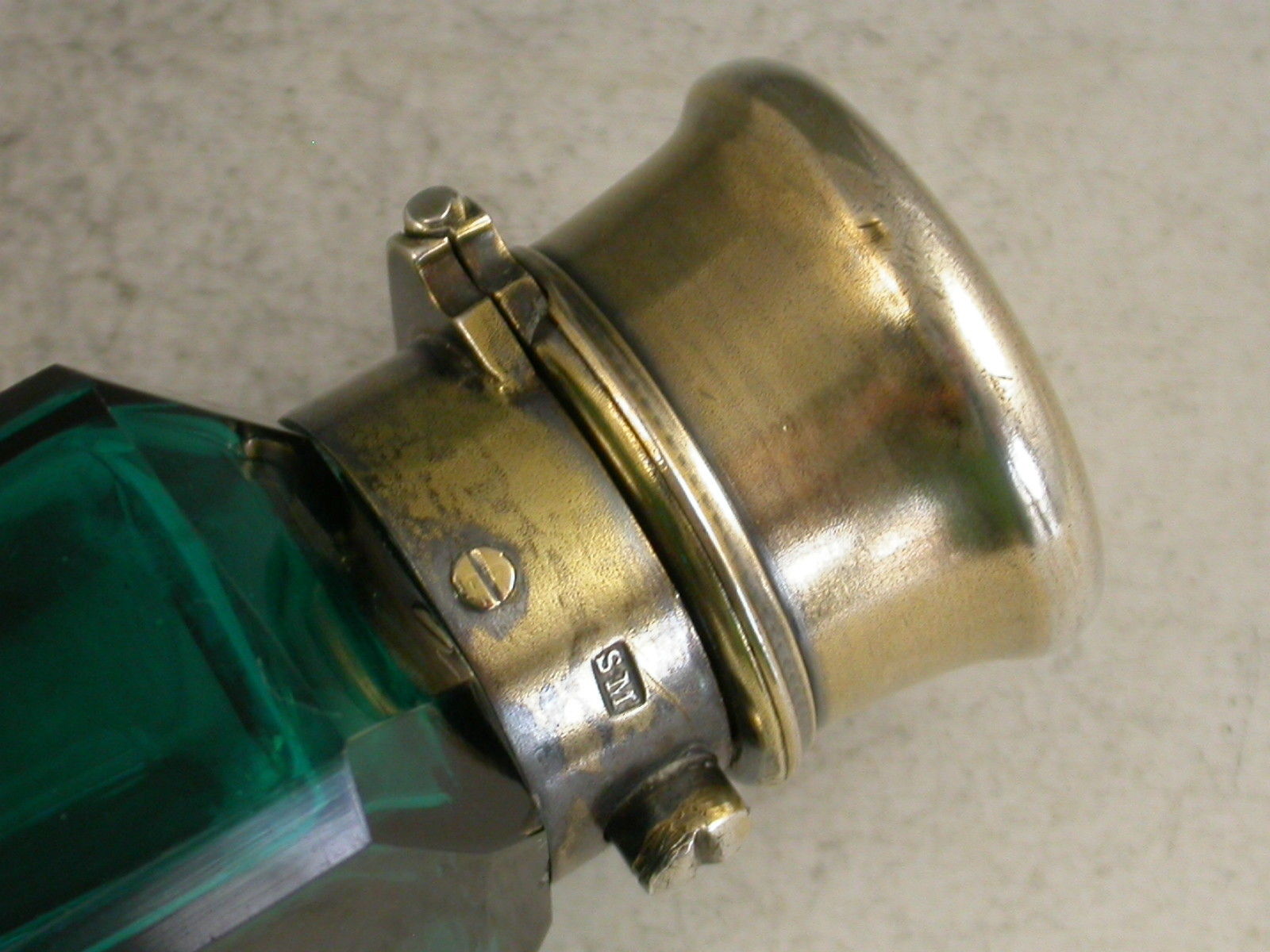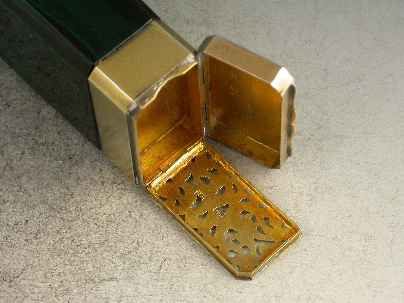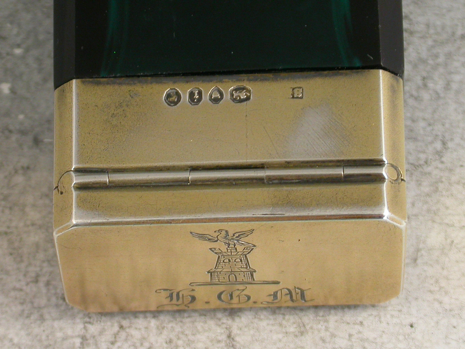 A fine Victorian silver gilt mounted glass combined Scent Bottle and Vinaigrette of flat rectangular form with chamfered corners, the glass body in an unusual blue/green colour, the Scent Bottle with hinged flip-top lid, the Vinaigrette to the base with intricately pierced grille, the cover engraved with a contemporary crest and initials.