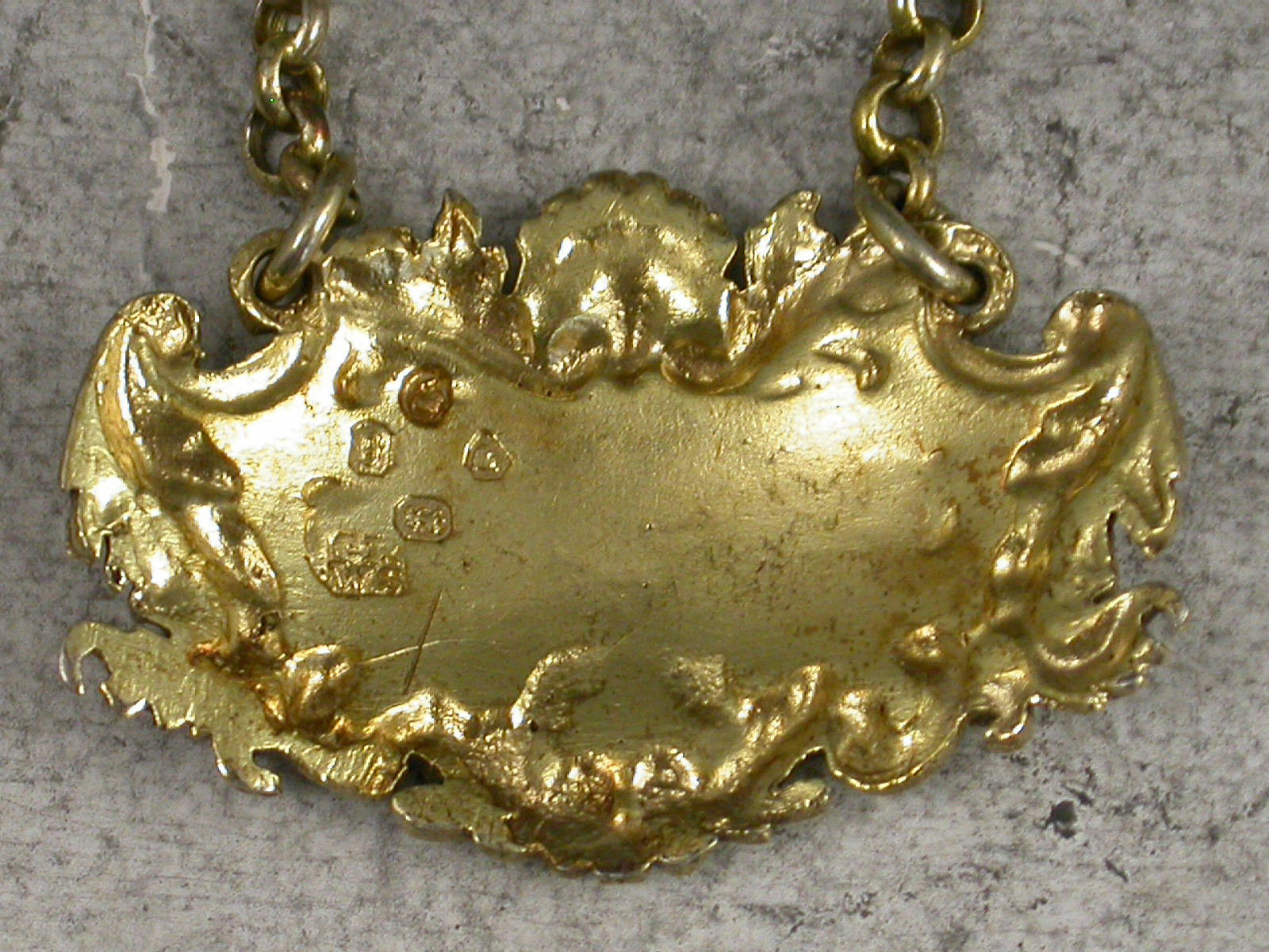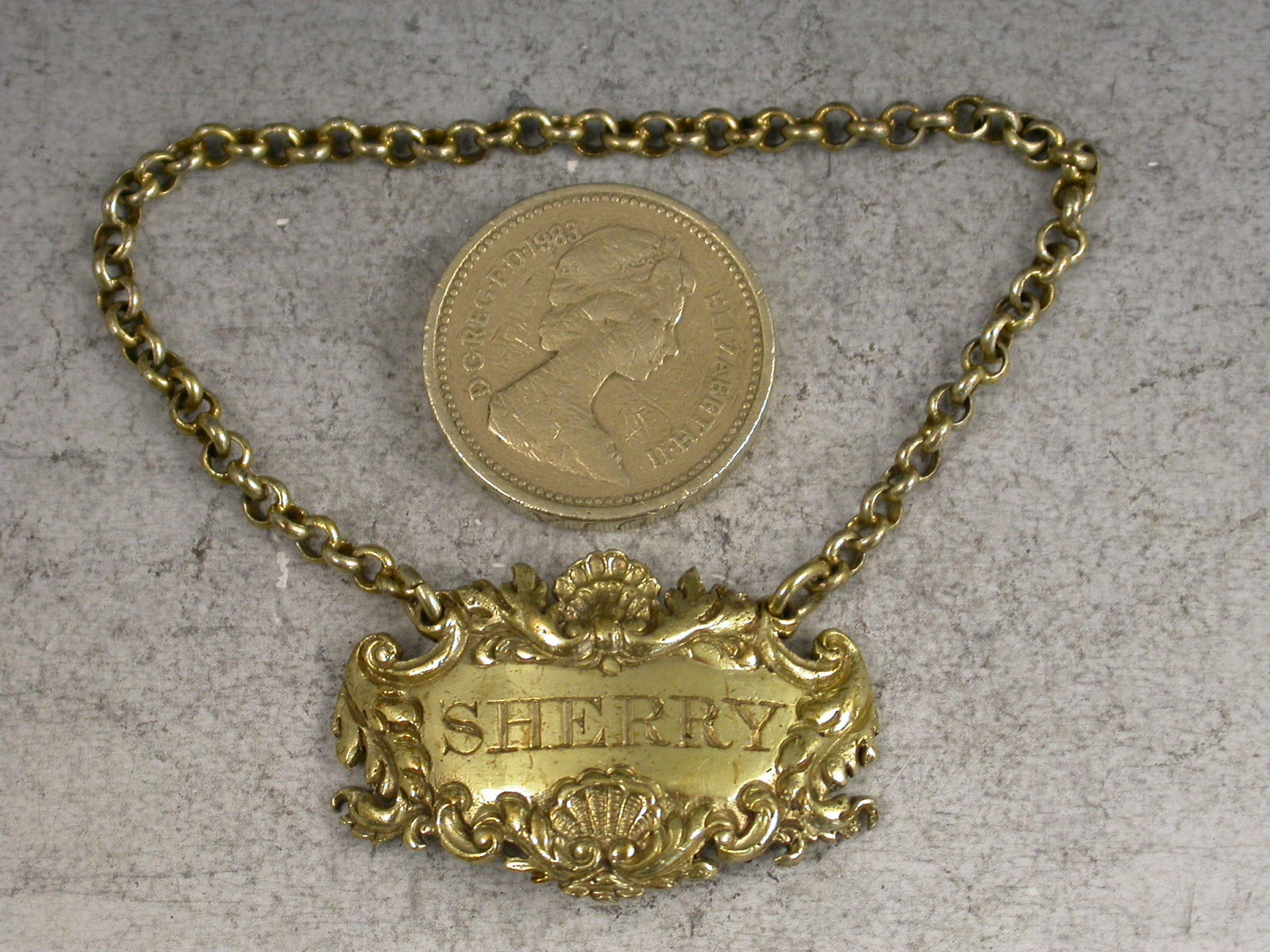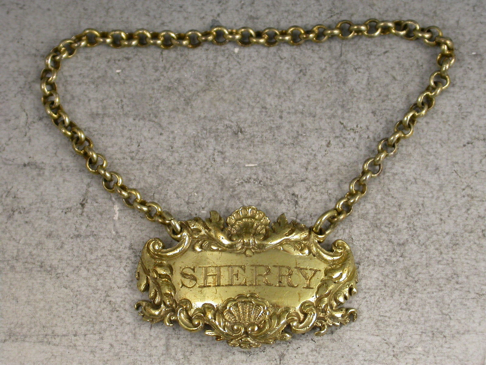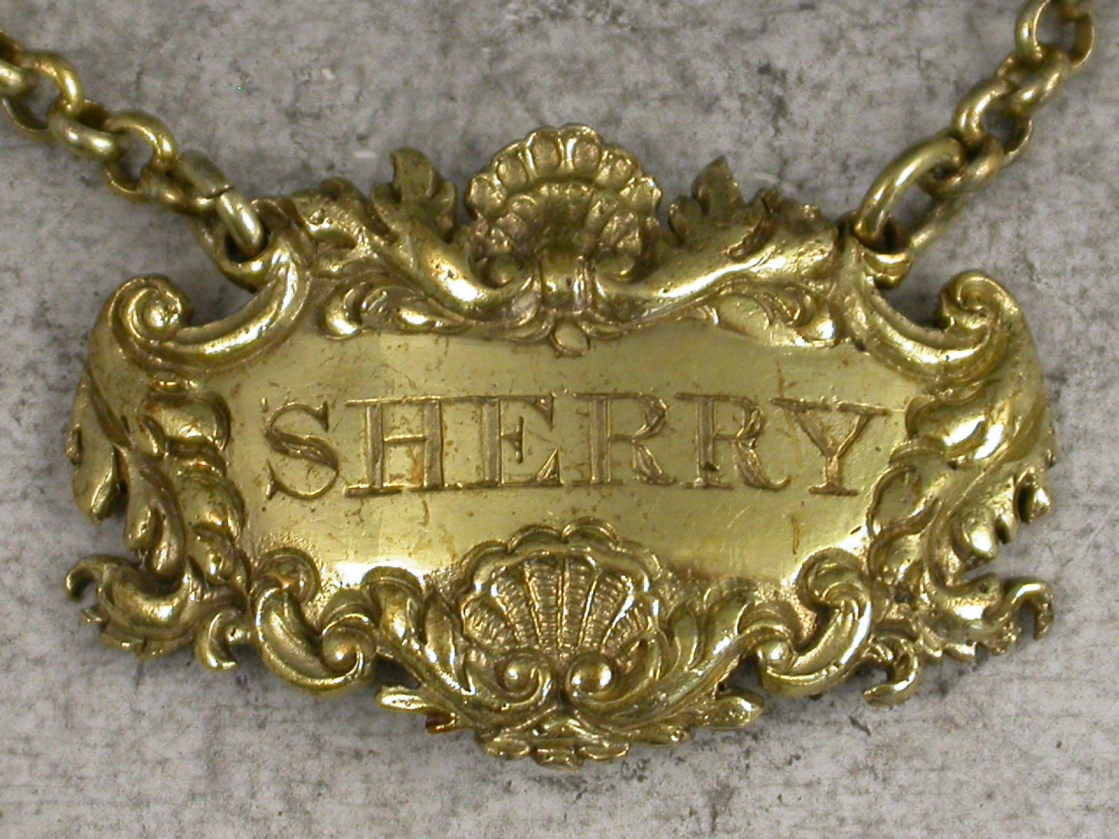 Small Victorian cast silver gilt ""Boudoir Label"" for use on a small ladies decanter, of cartouche form with leaf, shell and scroll border, incised for Sherry.