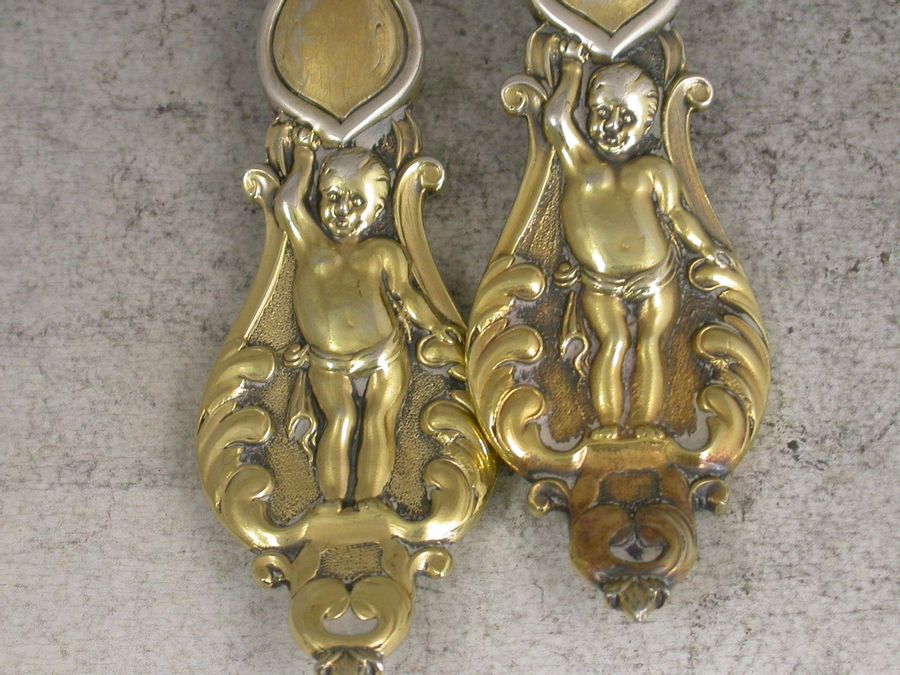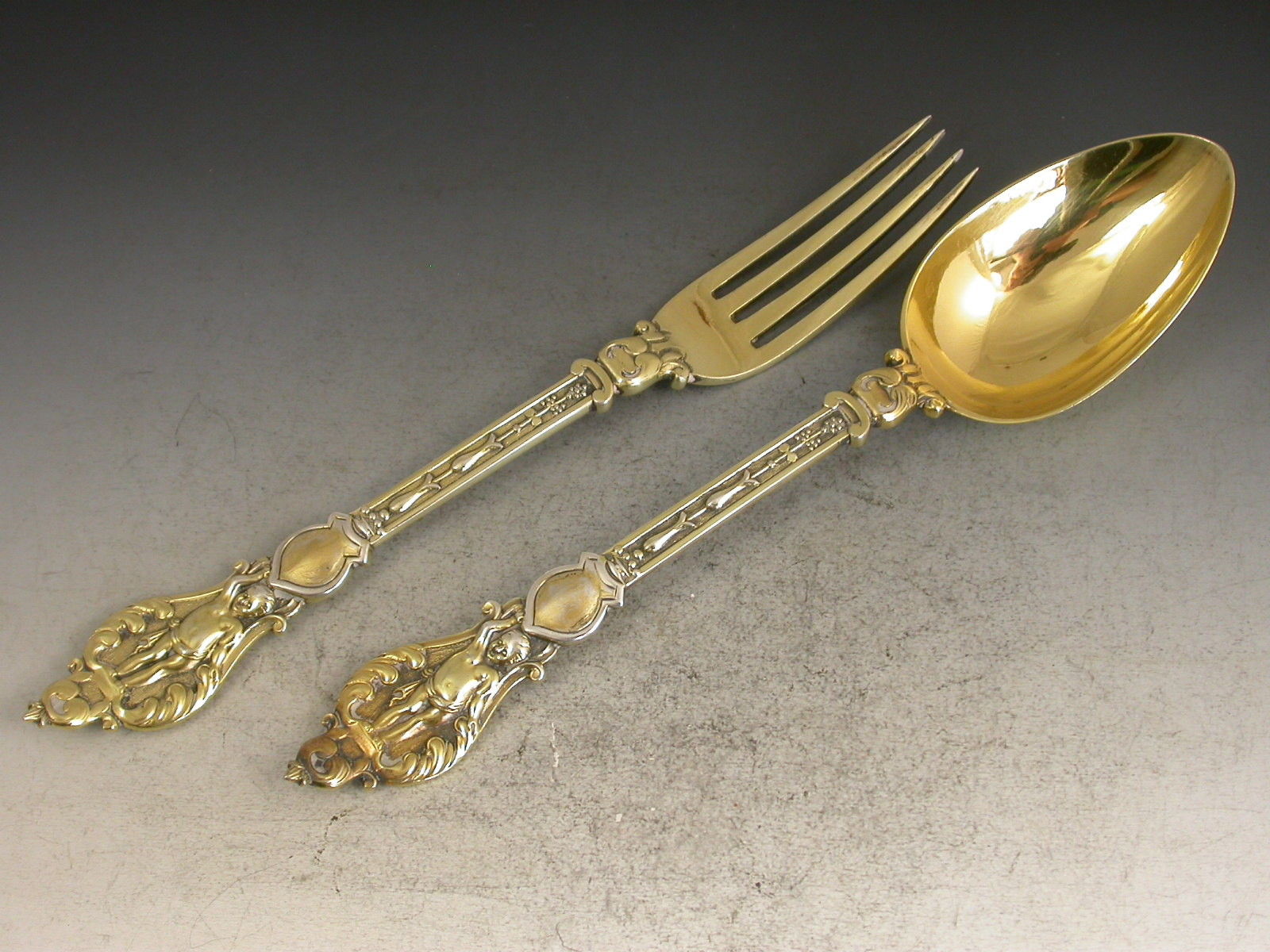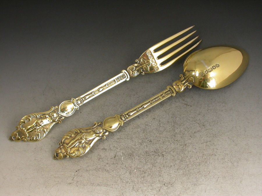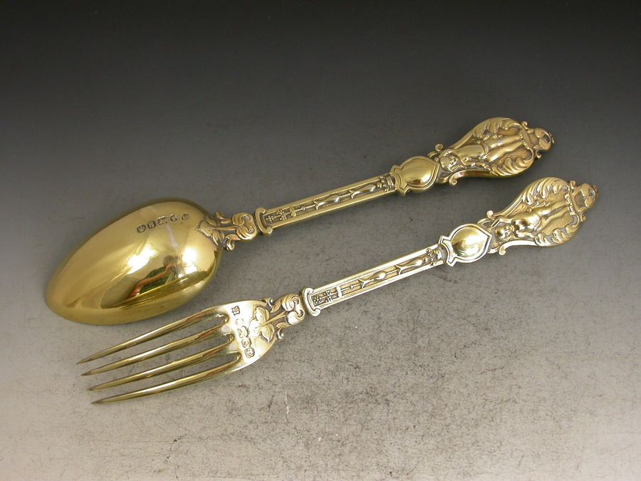 A fine quality Victorian silver gilt Christening Spoon and Fork in an elaborate and unusual pattern. The shaped terminals with a male putti to the front and a female to the reverse, the stems with harebells on a matt background.