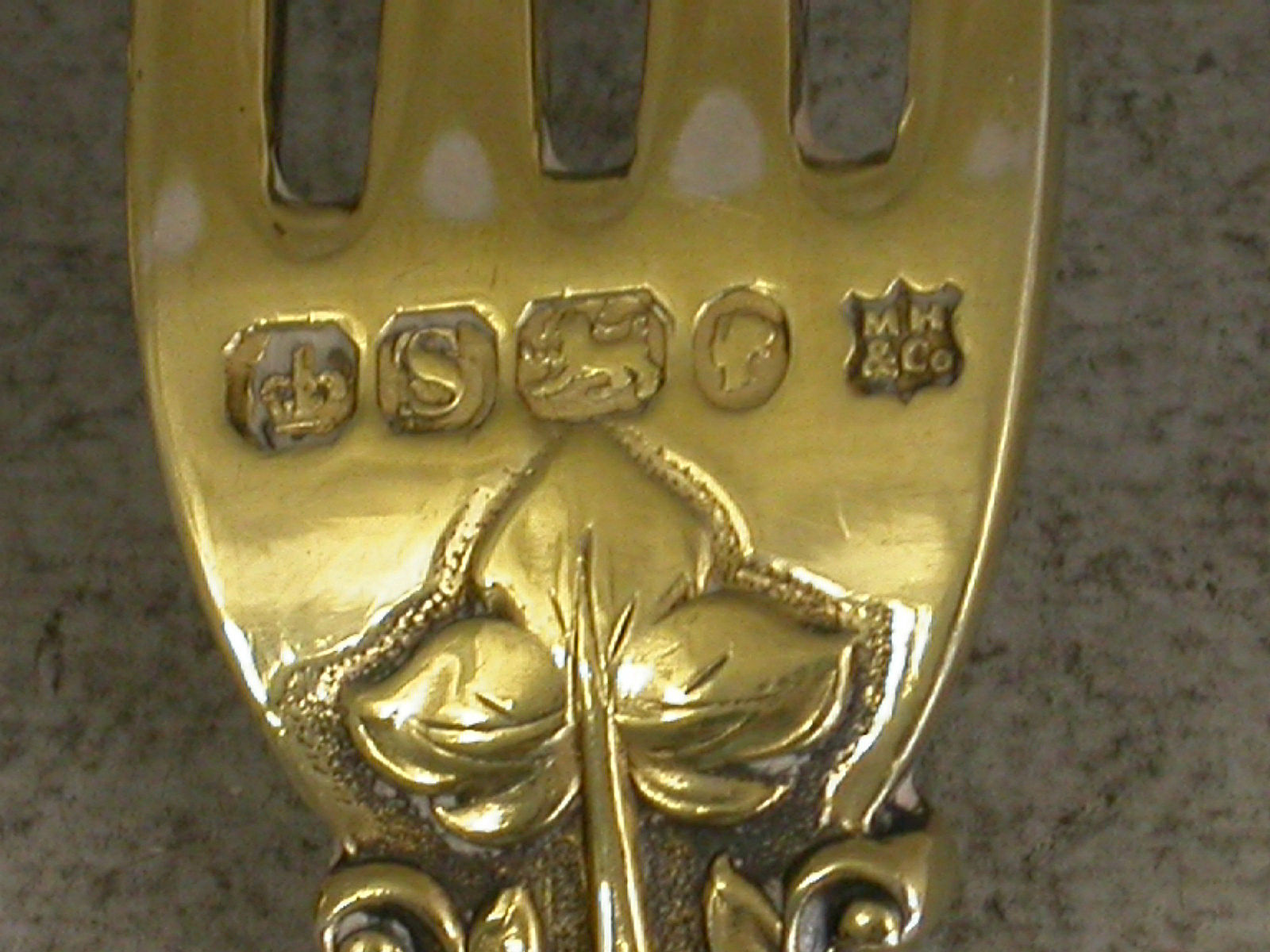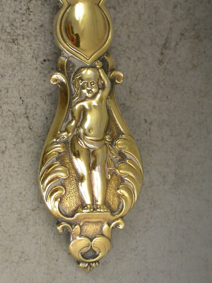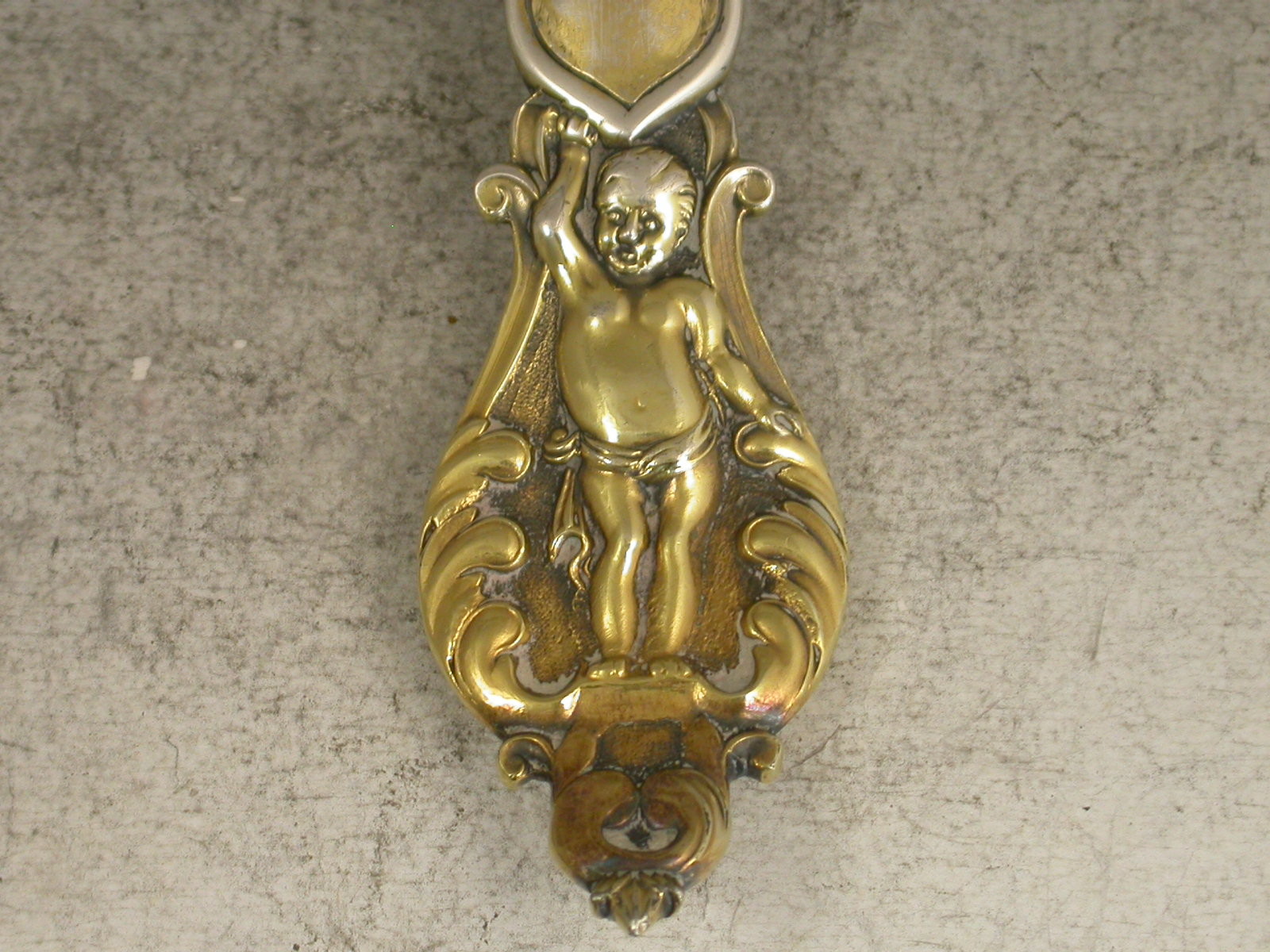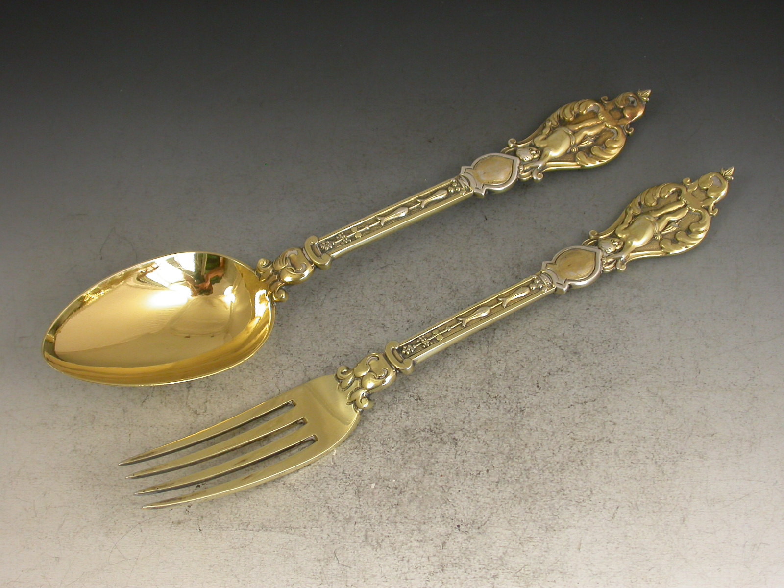 A fine quality Victorian silver gilt Christening Spoon and Fork in an elaborate and unusual pattern. The shaped terminals with a male putti to the front and a female to the reverse, the stems with harebells on a matt background.