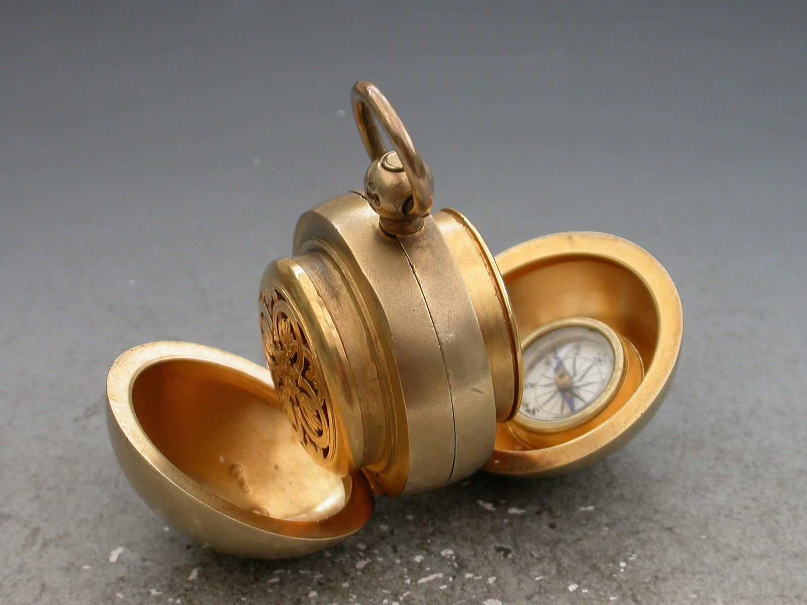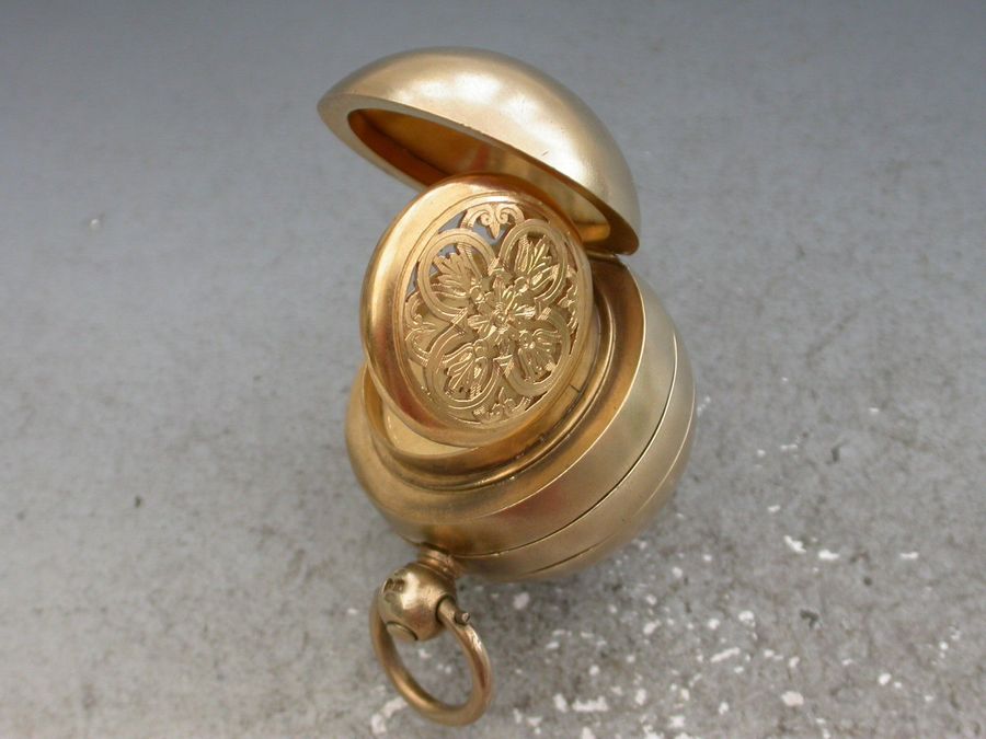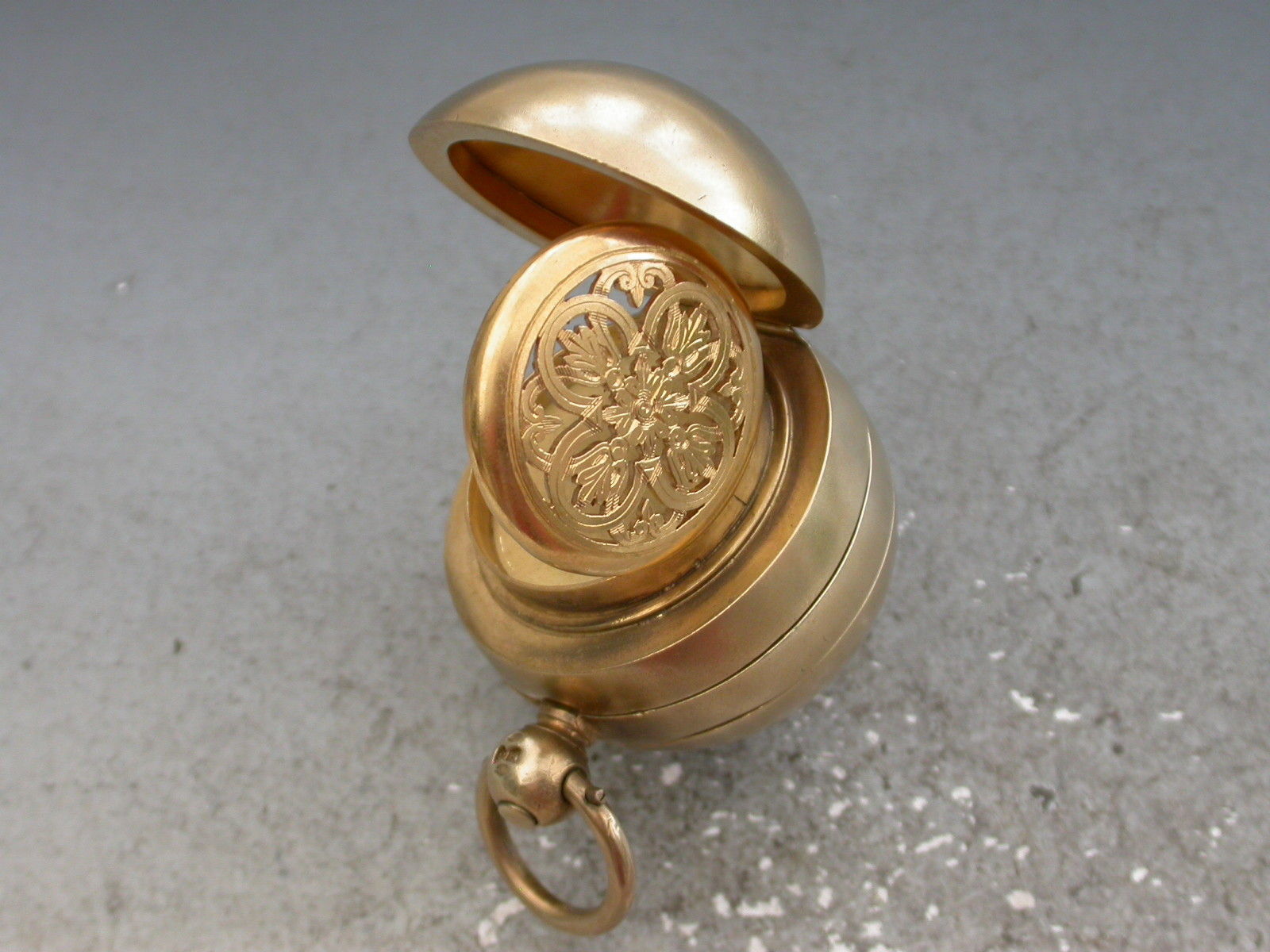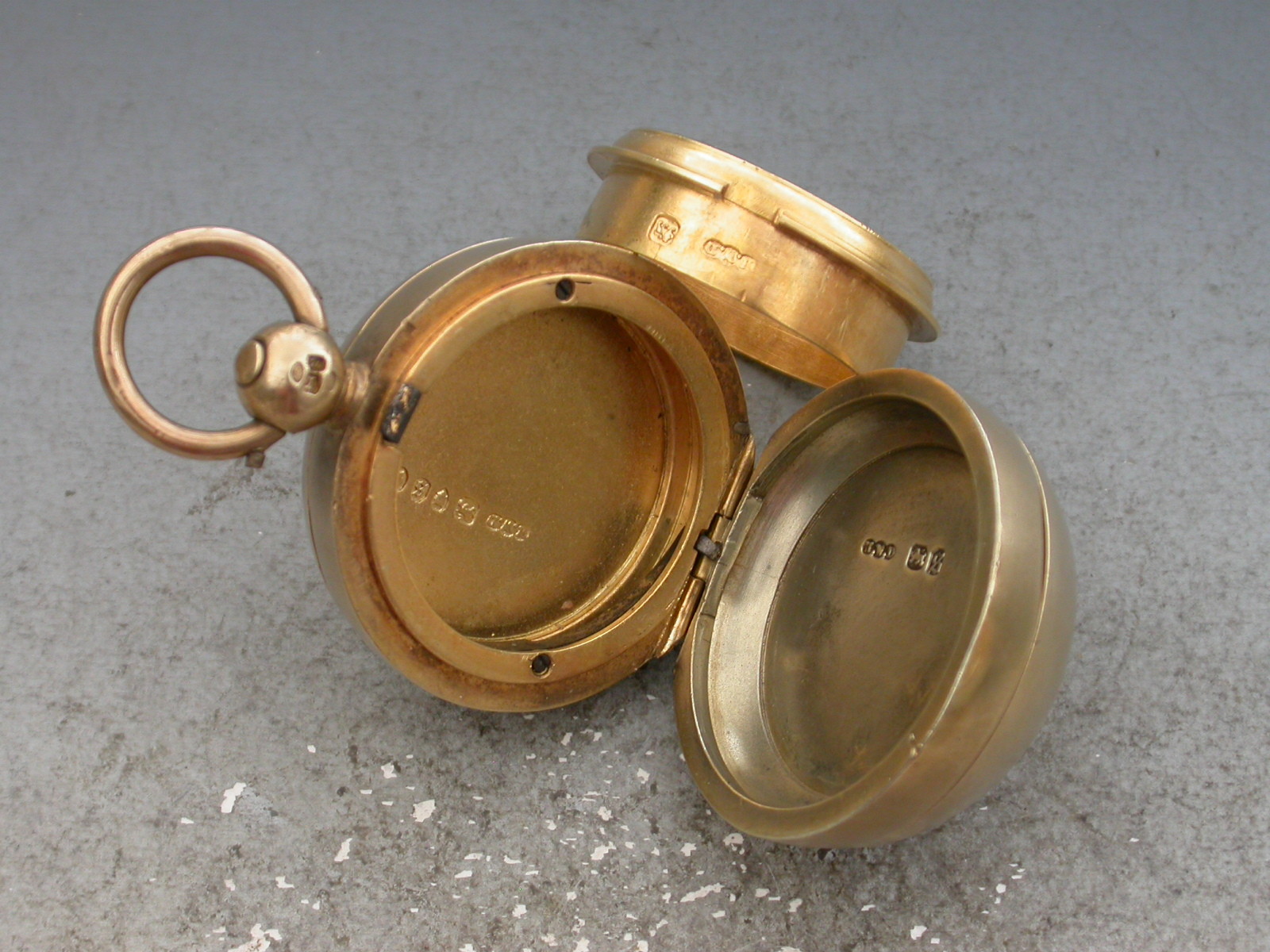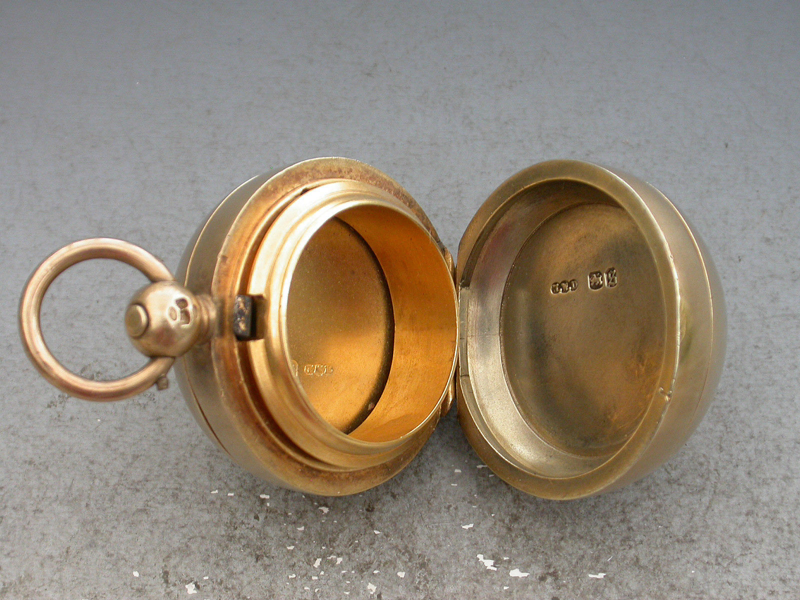 An extremely fine and rare Victorian silver gilt combination Vinaigrette, Compass, Coin Holder and Photo Frame, made in the form of a sphere, with attached suspension ring and push button opening mechanism to the central compartment, two other hinged compartments contain the Vinaigrette and the Compass whilst the central compartment houses the coin holder with removable sleeve.