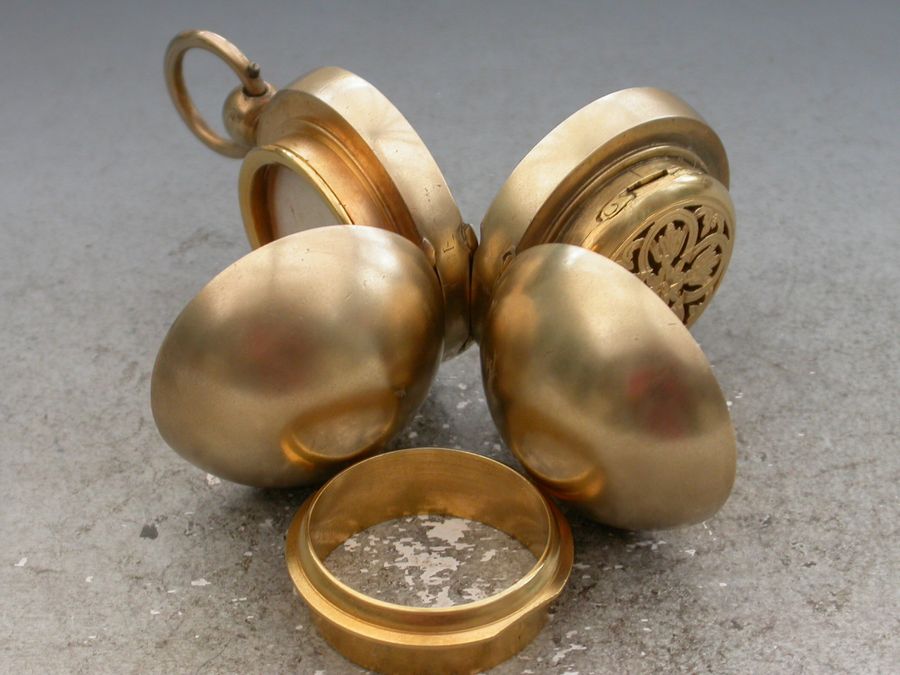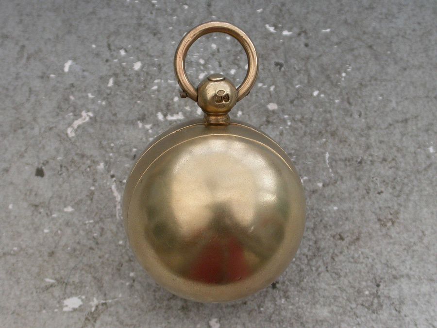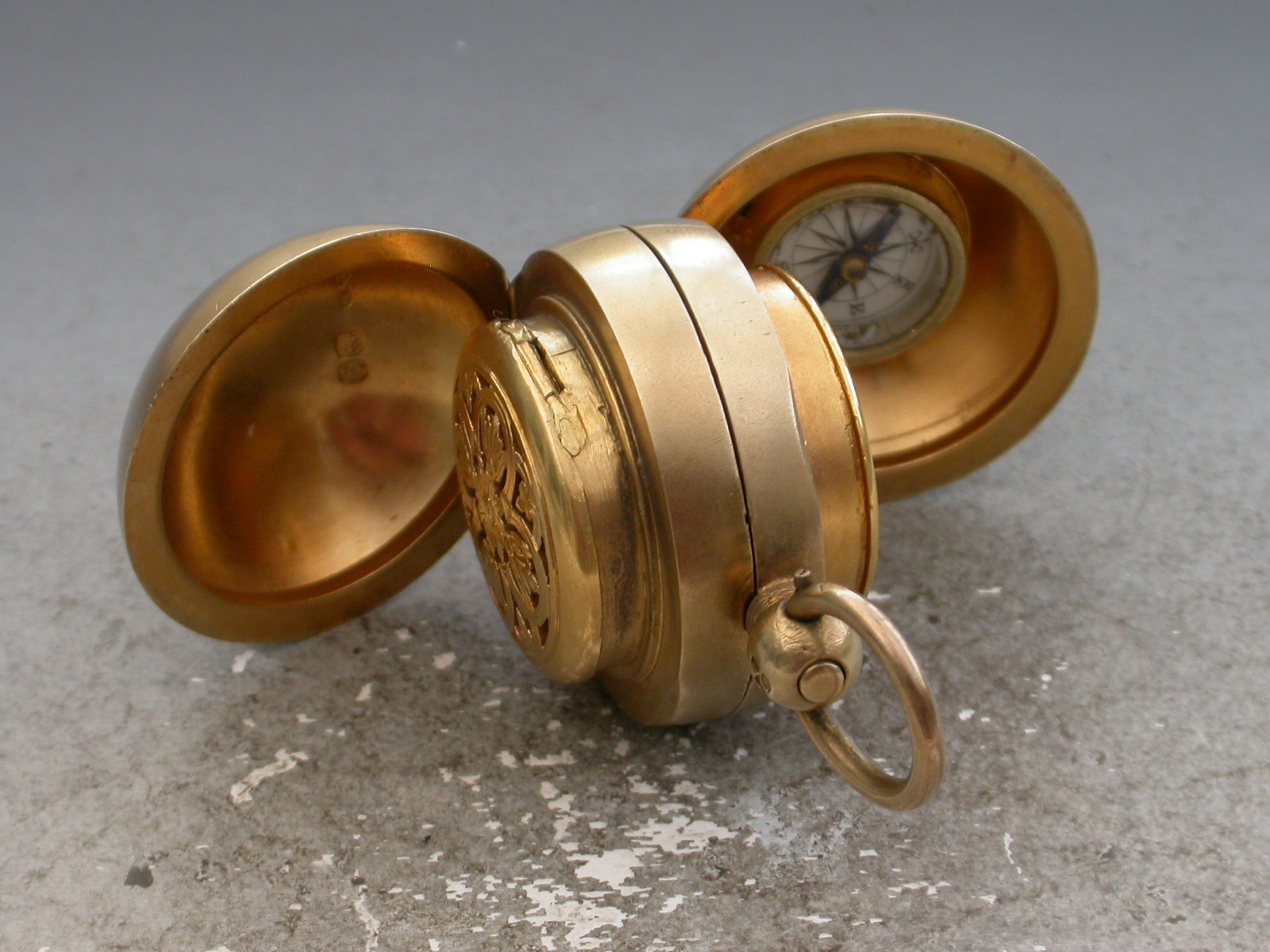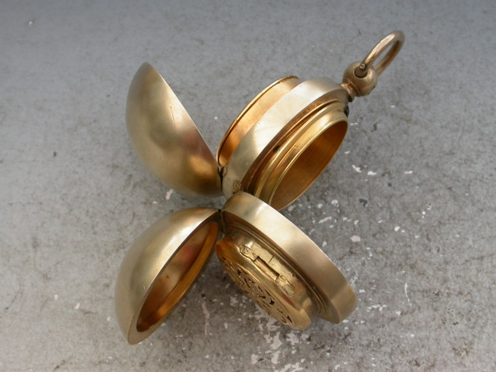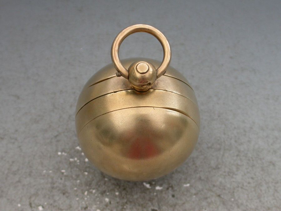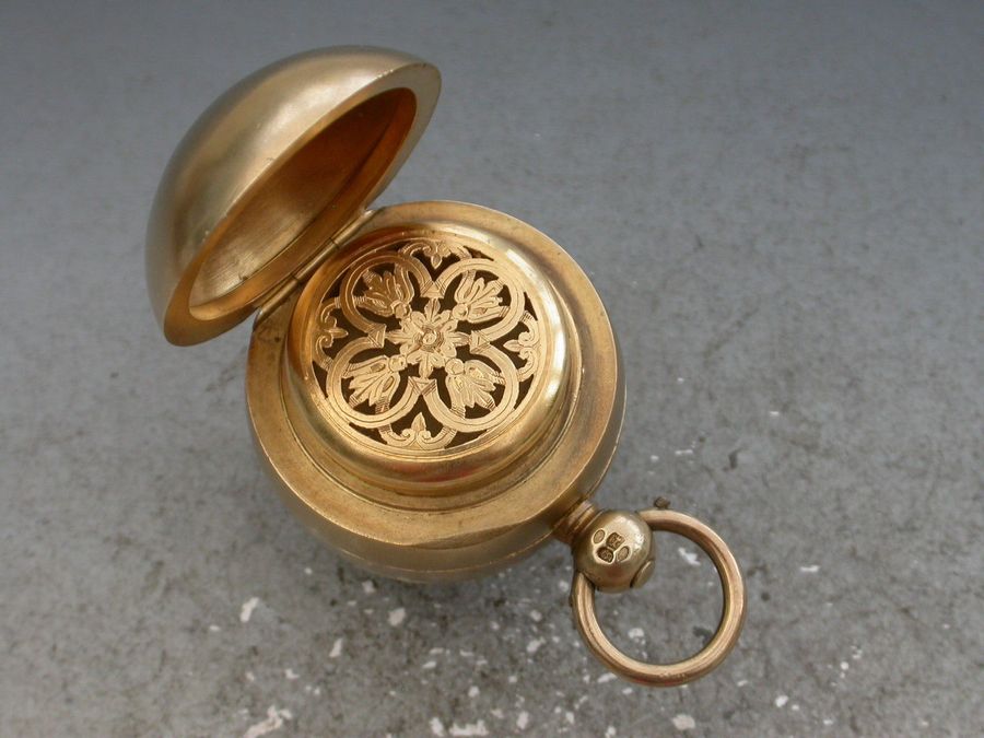 An extremely fine and rare Victorian silver gilt combination Vinaigrette, Compass, Coin Holder and Photo Frame, made in the form of a sphere, with attached suspension ring and push button opening mechanism to the central compartment, two other hinged compartments contain the Vinaigrette and the Compass whilst the central compartment houses the coin holder with removable sleeve.