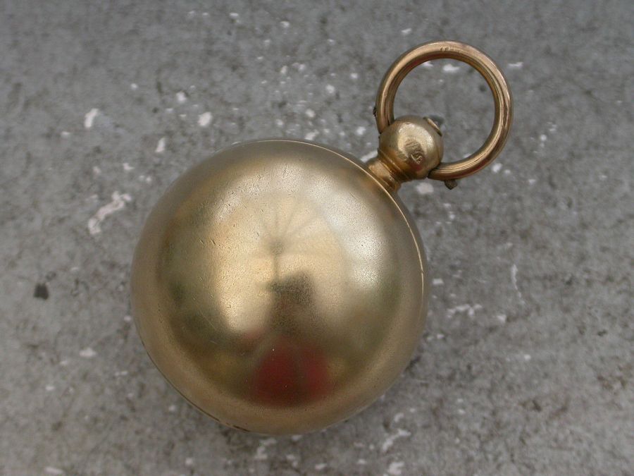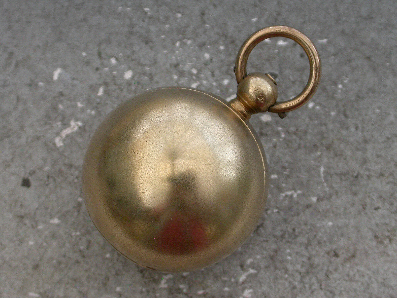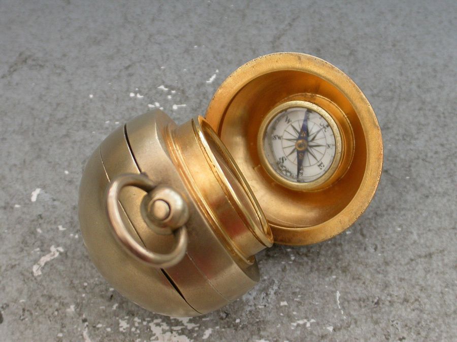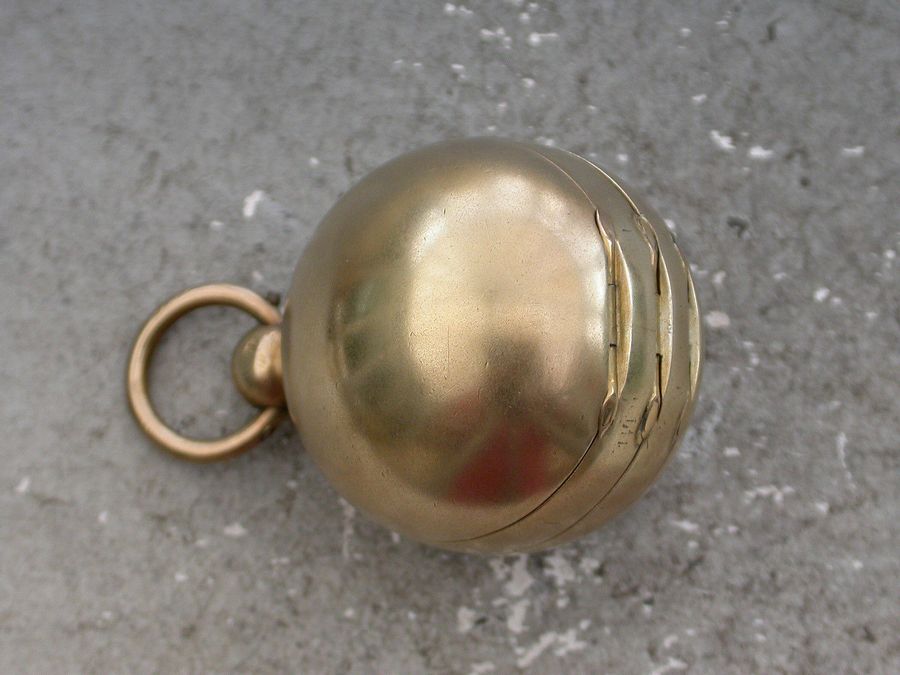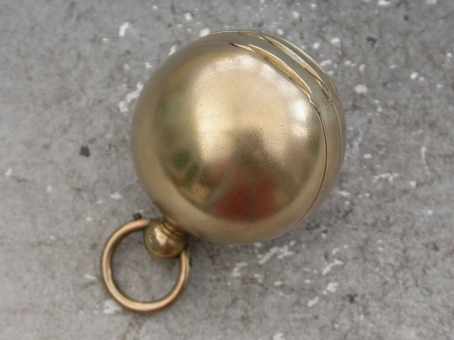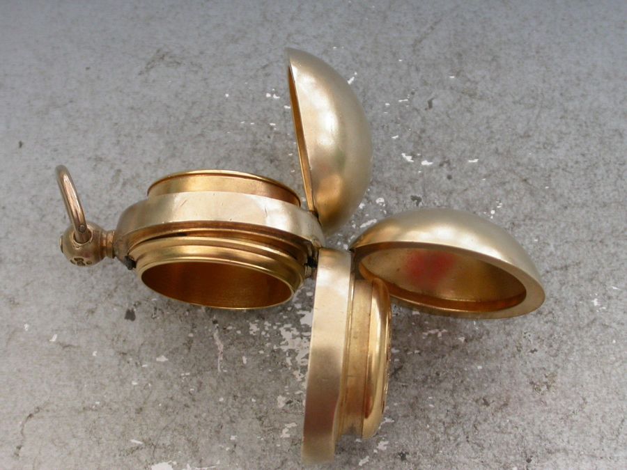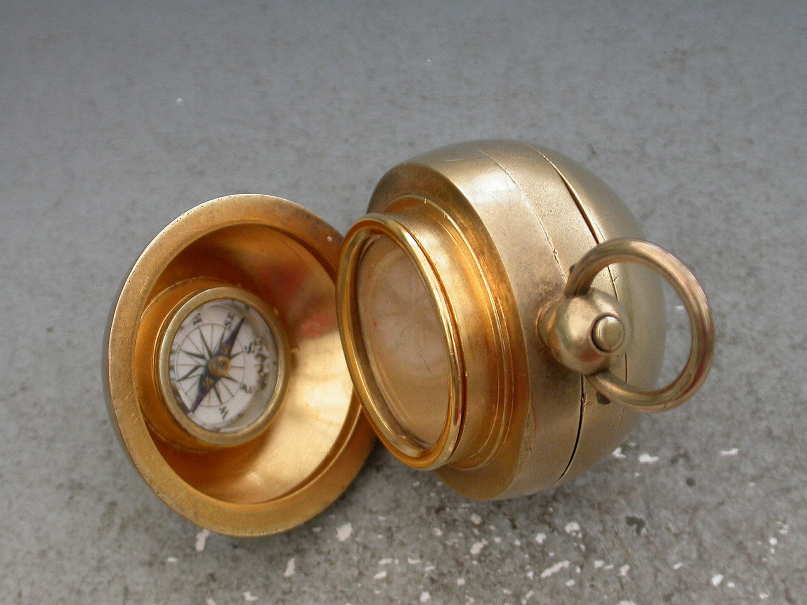 An extremely fine and rare Victorian silver gilt combination Vinaigrette, Compass, Coin Holder and Photo Frame, made in the form of a sphere, with attached suspension ring and push button opening mechanism to the central compartment, two other hinged compartments contain the Vinaigrette and the Compass whilst the central compartment houses the coin holder with removable sleeve.