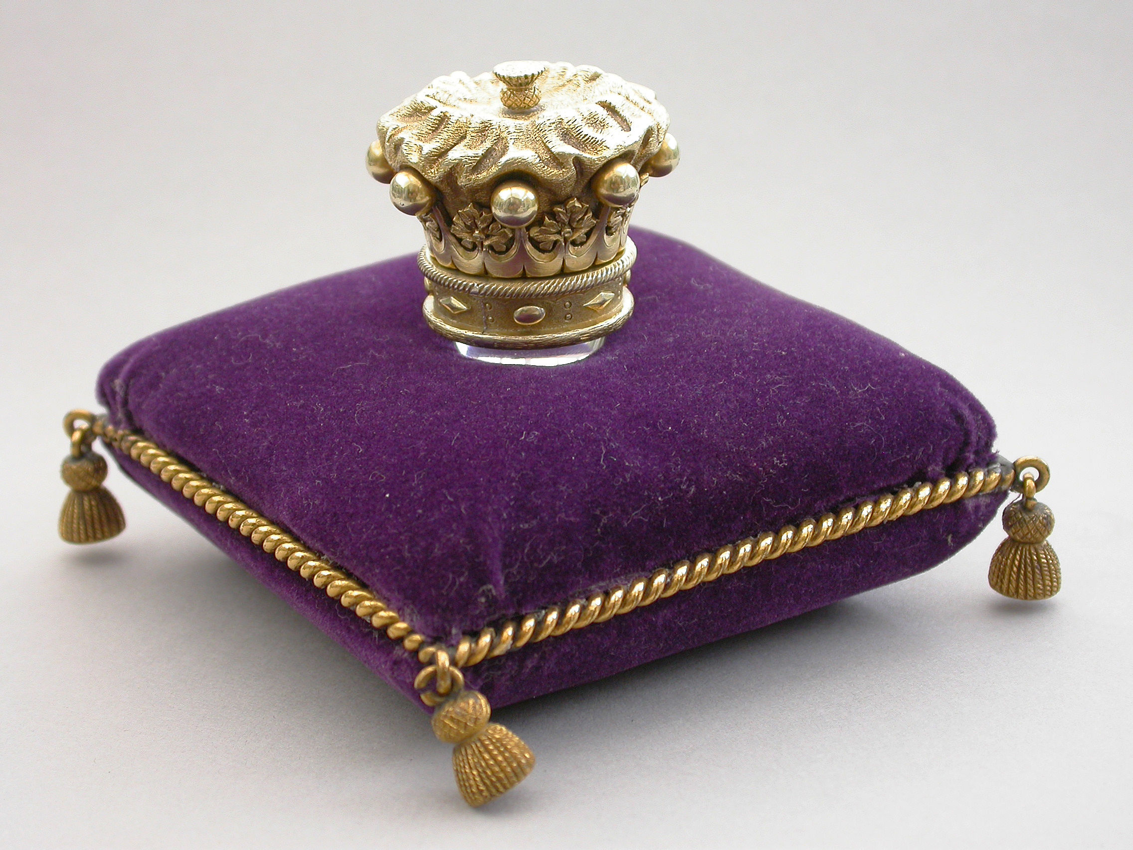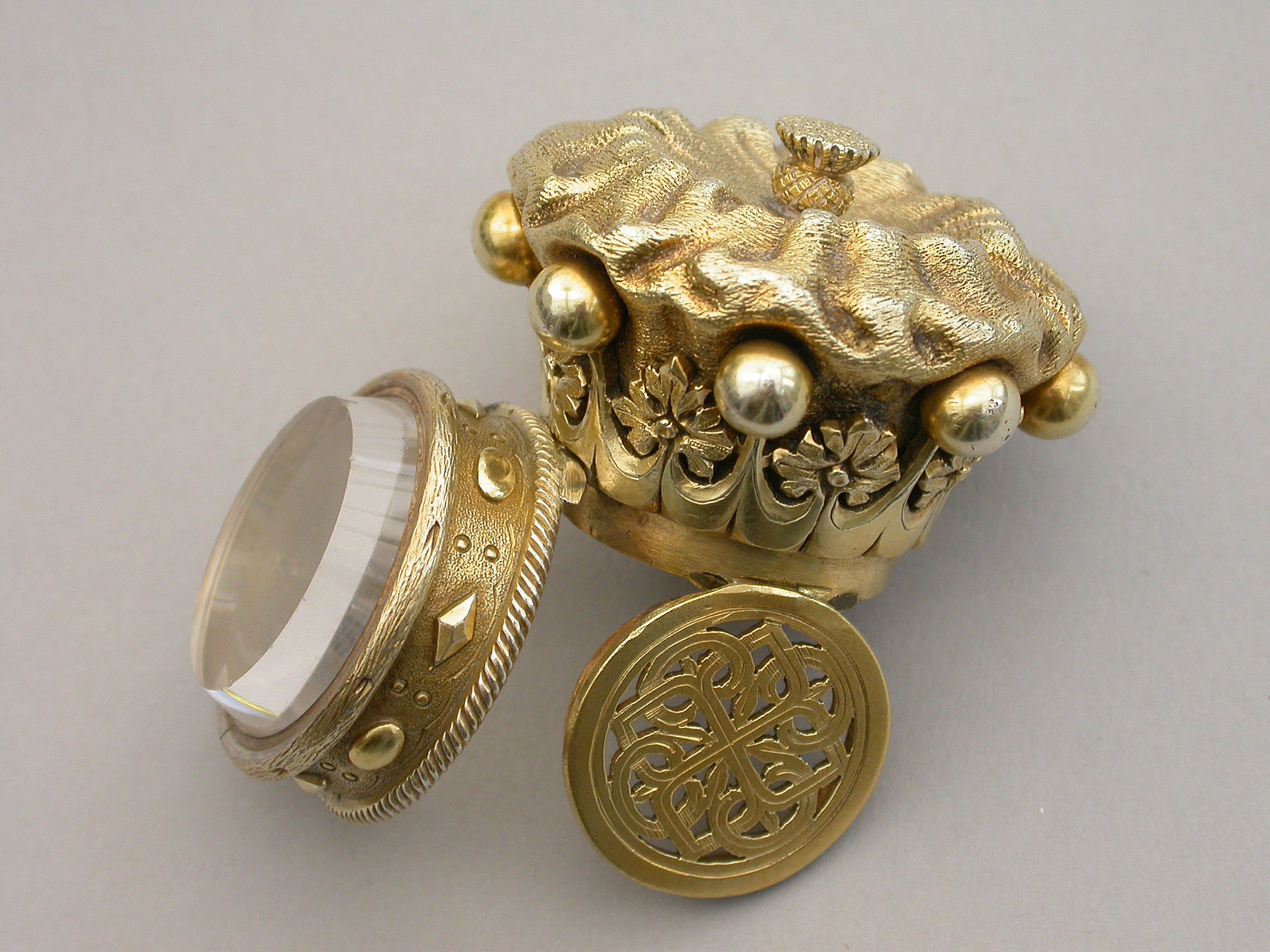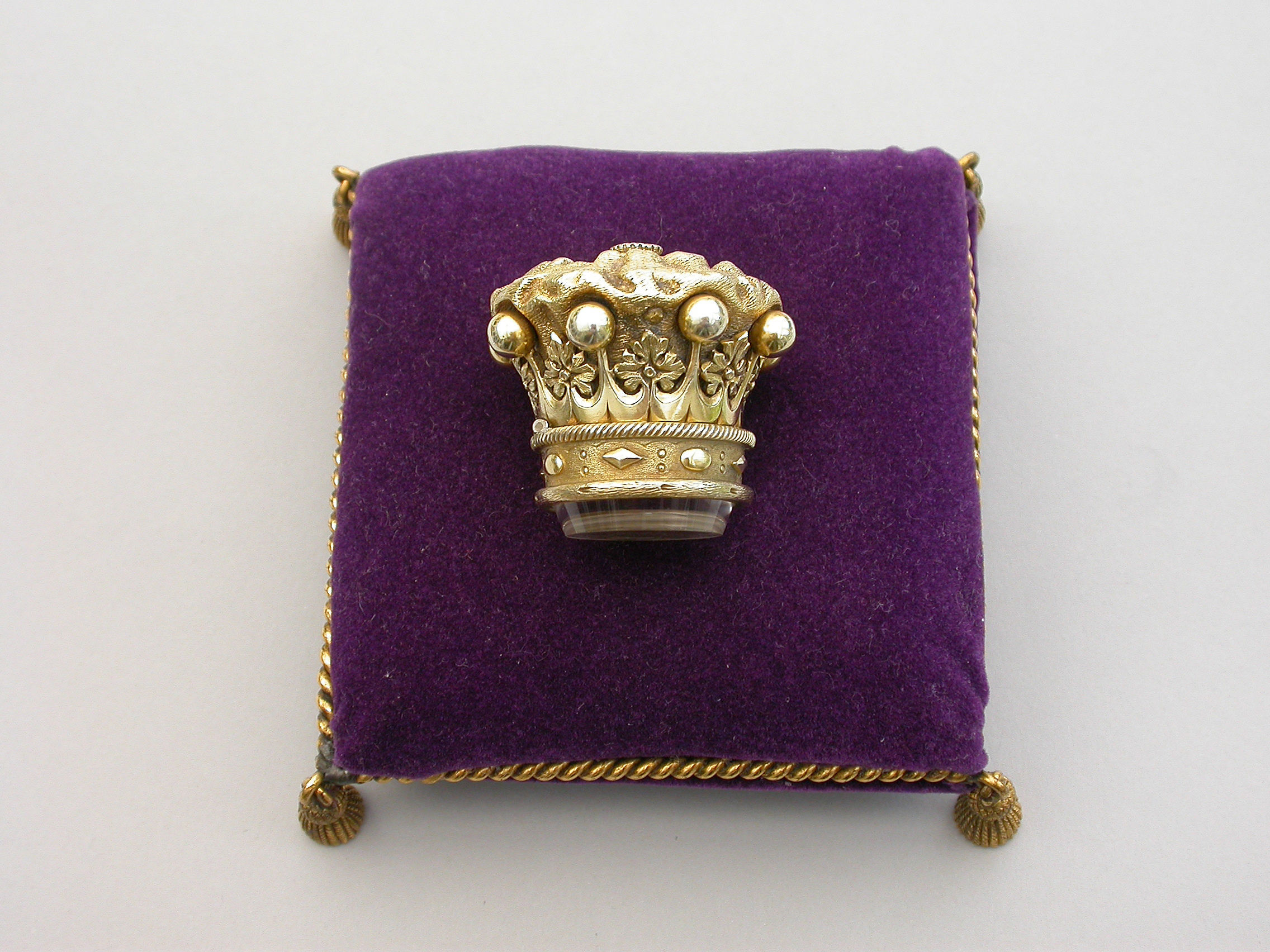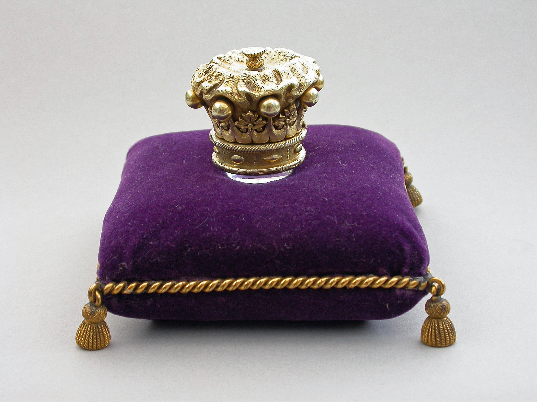 A fine quality Victorian novelty silver gilt Vinaigrette cast as an Earl's Coronet, hinging to reveal a pierced geometric design grille visible through a beveled crystal base. Sitting on its own purple velvet display cushion with gilt cording and a tassel to each corner.