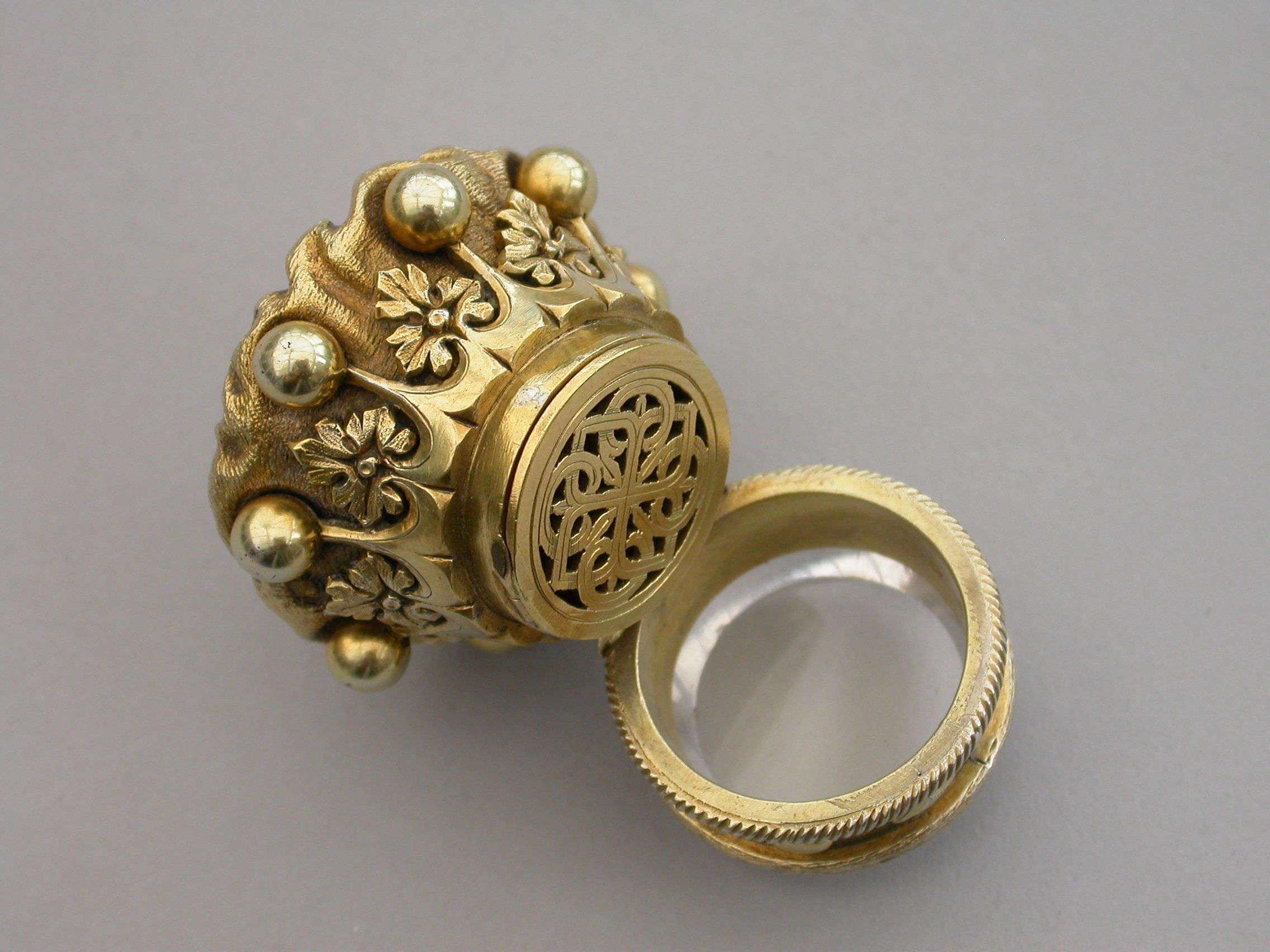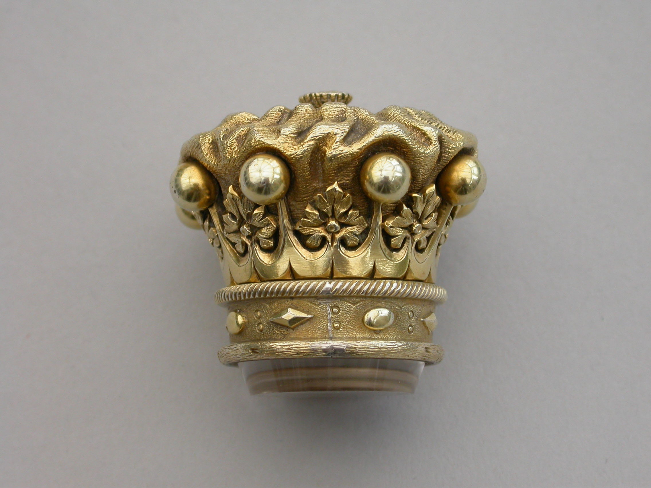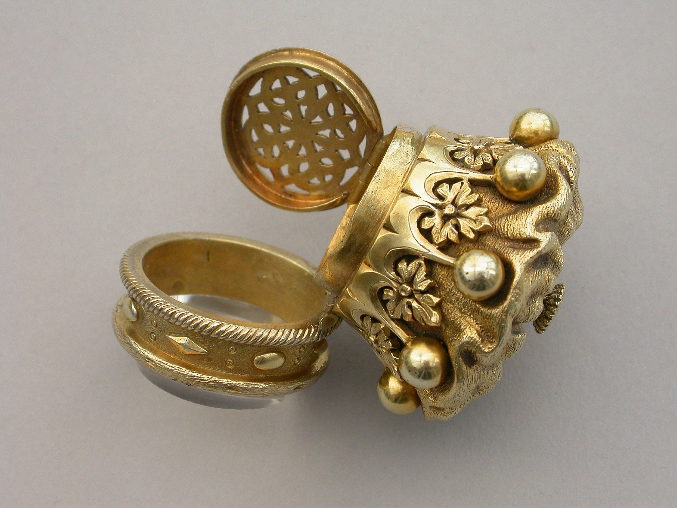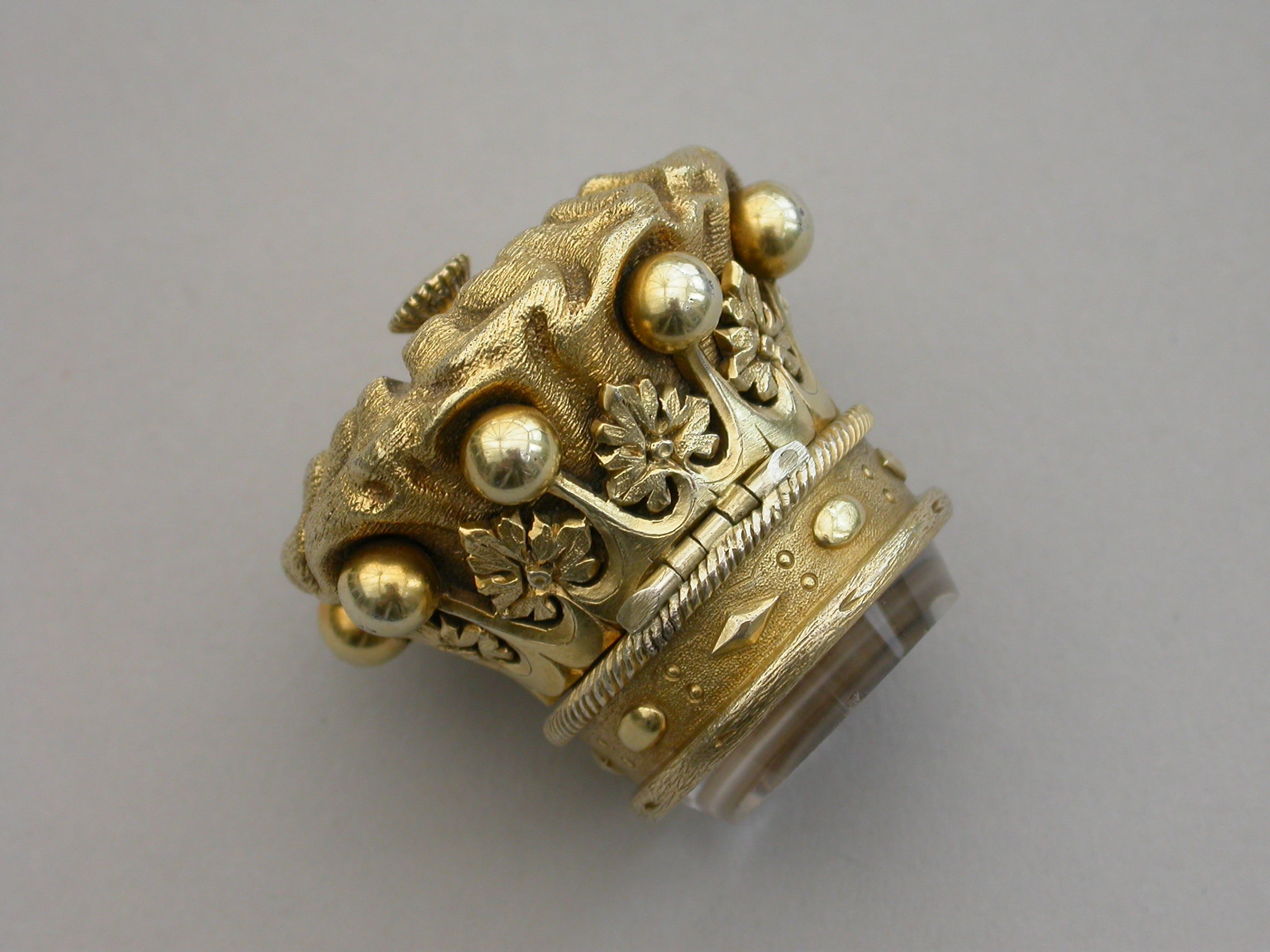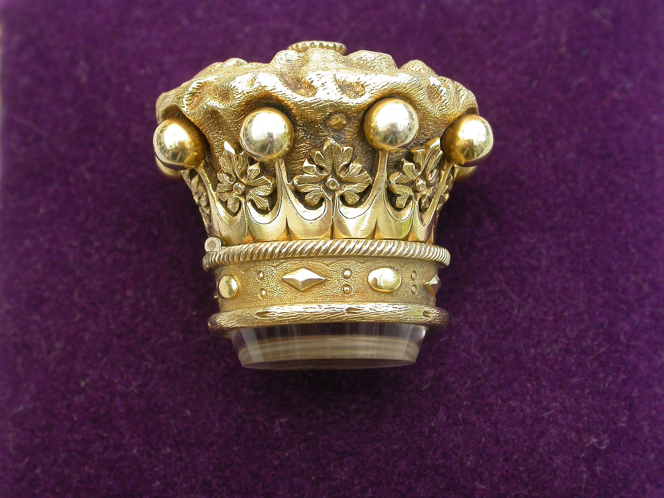 A fine quality Victorian novelty silver gilt Vinaigrette cast as an Earl's Coronet, hinging to reveal a pierced geometric design grille visible through a beveled crystal base. Sitting on its own purple velvet display cushion with gilt cording and a tassel to each corner.