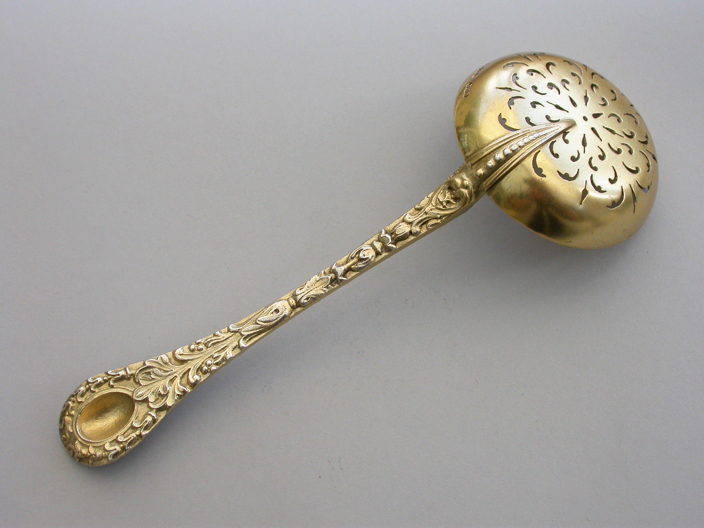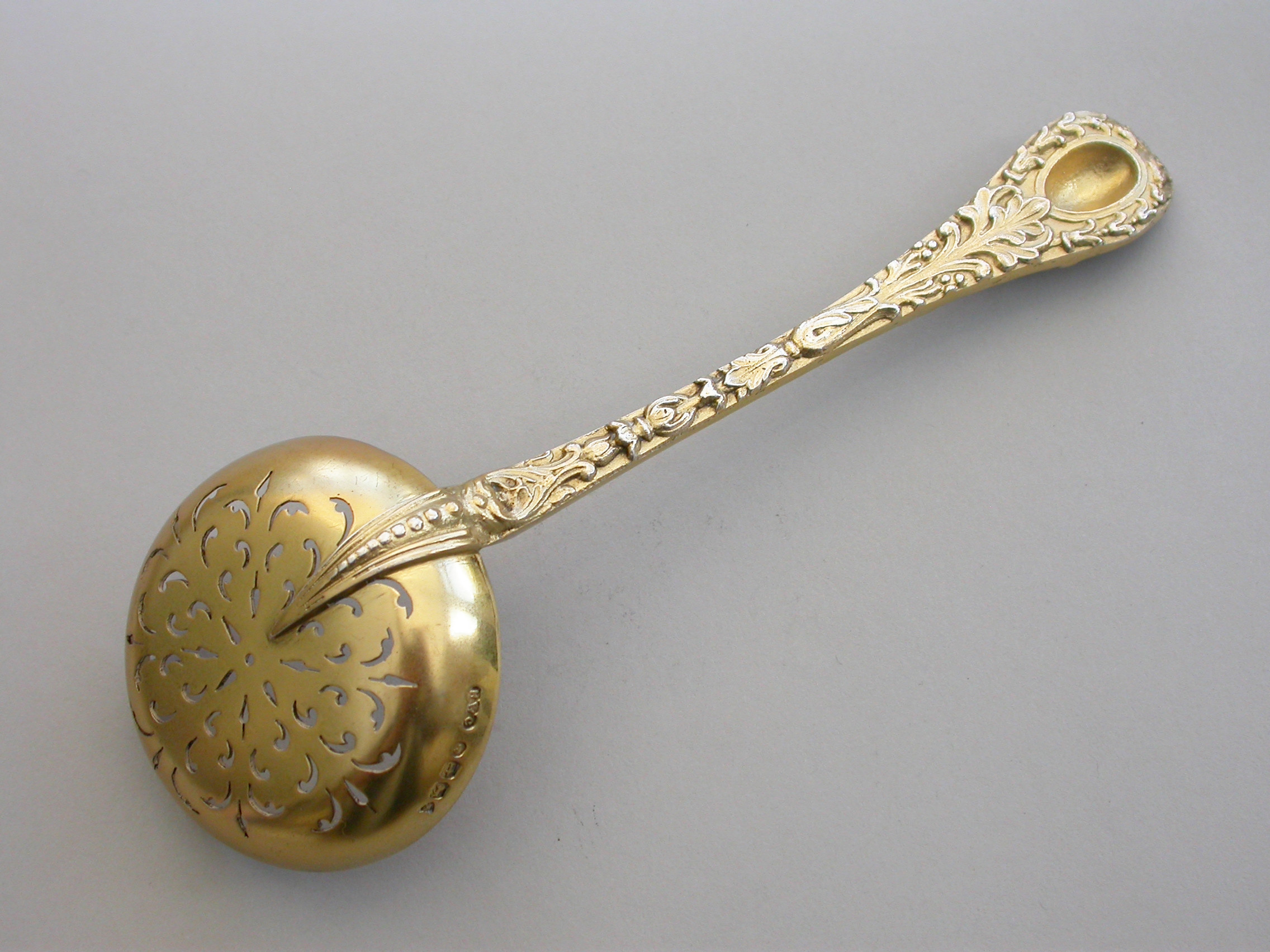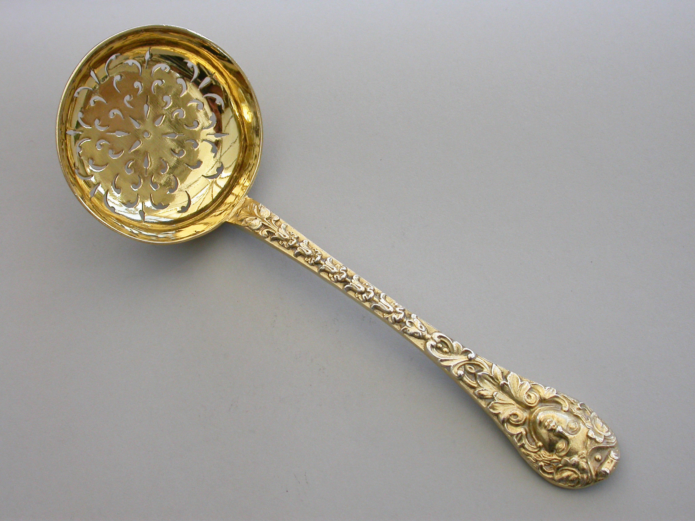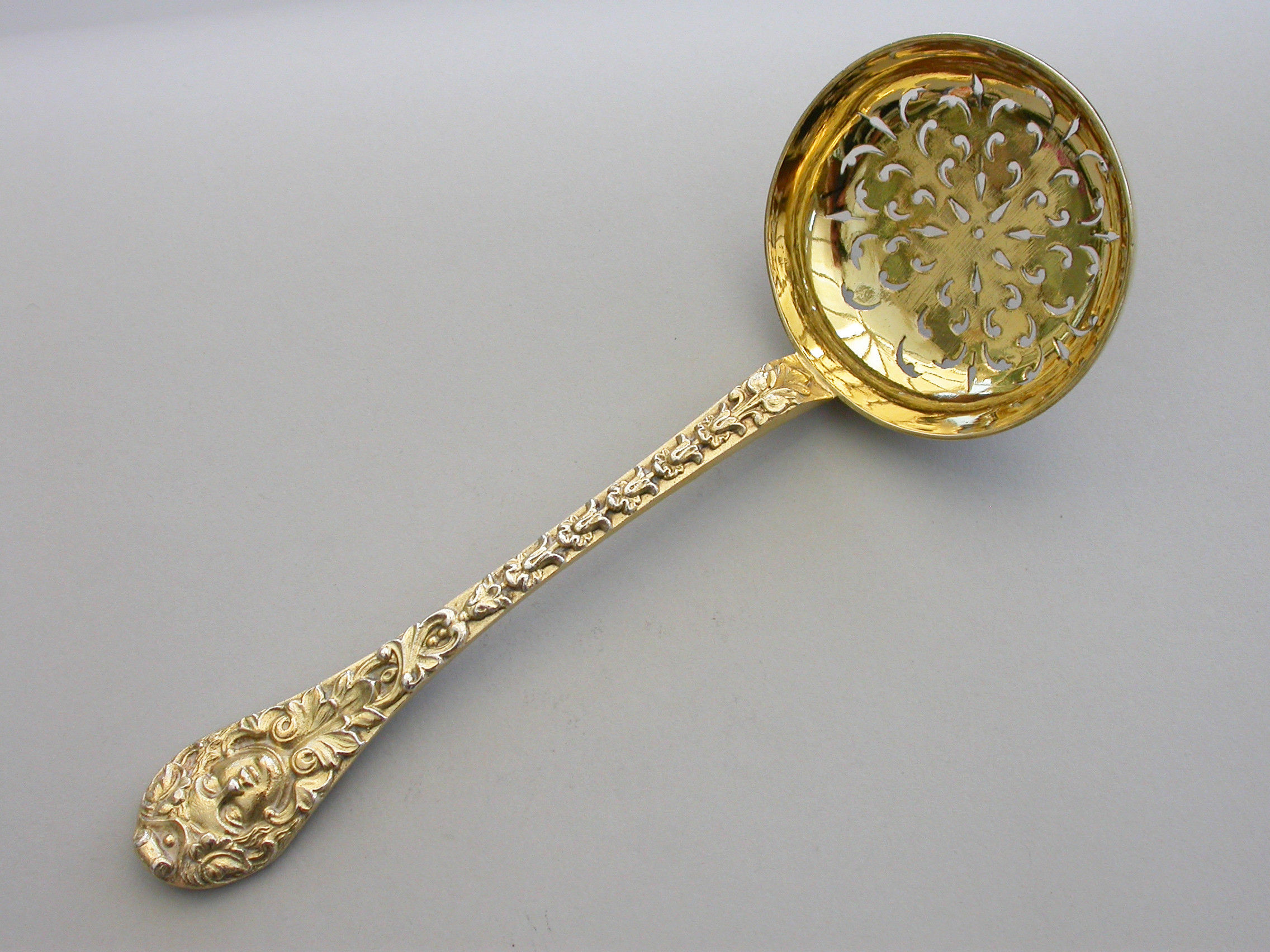 A very fine quality Victorian cast silver gilt Sugar Sifter Ladle with plain circular pierced bowl, the heavy gauge handle chased with harebell flowerheads and leaves, a female mask head terminal with oval concave back.